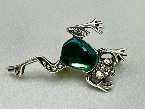 Silver frog brooch with green chalcedony c1900