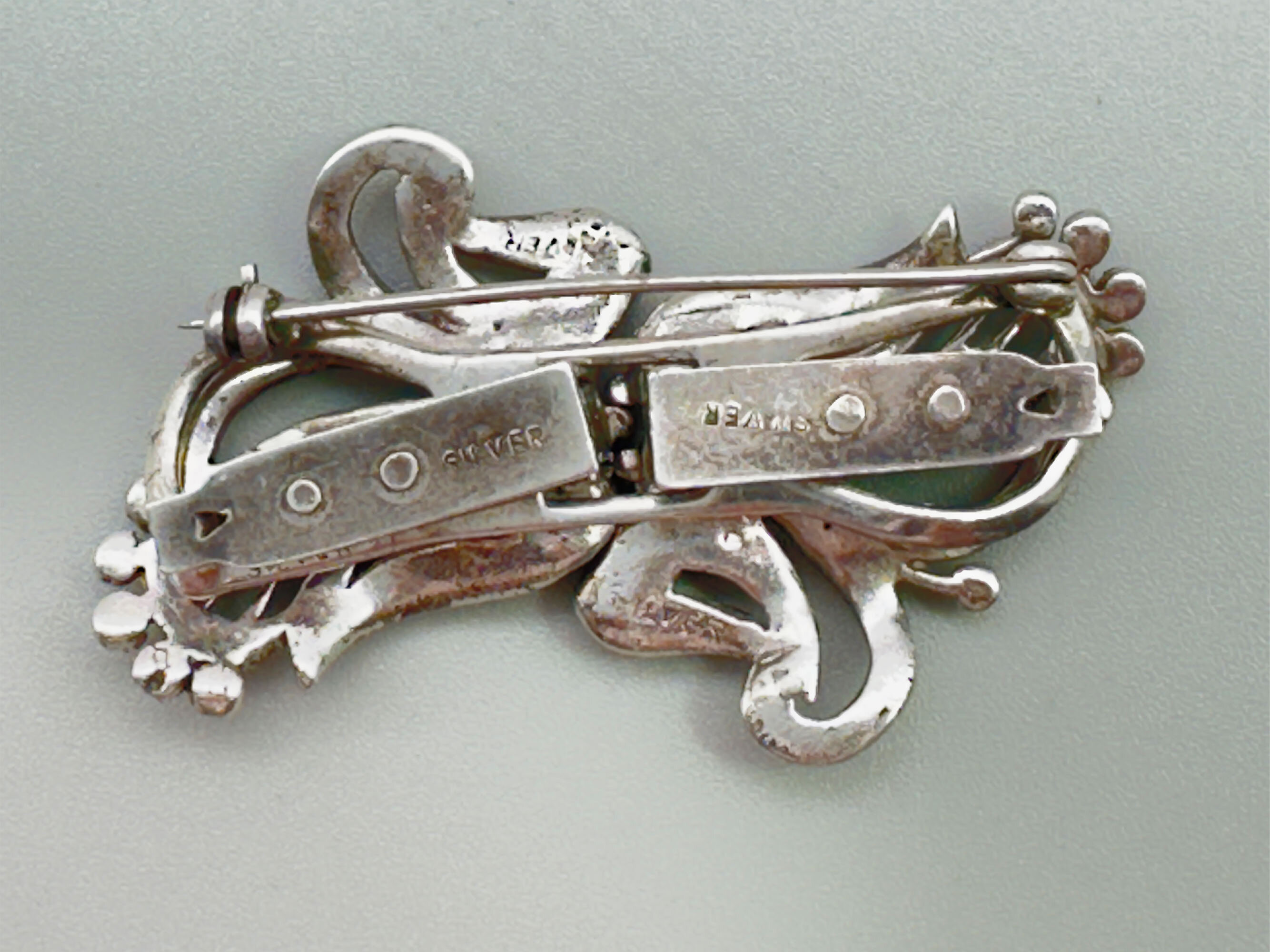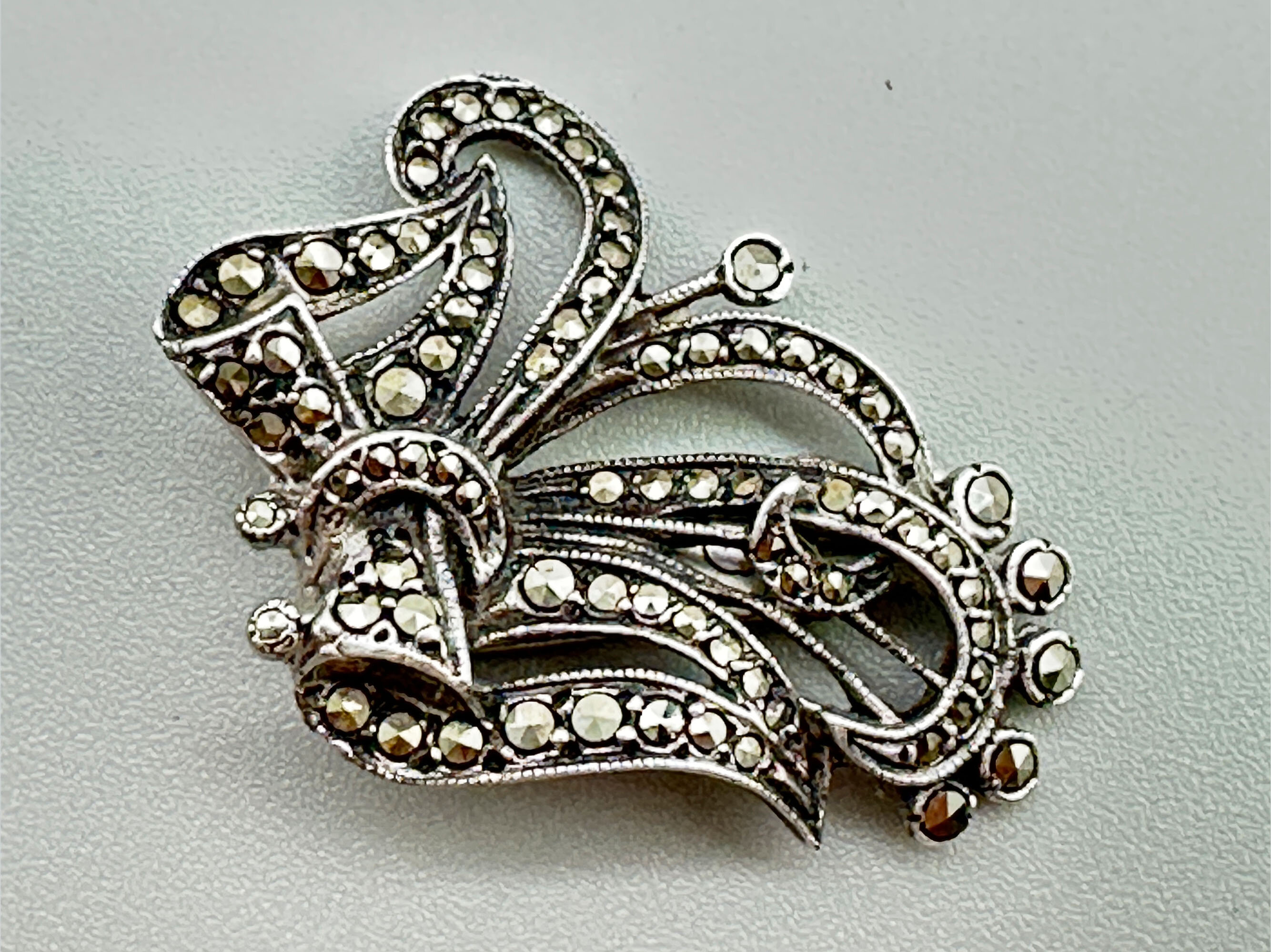 This is a wonderful example of these types of brooches. It is silver and is set with very high quality marchasit stones. It is marked silver on both the piece and the clips.| Size: | 53 x 29 mm |