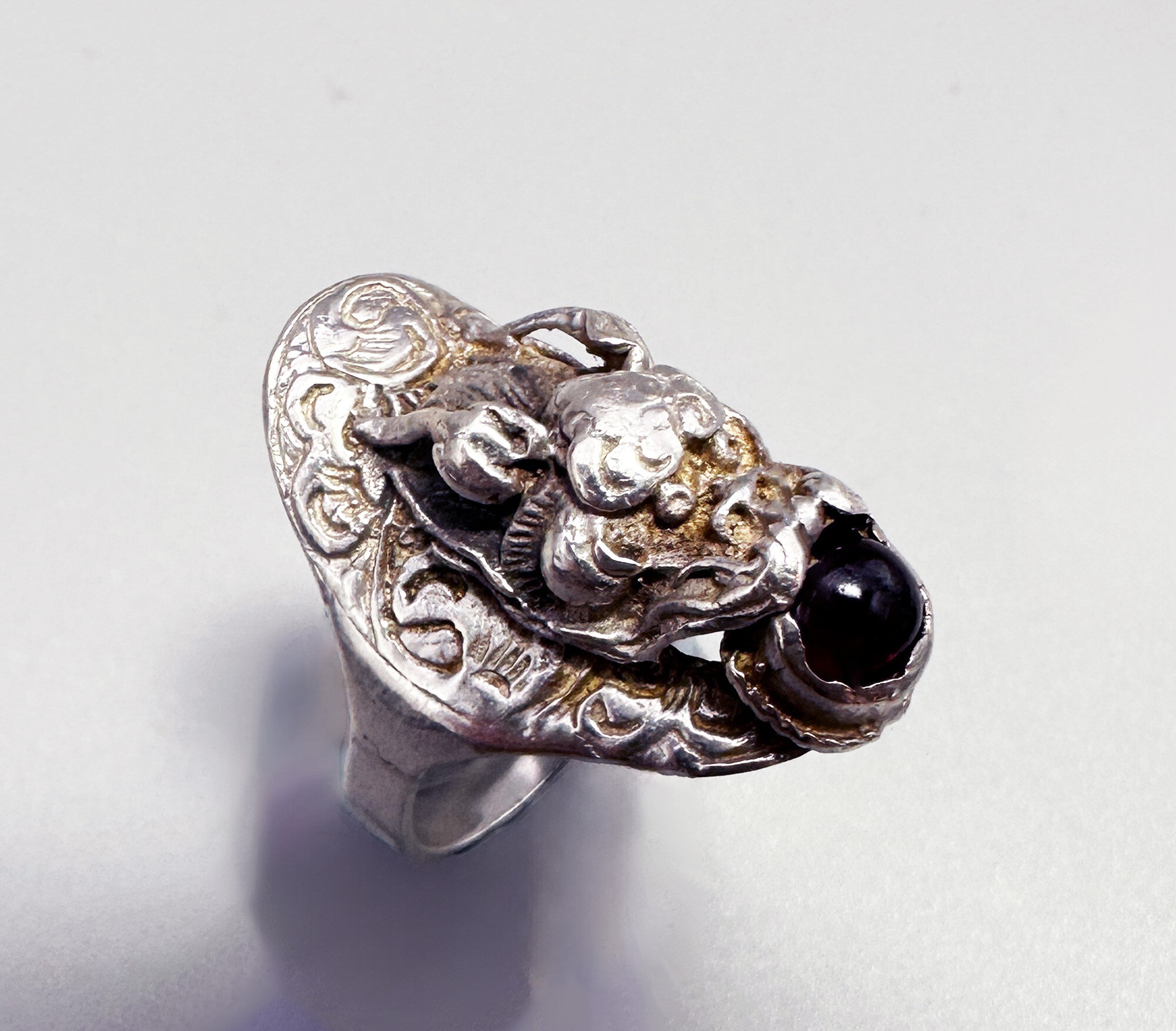 This is a very unusual ring. It depicts a very detailed dragon head with his mouth open eating a garnet stone apparently. It is set with a bezel set garnet. The shank has been restored and the stone has been replaced. It is unmarked.| Size: | Setting is 26.9 x 17 mm size is UK R US 9 |