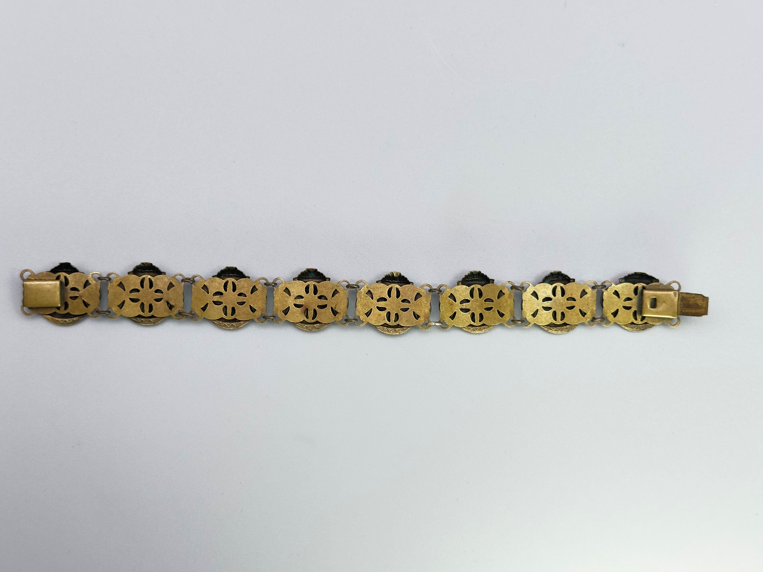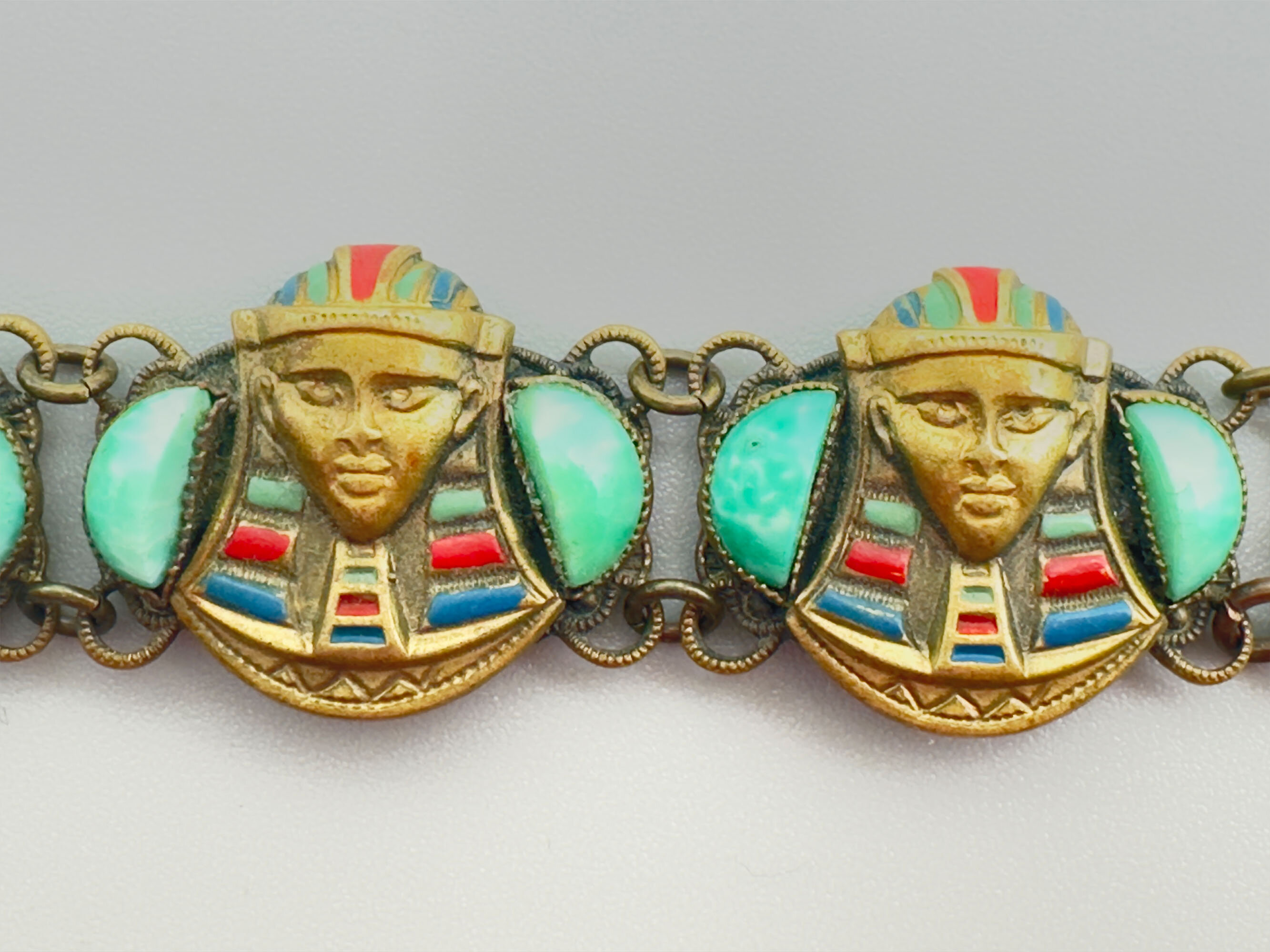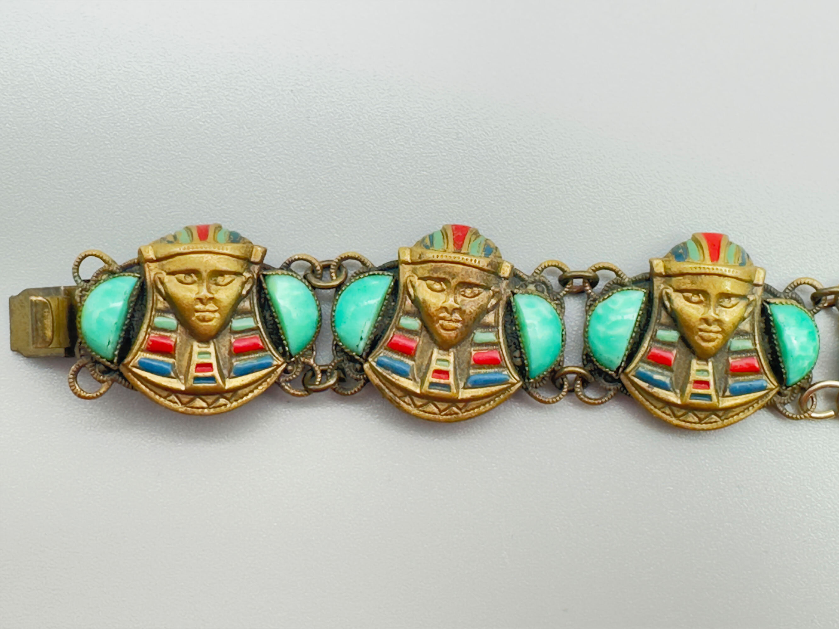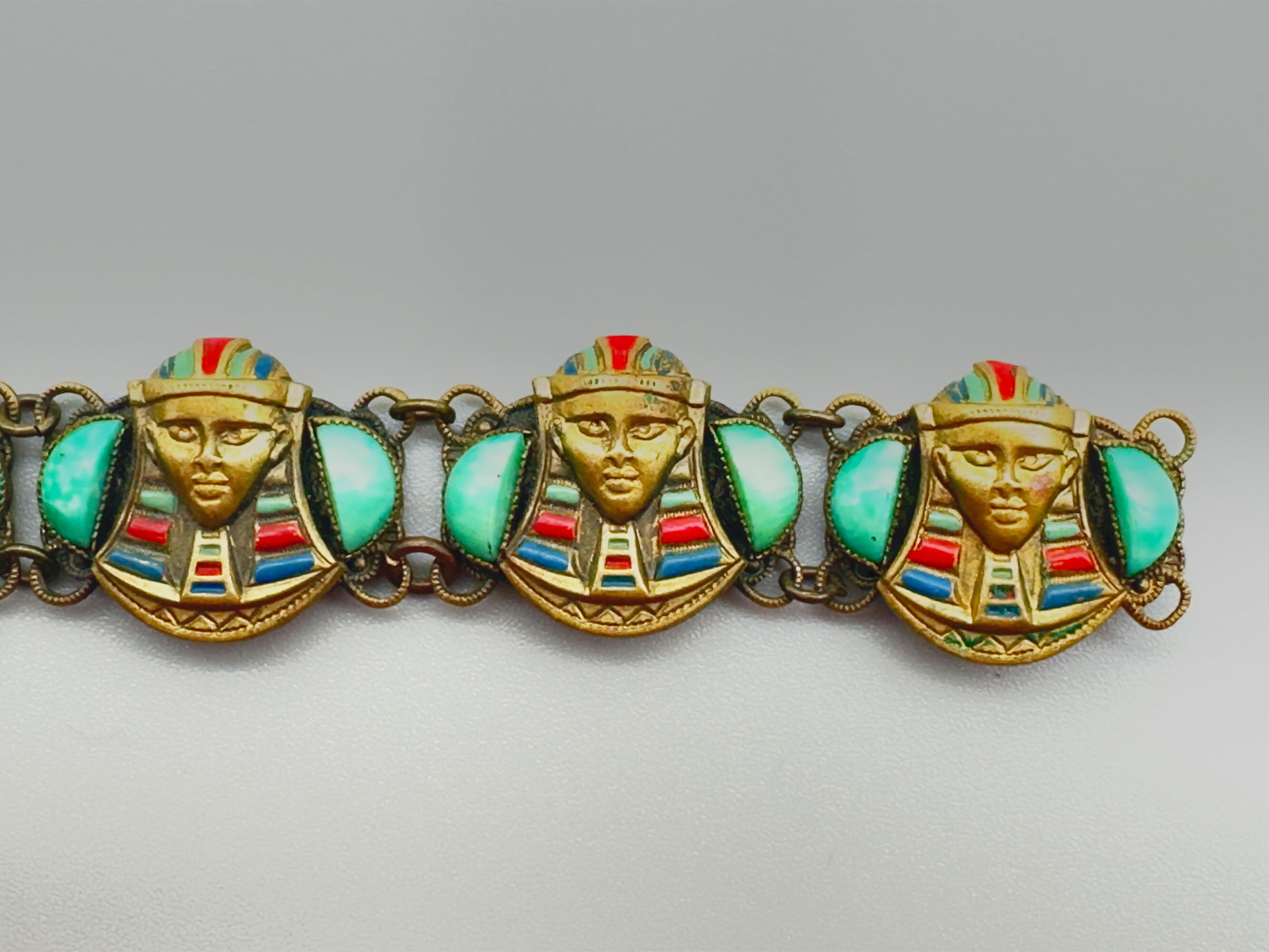 This is a very rare bracelet that is by the Neiger Brothers, the well known and collected pre war costume jewellery maker. These two brothers created the most iconic designs combining their proprietary glass elements with cast brass and enamel. Jewellery made by Neiger is instantly recognizable and this bracelet is an excellent example. It comprises eight stations depicing Tutankhamun flanked by two half moon peking glass stones.| Size: | Width 18 mm Lenth 18 cm |