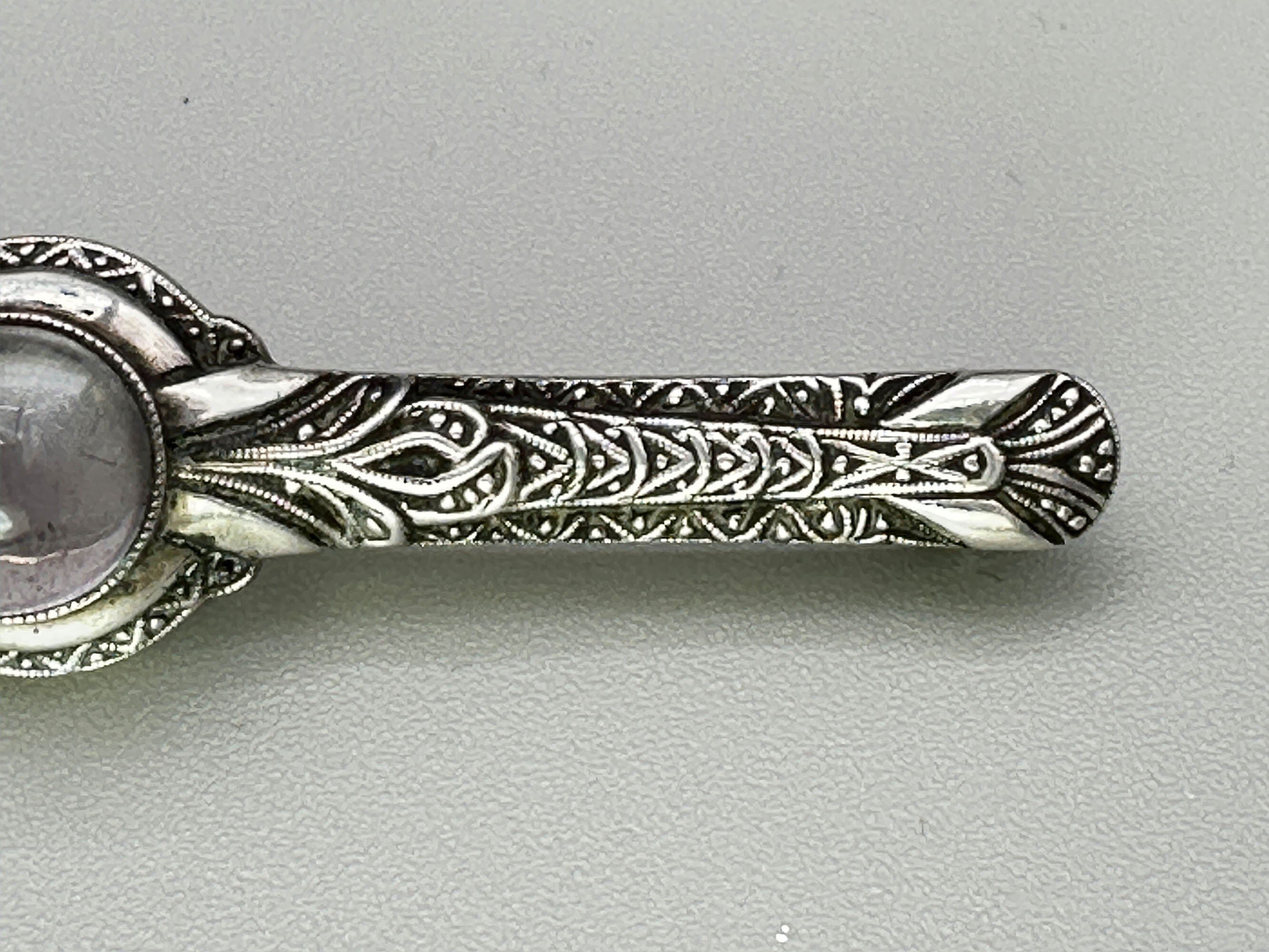 This is a very elegant bar brooch that has finely detailed silver work that exhibits both Art Deco and Islamic design. It is set with a bluish moonstone cabochon. It is marked 835 so most likely Austrian.| Size: | Length 66.4 mm Width 13.5 mm |