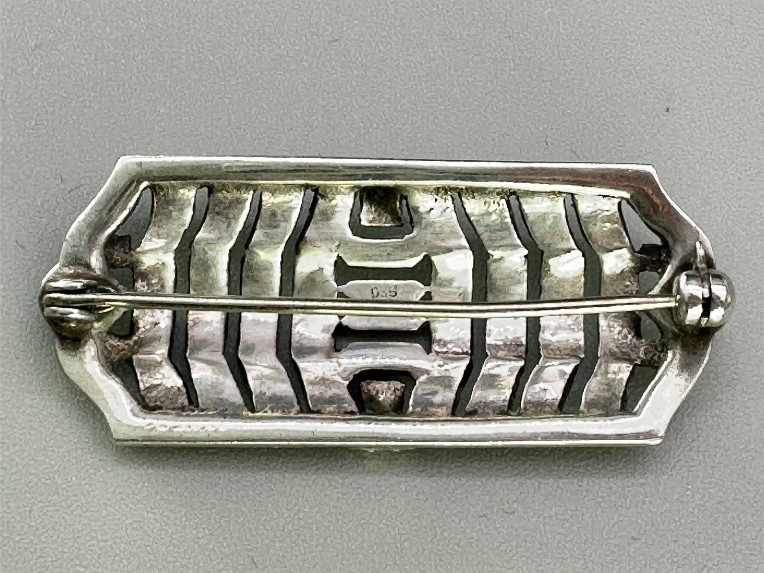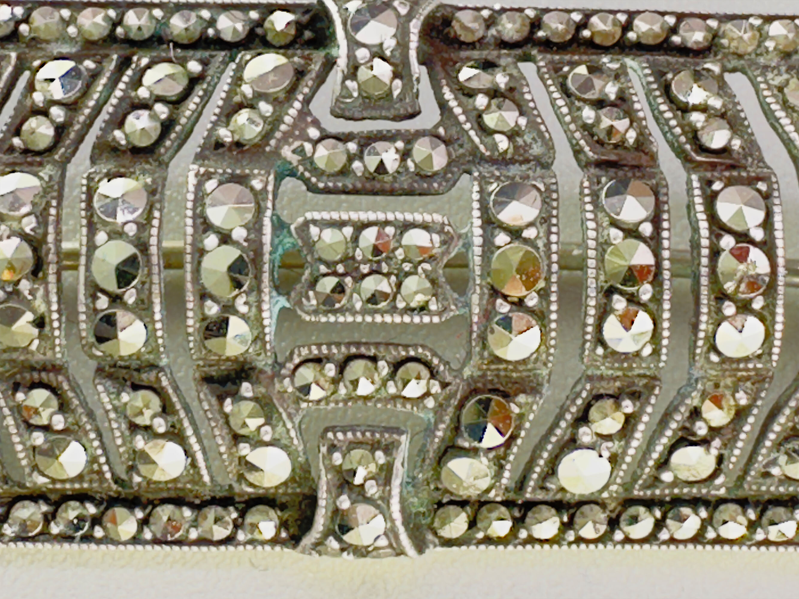 This is an excellent example of Art Deco with its geometric shape and elegant balance. It is silver with marcasite stones. It is marked 935 for French silver.| Size: | Height 17.9 mm Width 43 mm |