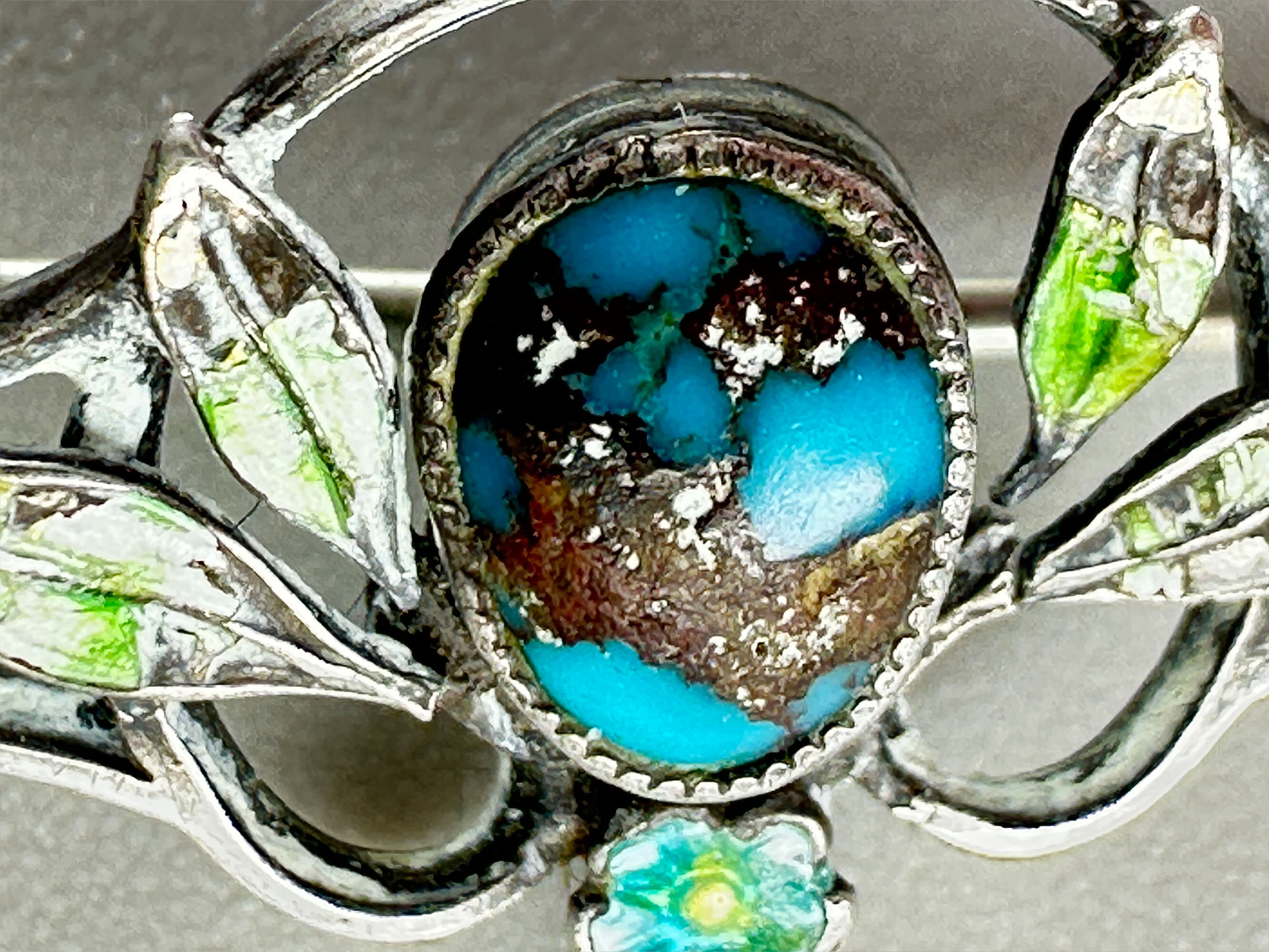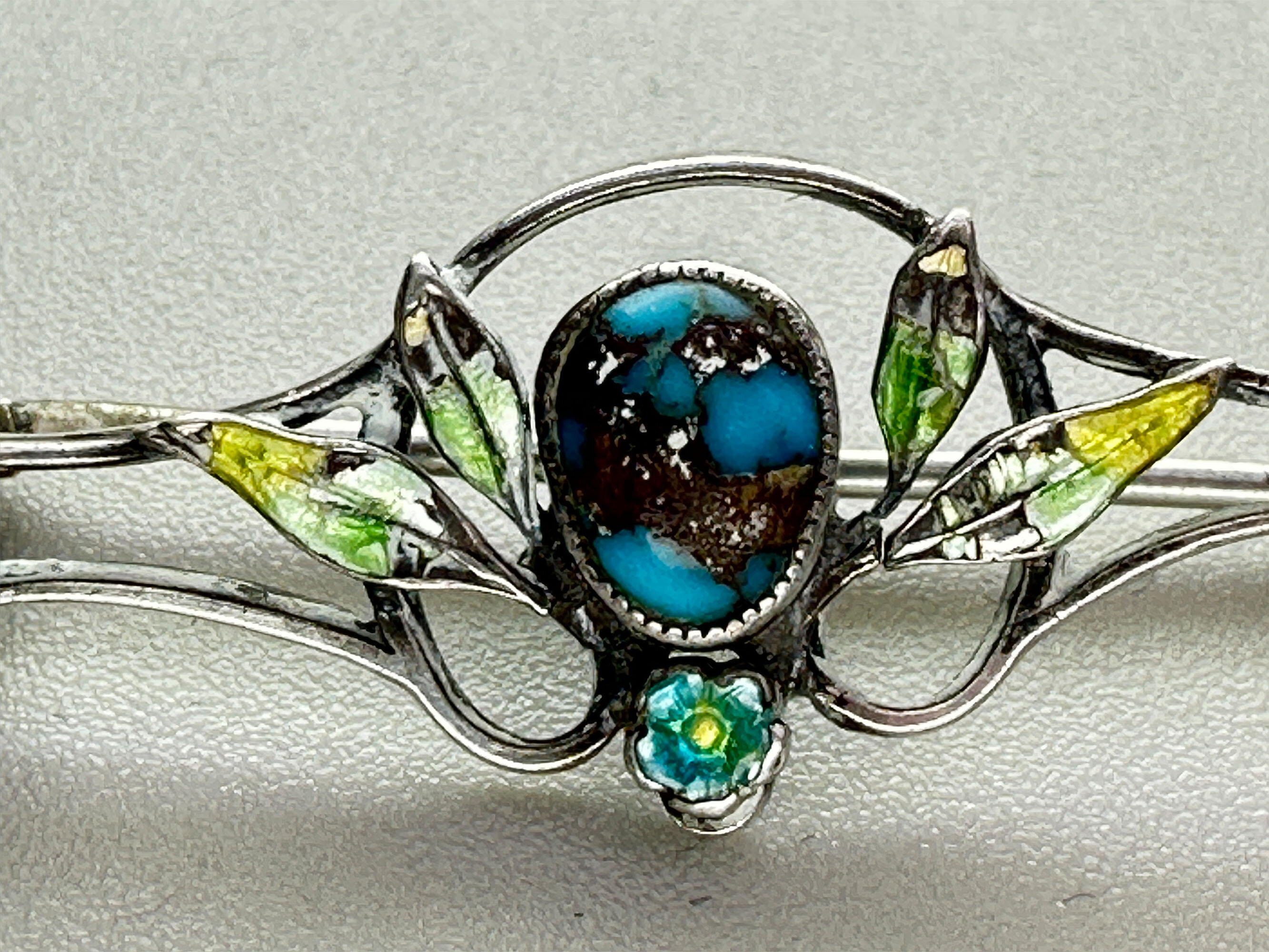 This is a very interesting brooch with a matrix turquoise stone in a silver setting. It is in the distinctive Arts and Crafts style with enamel flowers and leaves and is marked 'STERLING' indicating American manufacture.| Size: | Width 41.1 mm Height 12.1 mm |
