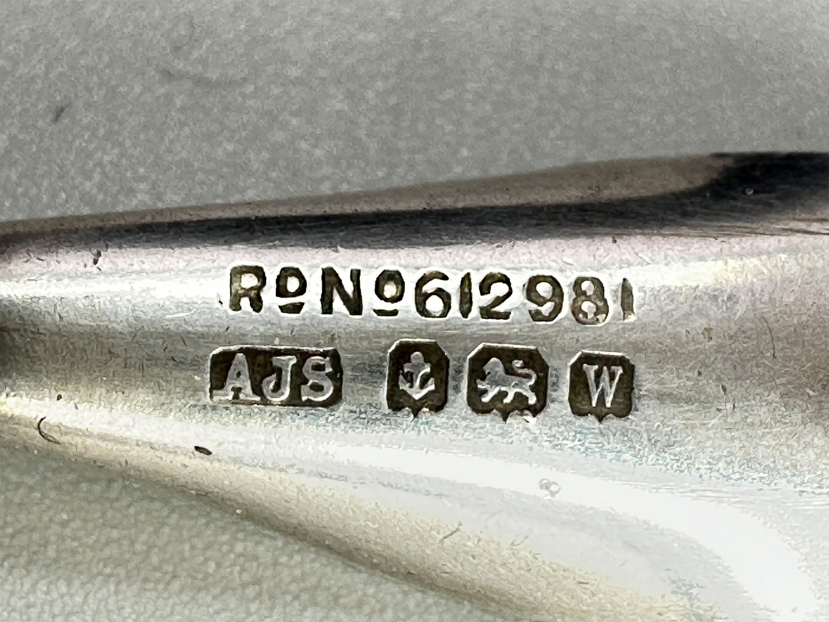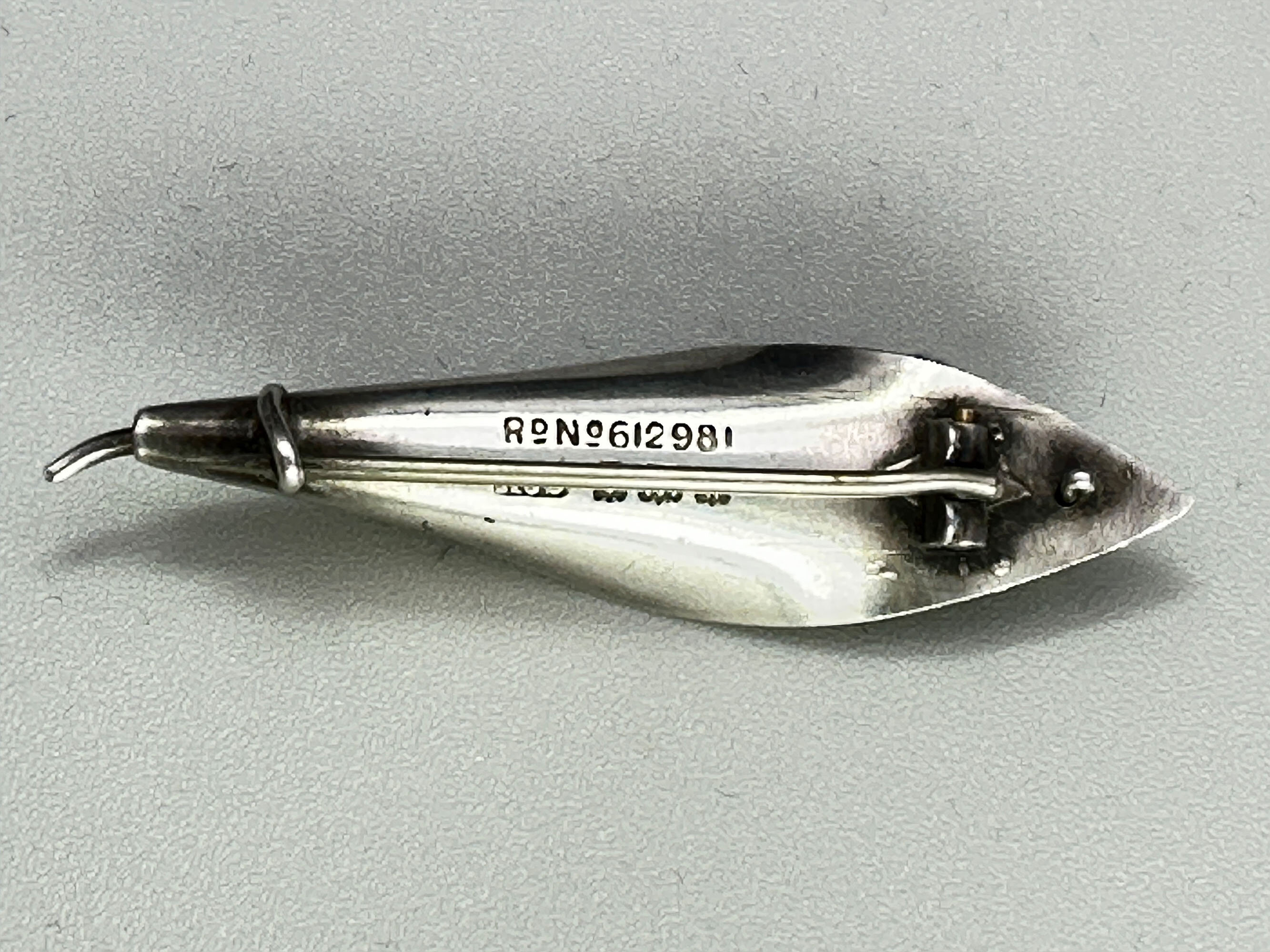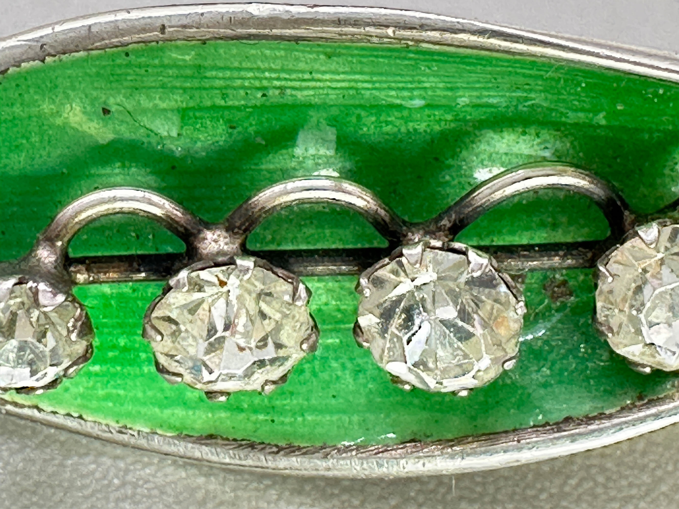 This is a very unusual brooch that is the form of a peapod with peas that are paste stones. The pod is silver with green enamel. It has full English hallmarks for Birmingham 1946 with a makers mark AJS. It also has the Copyright registration Nr 612981 for the design.| Size: | Width 55 mm Height 21 mm |