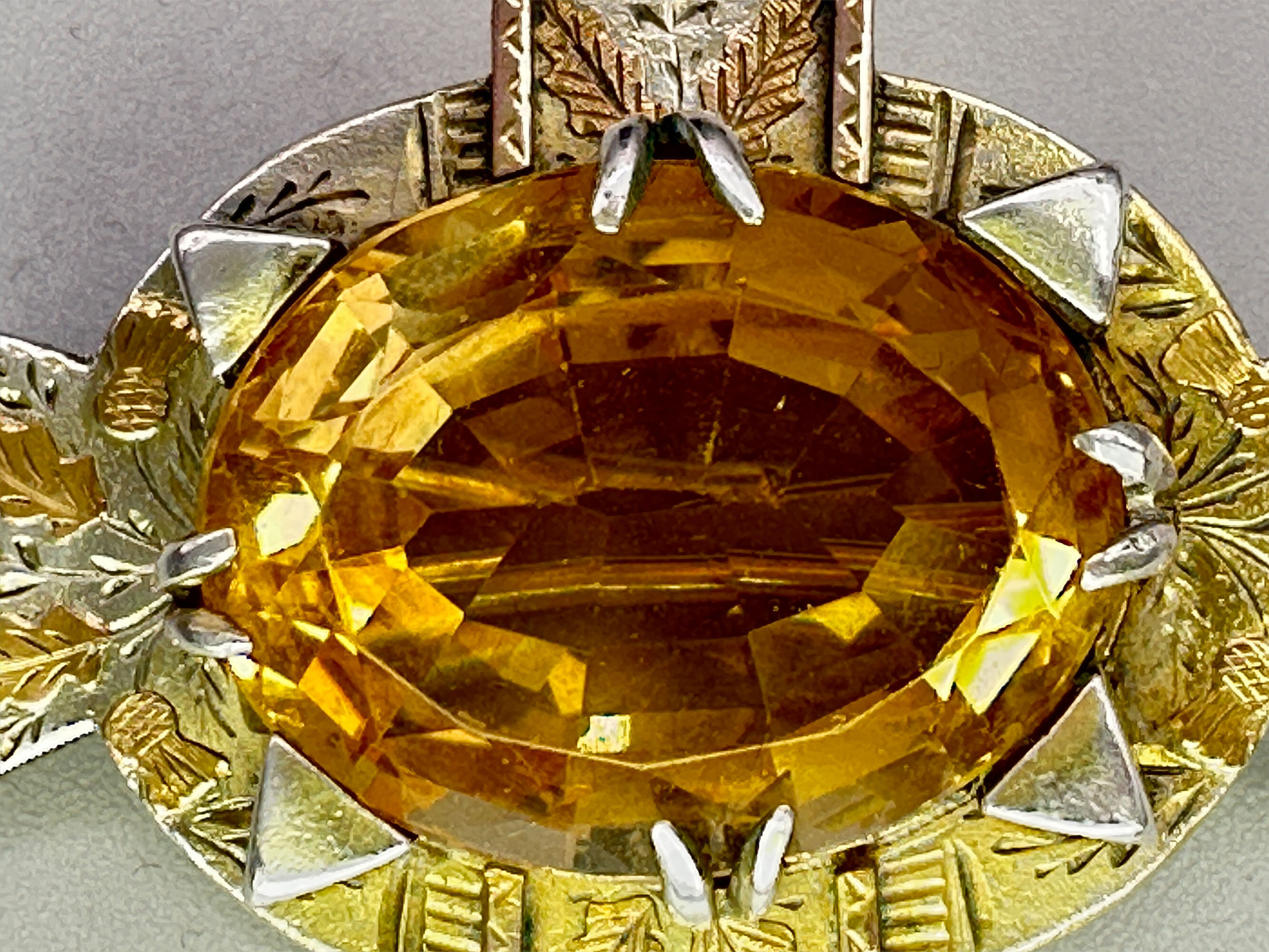 This is a stunning brooch comprising a very large Cairngorm citrine stone set into silver that has a gold wash. It has full hallmarks for Birmingham 1835 with the markers mark R.B.S.| Size: | Width 42.1 mm Height 31.4 mm Citrine is 20.8 x 16.5 mm |