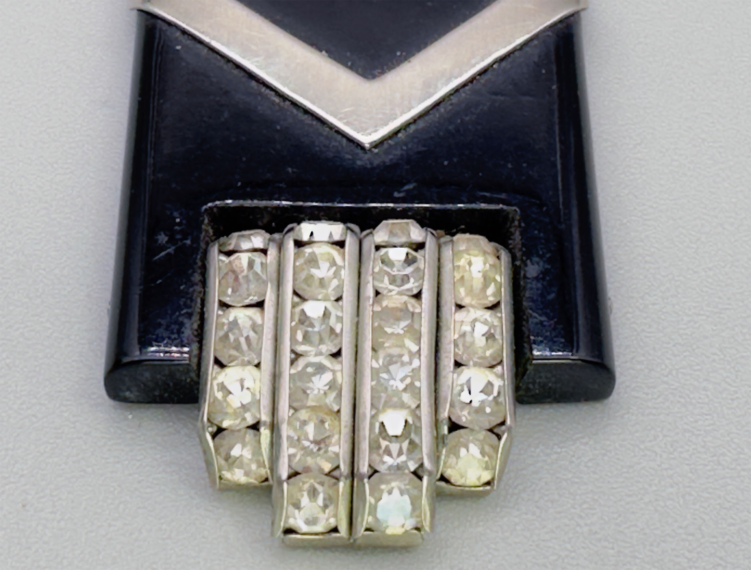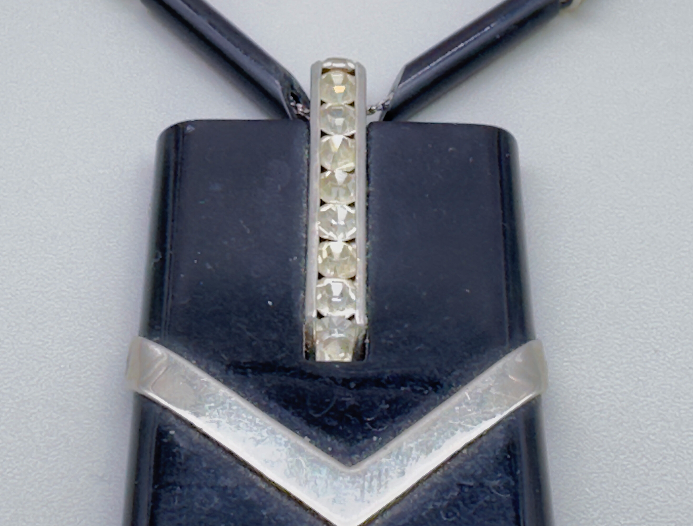 This a very rare Art Deco necklace by Schreiber and Hiller a German firm that was known for its paste jewellery and who patented the process for channel set stones. The necklace is in galalith with the paste stones channel set. There are also paste roundels between the tubular beads. It is marked DRGM 1138525 which stands for German Reich Registered Design. It is quite common to see bracelets and collar necklaces by this company with just the paste stones. This necklace might have been made bespoke.| Size: | 45 cm long, Pendant is 65 x 25 mm |
