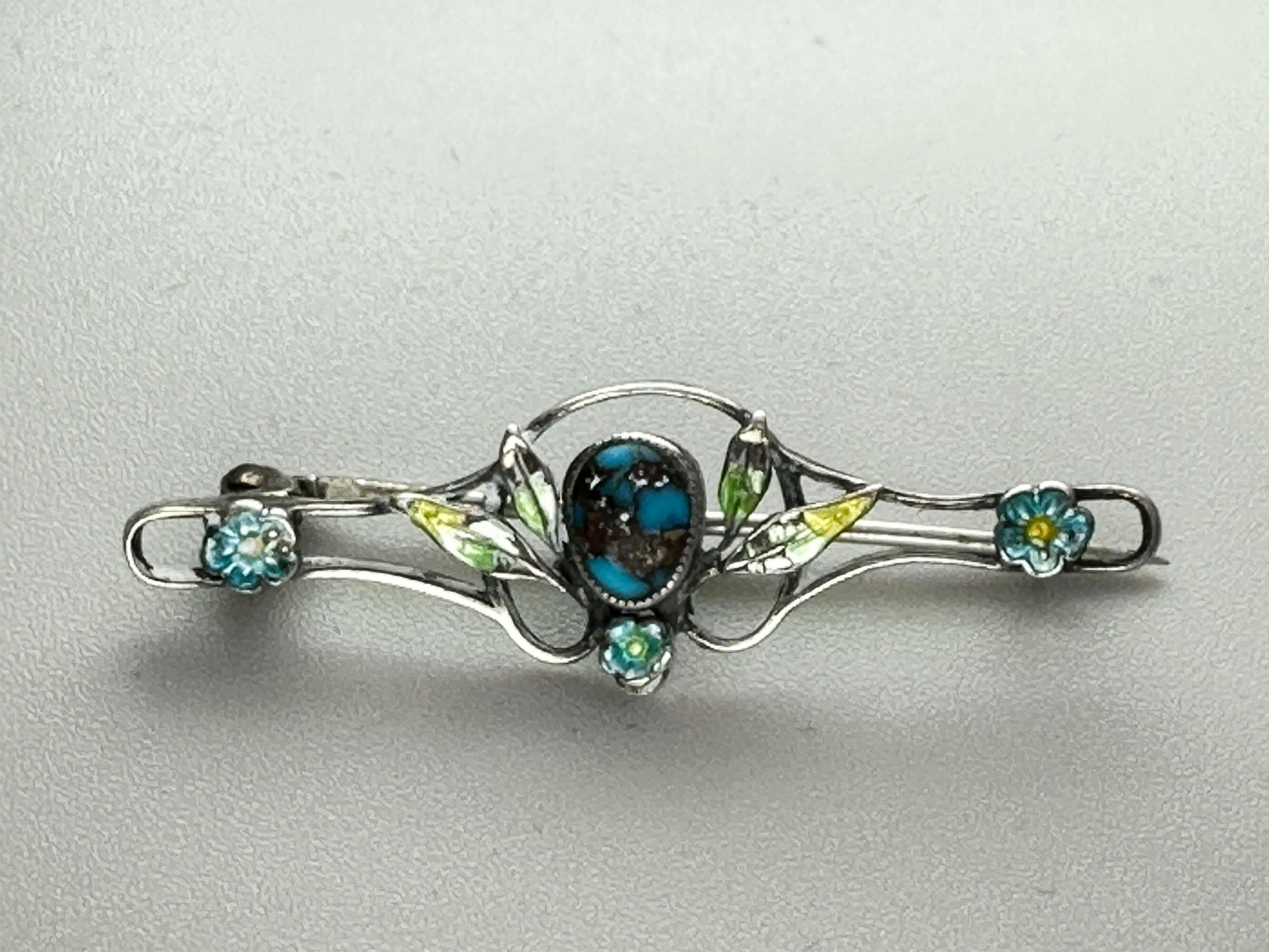 This is a medium sized brooch that has enamel work to emulate feathers and wings set with marcasite stones. It is marked 925 NE.| Size: | Width 53.8 mm Height 16.7 mm |