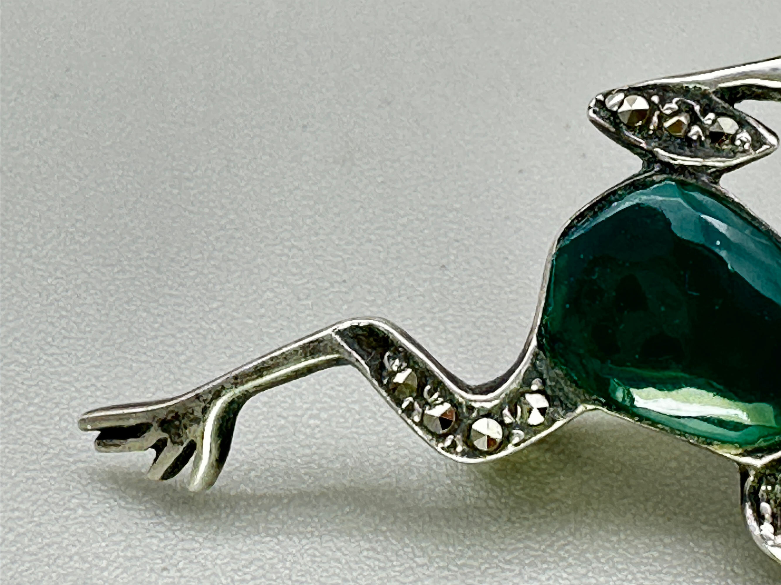 This is a very small and elegant silver brooch from the late Victorian period in the shape of a leaping frog. It is set with green chalcedony and marcasite stones and is unmarked.| Size: | Width 29.3 mm Height 12.7 mm |