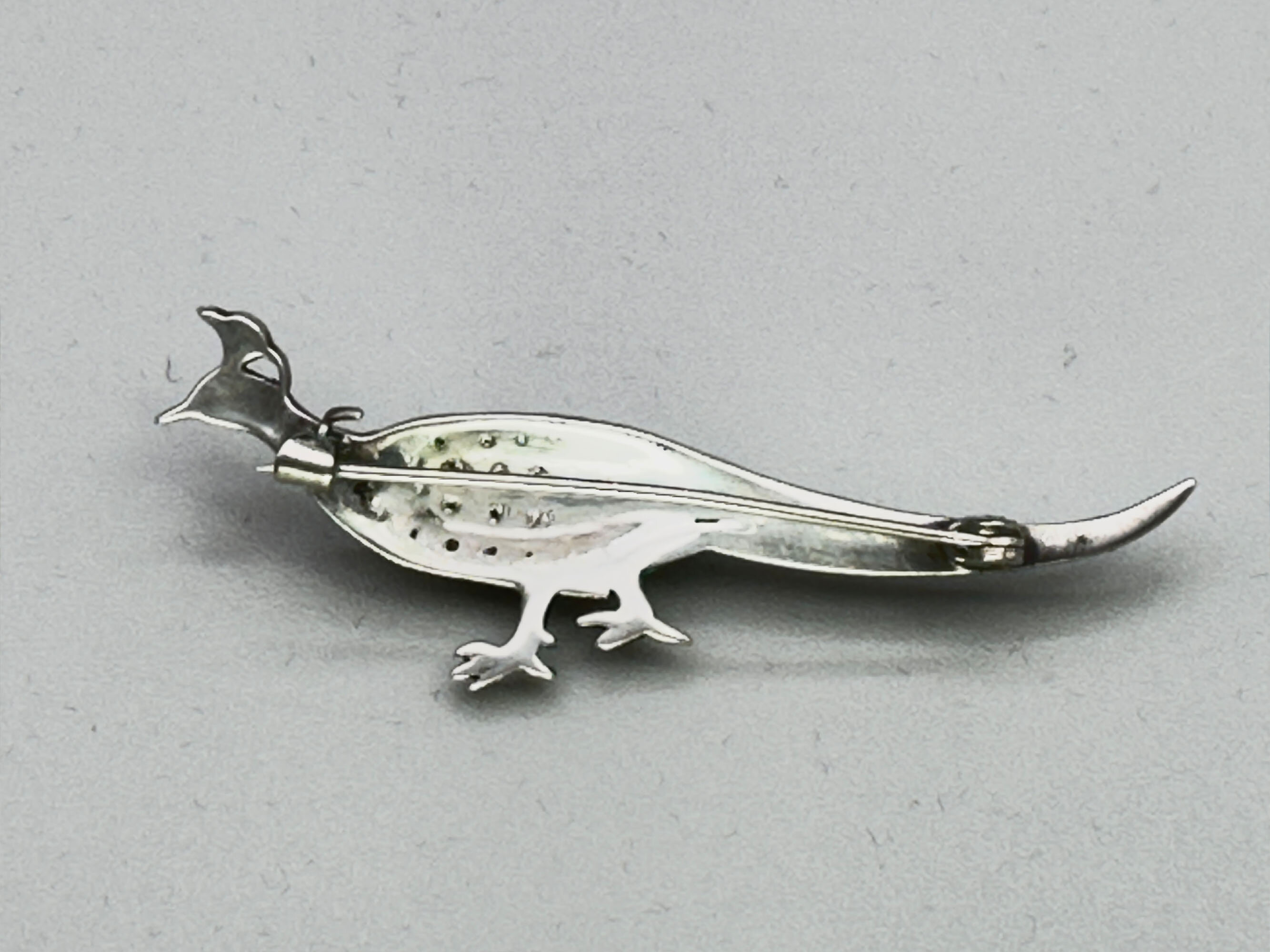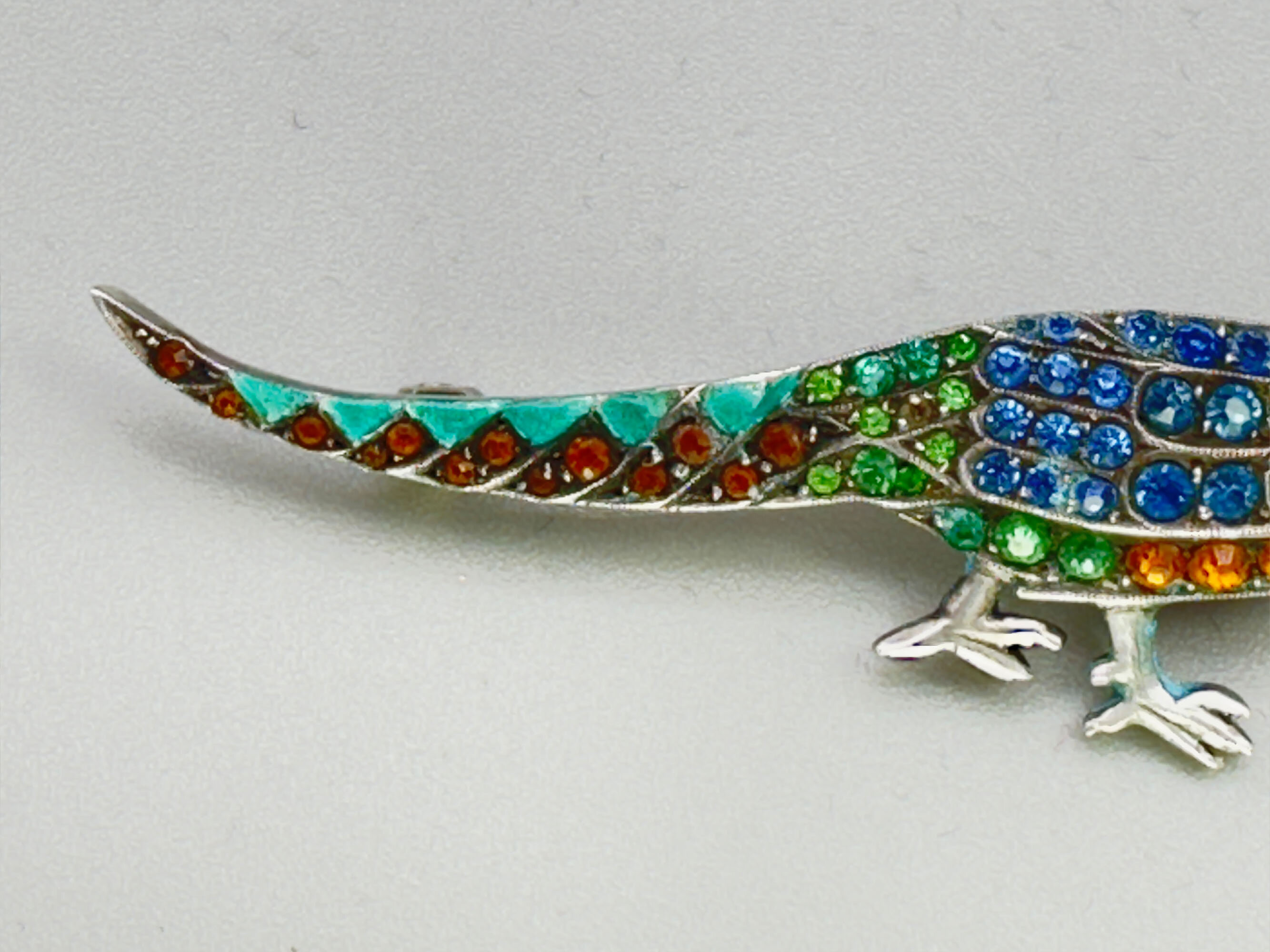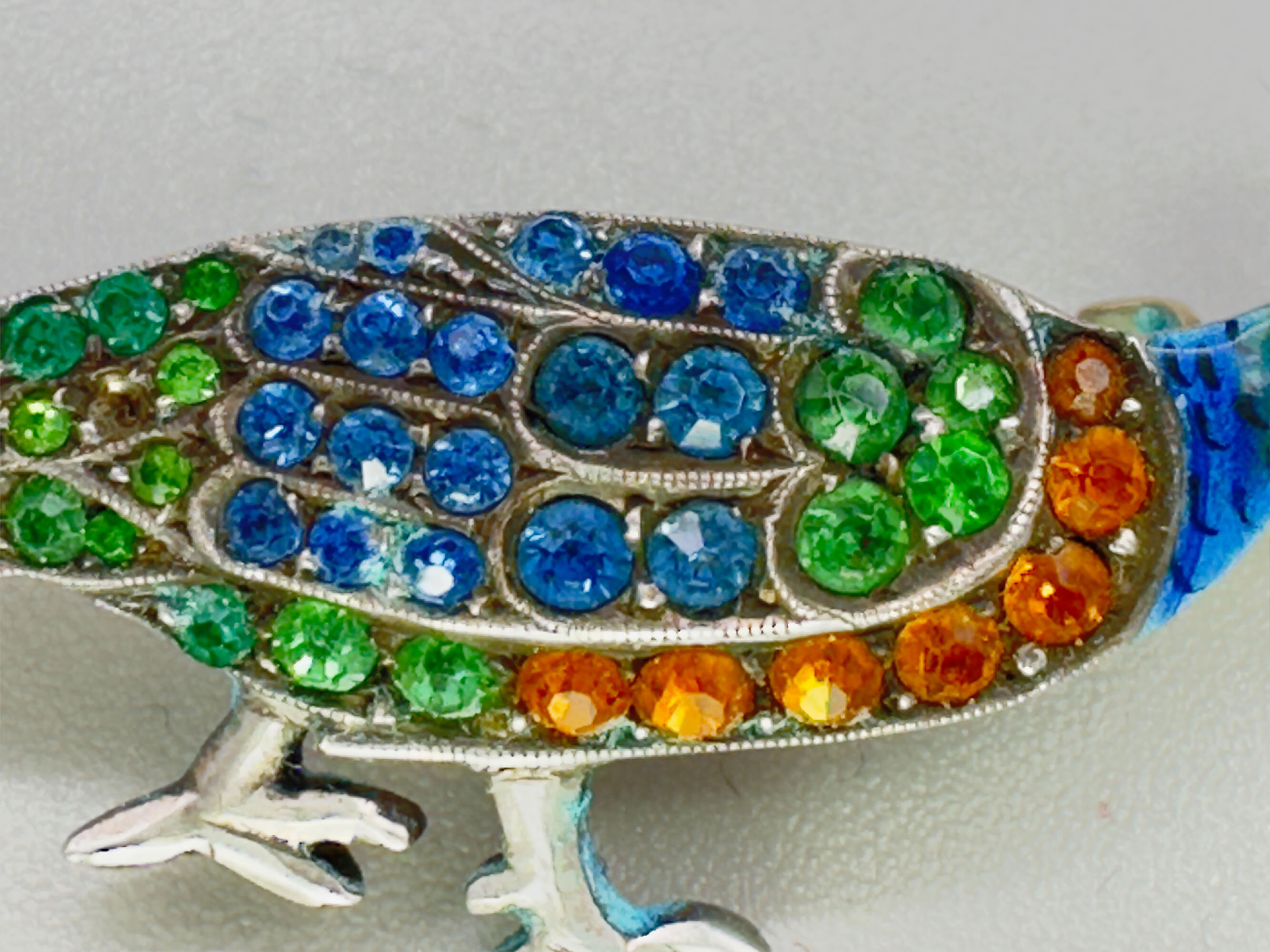 This is a lovely small brooch in a peacock design it is in silver with enamel work and set with colourful paste stones. It is marked Sterling so it is American.| Size: | Length 58.8 mm Width 19.5 mm |