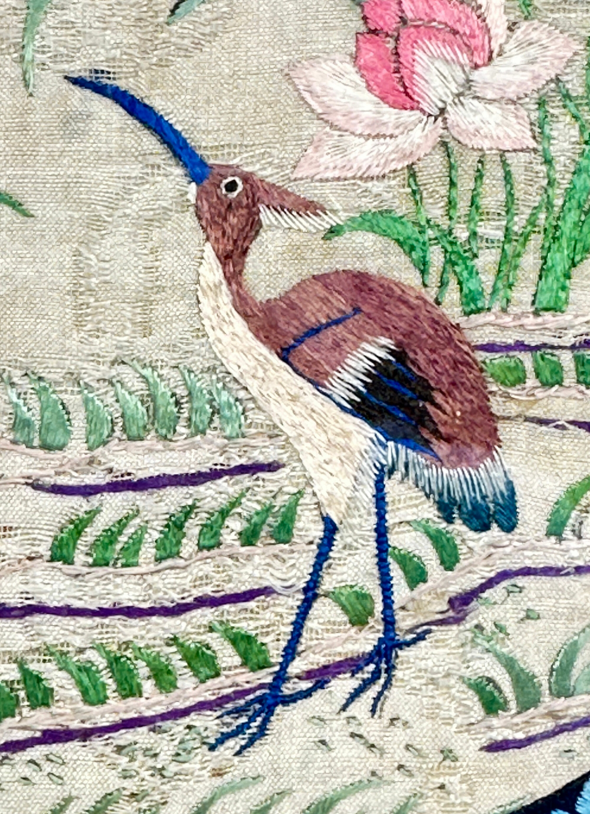 This is a fine quality Chinese silk embroidery circular panel, most likely cut out from an original robe as is indicated by the very feint unevenness at the edge, the black ground circular border with finely stitched blue flowers surrounding the central scene of a crane amidst tree branches with flowering lotus in the background. The detail of the embroidery work is evident throughout especially in the rendering of the crane’s feathers and the leaves of the lotus plant, implying that the original robe was a luxury production. This, combined with the fabric of the silk background, indicates that we clearly have nineteenth century work here. Perhaps the rest of the robe had not fared too well but for some reason the decision was taken to extract this sample and fit it into a glazed brass frame with its coil spring border. This has the look of the 1940s or 1950s and is probably English but its provenance cannot be absolutely certain. But the care taken at the time was entirely justified and allows us today to enjoy this fine example of Chinese embroidery work.| Size: | Width (frame) 19cm (silk panel) 15cm |