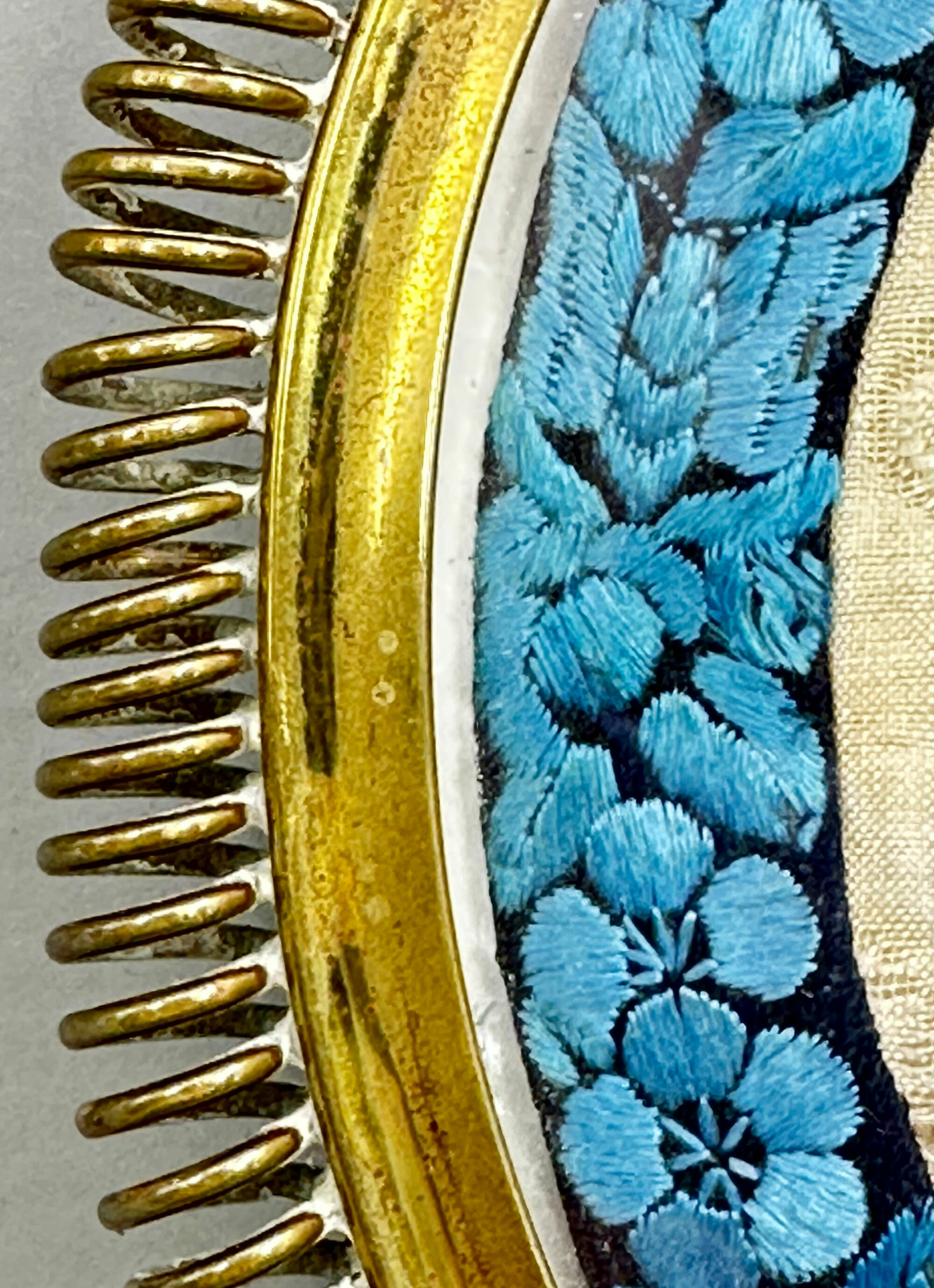 Chinese circular silk textile Panel in later European brass metal Frame, C19th/C20th