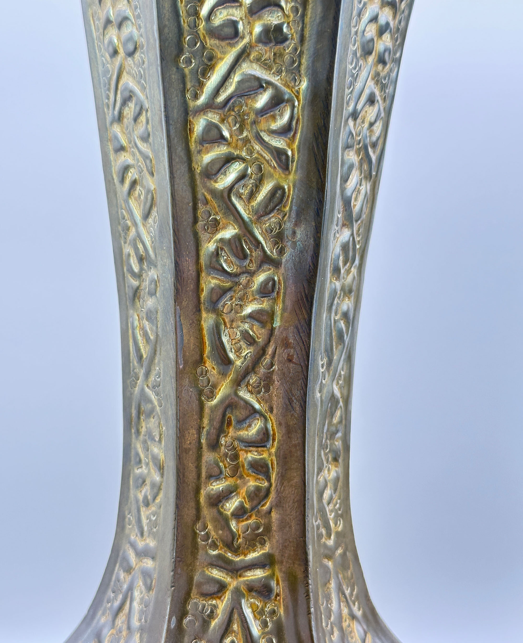 An unusual pair of brass vases of hexagonal form, the angular baluster body above a spreading foot and below a long, slender concave neck flaring out towards the top, decorated all over in repoussé work with stylised floral tendrils on a chased hammer punched ground of small circles, the base, shoulder and top rim with bands of studding. Repoussé work is a metalworking technique in which a malleable metal is shaped by hammering from the reverse side to create a design in low relief. Chasing or embossing is a similar technique in which the piece is hammered on the front side, often with a punch, sinking the metal. The two are often combined, as here.The form and style of these vases link them to a group of pieces known as ‘Mamluk Revival’ ware, produced in Syria in the early twentieth century and marketed through Cairo, where the Sultans there gave considerable stimulus towards their production and sale. The Mamluk period (1250–1517) was the greatest Islamic empire of the later Middle Ages and included control of the holy cities Mecca and Medina. During it, the arts flourished with an especial concentration on elaborately decorated metalware and it was these pieces which provided the inspiration for the twentieth century craftsmen copying and adapting their style. Similar and rather grander pieces are known where the brass is inlaid with silver and copper, often with Islamic calligraphy. This pair of vases is rather more modest and perhaps intended for a domestic rather than export audience, but no small amount of care was taken in their manufacture, the soldered joins of the various panels forming the vases as a whole requiring great skill. Under a strong light the decoration, from which a considerable amount of old dried polish has been removed, glows with an attractive intensity and the vases certainly have a pronounced ‘Islamic’ look and feel.