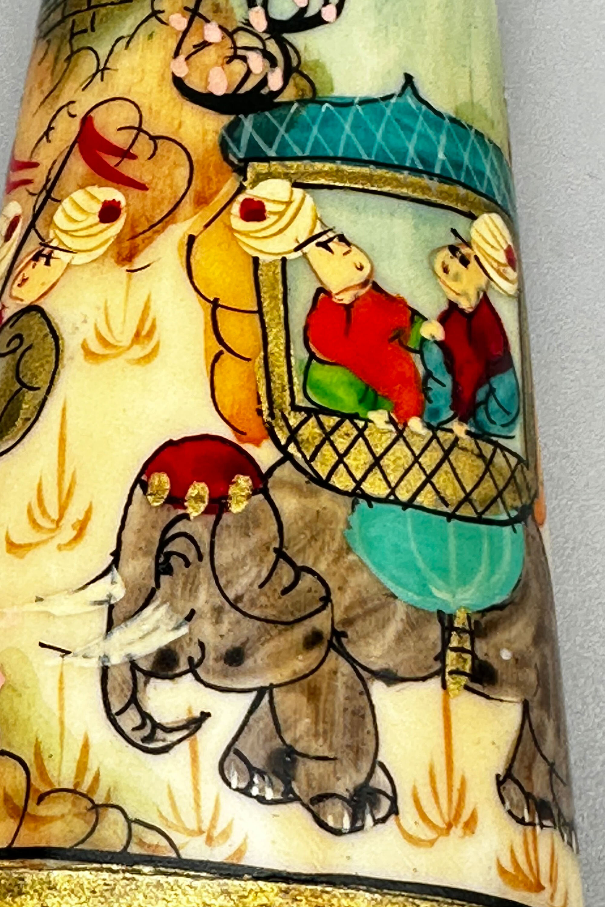 A bone perfume bottle, the flattened ovoid body tapering towards the top with a ridged circular neck, amusingly painted in bright colours with a continuous scene of dignitaries in a howdah borne by an elephant surrounded by attendants riding elephants, the neck with gilt and stylised floral decoration. These perfume bottles seem to be early twentieth century work made in Turkey and recalling, in a rather sketchy fashion (here nearly literally so) art from the earlier years of the Ottoman empire. The bone is said to be camel, but this may be apocryphal. Originally the bottle would have been fitted with a cover with a wand below and perhaps with a tall slender knob as is seen on other pieces, but the lack of this here should not detract too much from an attractive example of the genre with its colourful and spirited scenes.| Size: | Ht 11cm, Width (max) 4.5cm, Depth (max) 3cm, Top diam 1.8cm |