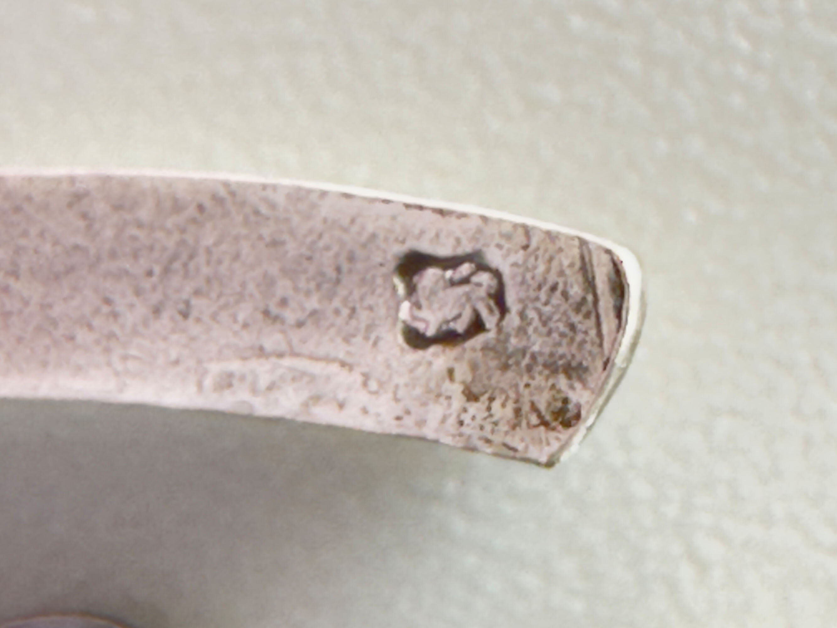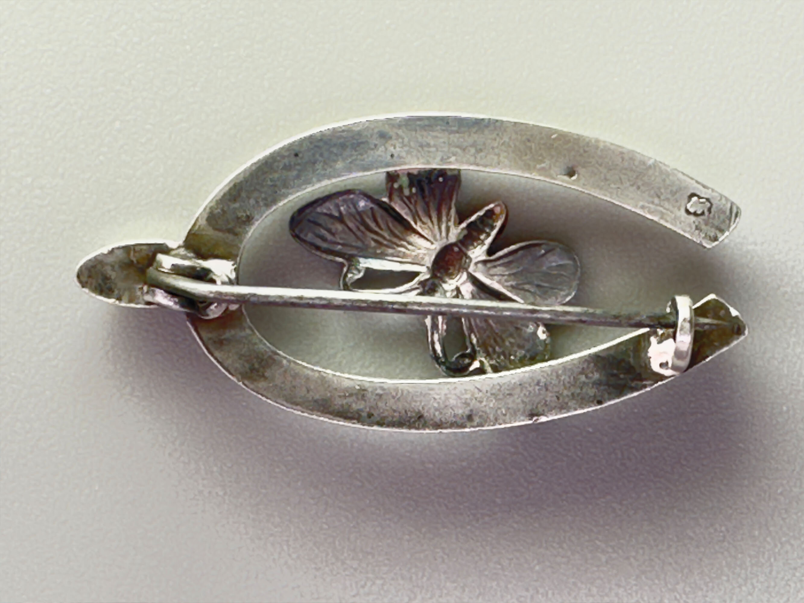 This is a very dainty silver brooch thta has a enamel butterfly within what appears to be a stirrup. It is marked ALLB with a dog so is most likely French.| Size: | 30.6 x 15.7 mm |