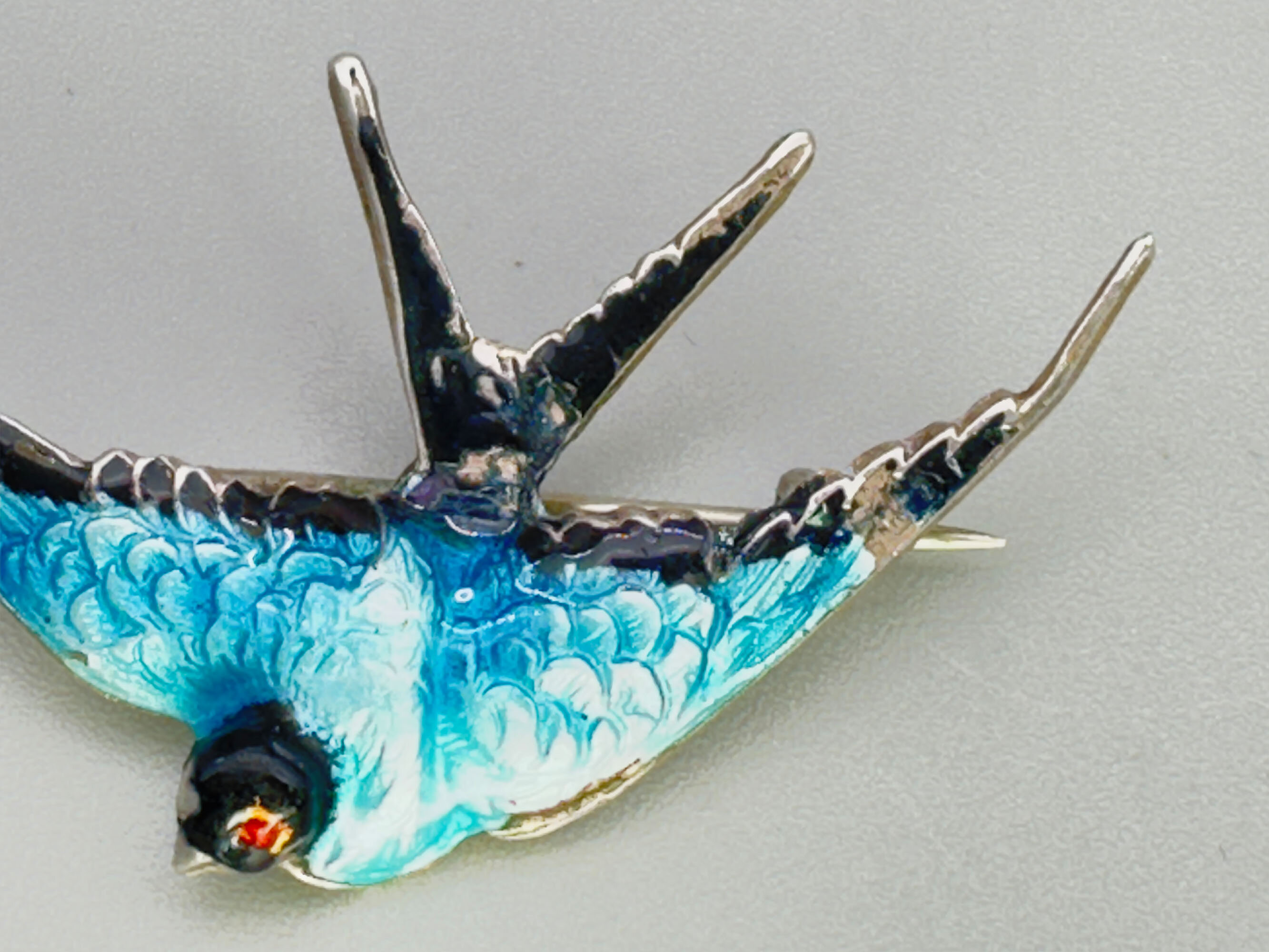This is a brooch that is silver with blue enamel, The bird's eyes are red enamel. I tis marked HJH, Silver so it is most likely continental silver.| Size: | 27.8 x 51 mm |