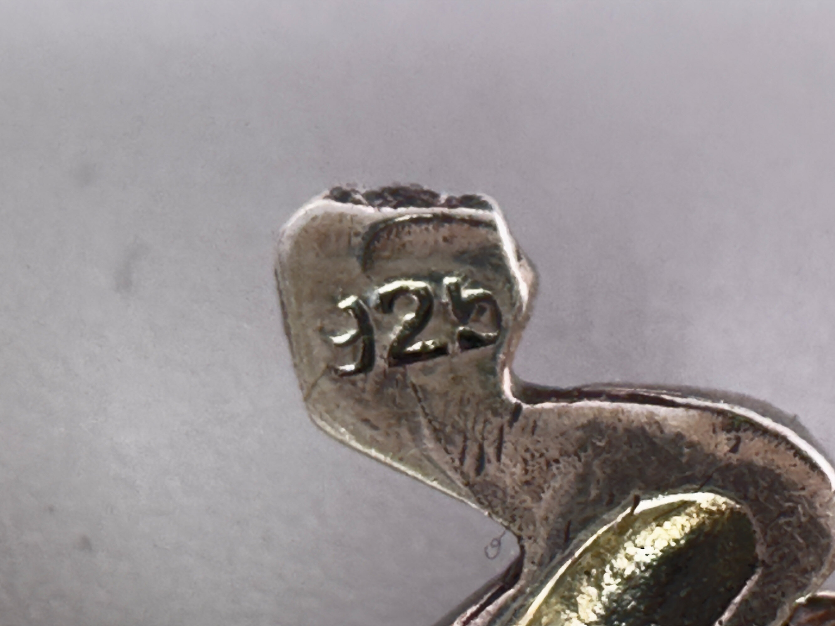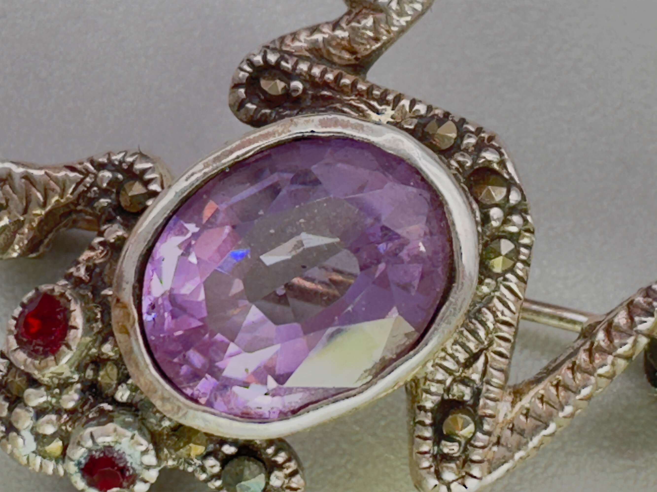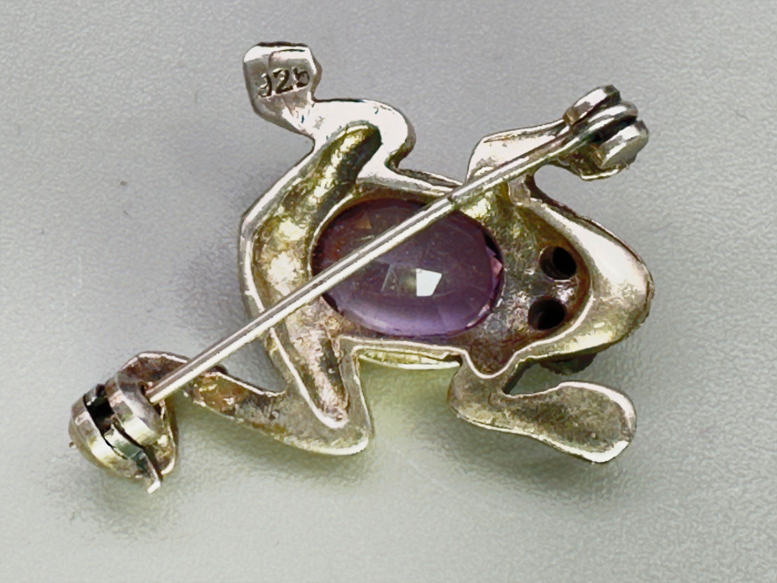 This is a small brooch that depicts a jumping frog. It is set with a large good quality amethyst stone with garnet eyes. It is covered in marcasites. It is marked 925.| Size: | 24.8 x 17.4 mm |