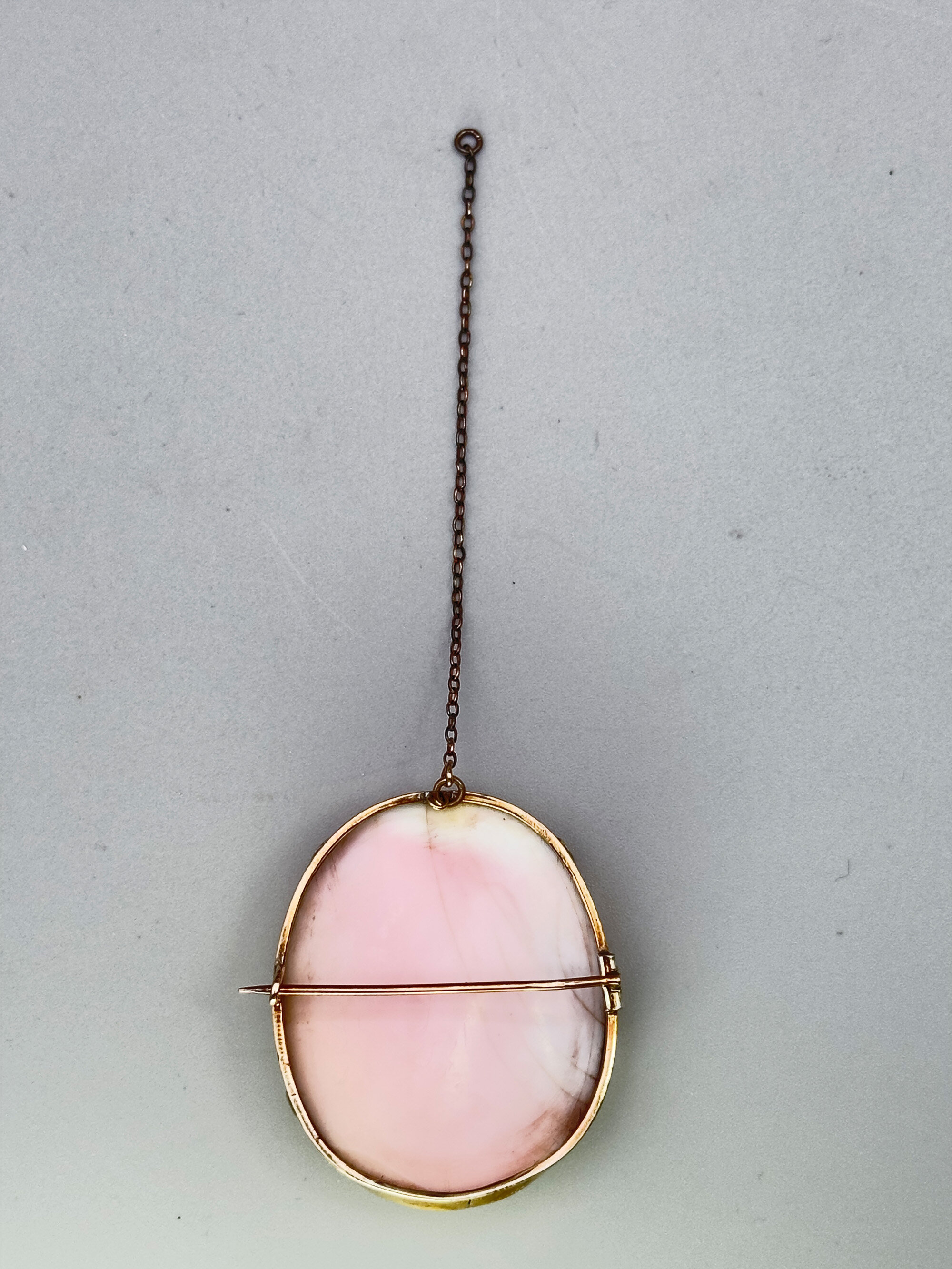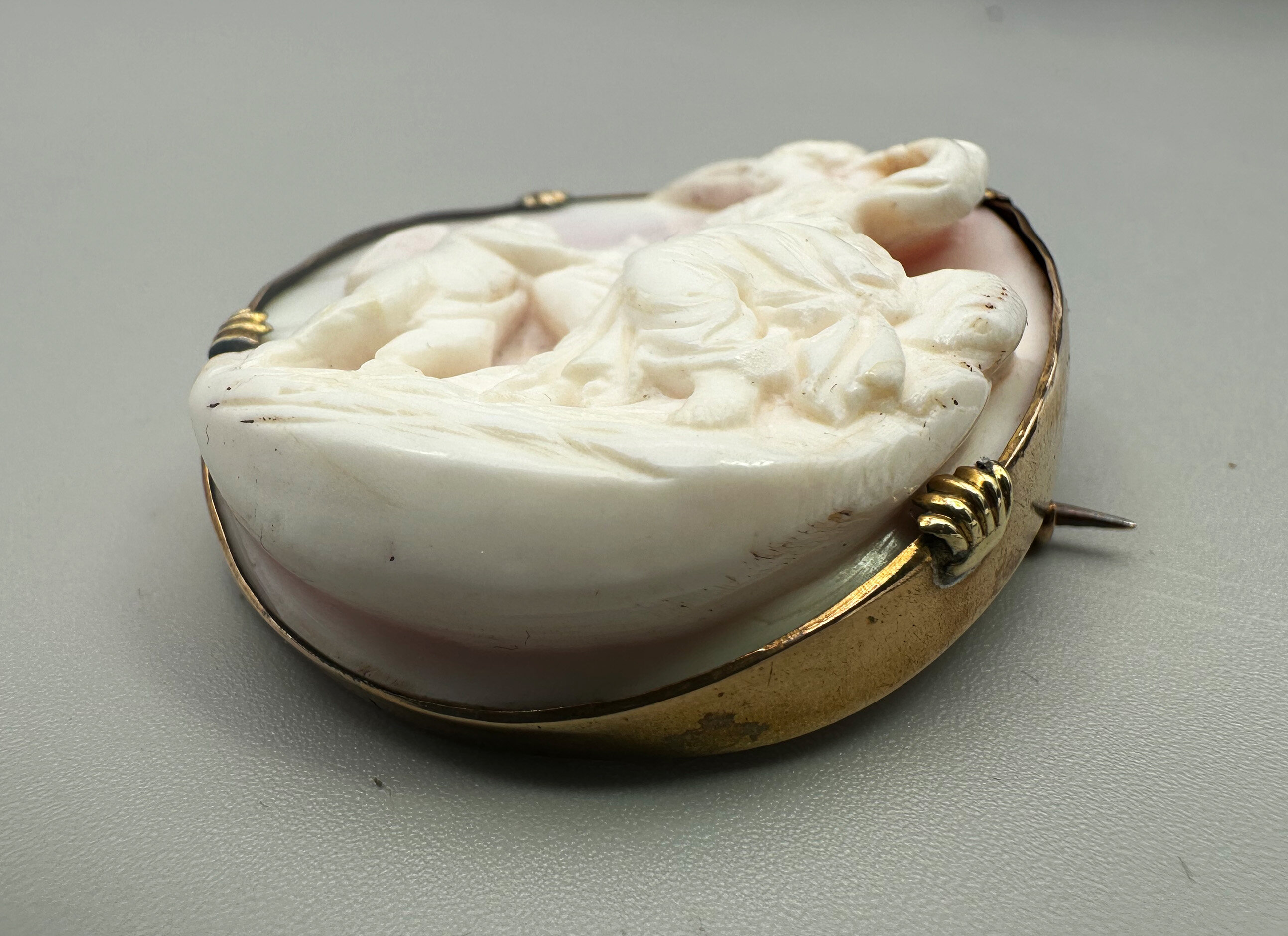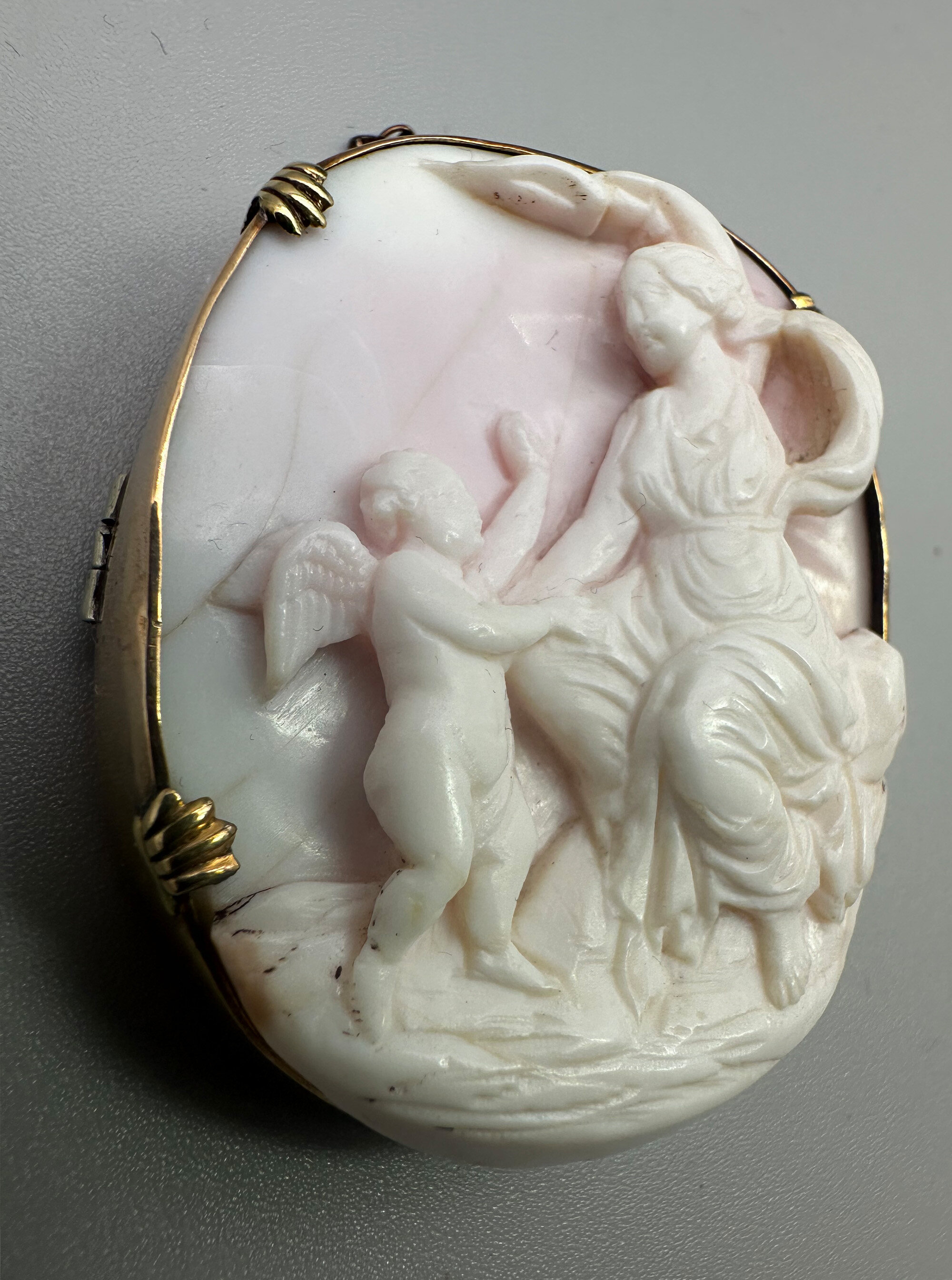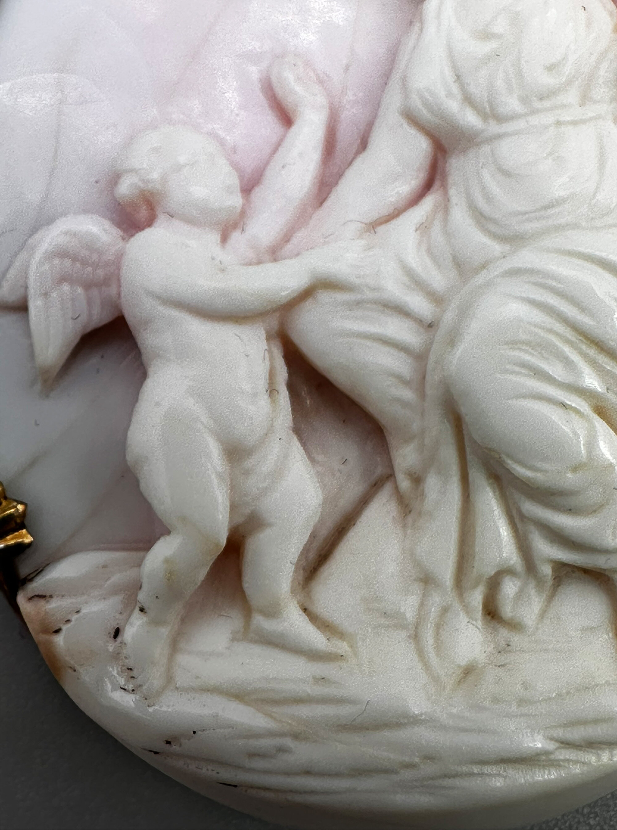 This is a very rare brooch that features high relief plaque carved from angel skin coral. It depict a maiden with a cherubic figure attending her. This scene symbolises love in classical motifs. This is carved from a large piece of pale coral and is mounted in rolled gold. It is unmarked and has safety chain.| Size: | 48 x 39.5 x 12.4 mm |