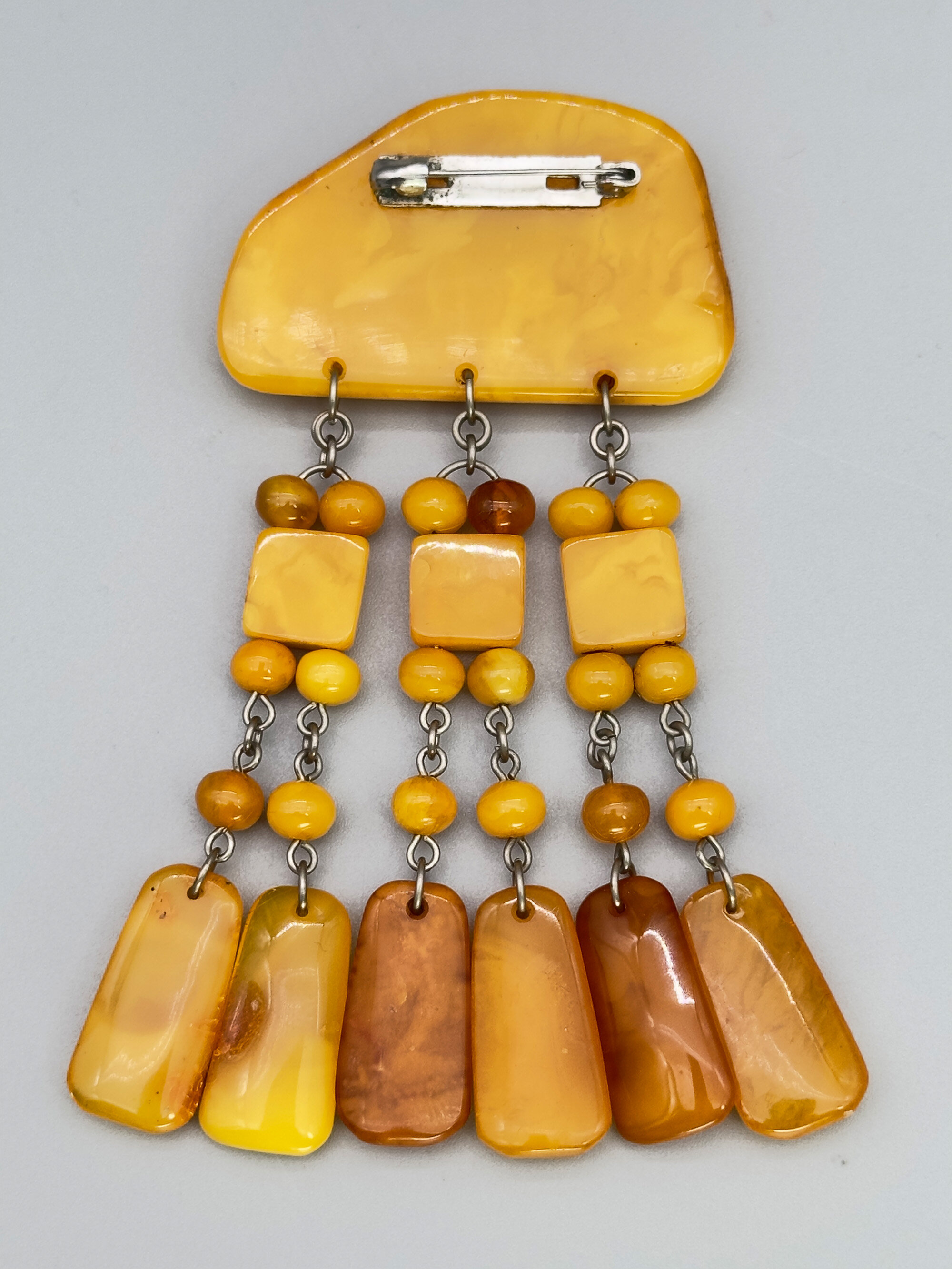This is a massive statement brooch that comprises the most beautiful amber stones. It has a large main stone and there are three dangling elements.| Size: | 52 x 105.6 mm |