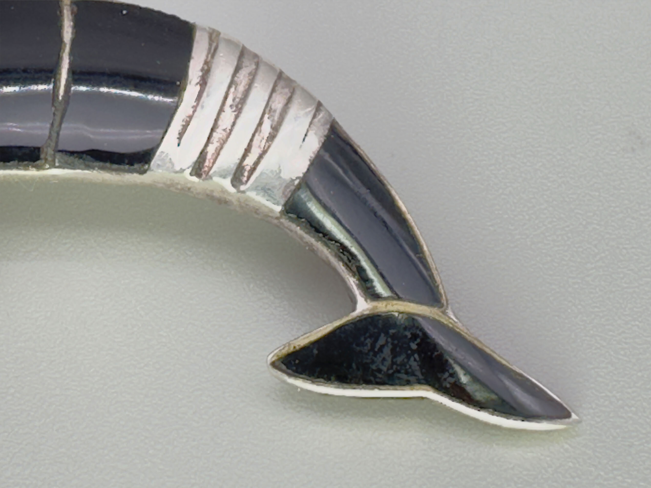 This is a strking brooch in a modernist design that depicts a jumping dolphin. It is silver set with onyx or agate stones. It is hallmarked London 1991 with a makers mark that is three circles.| Size: | 61.8 x 32.4 mm |