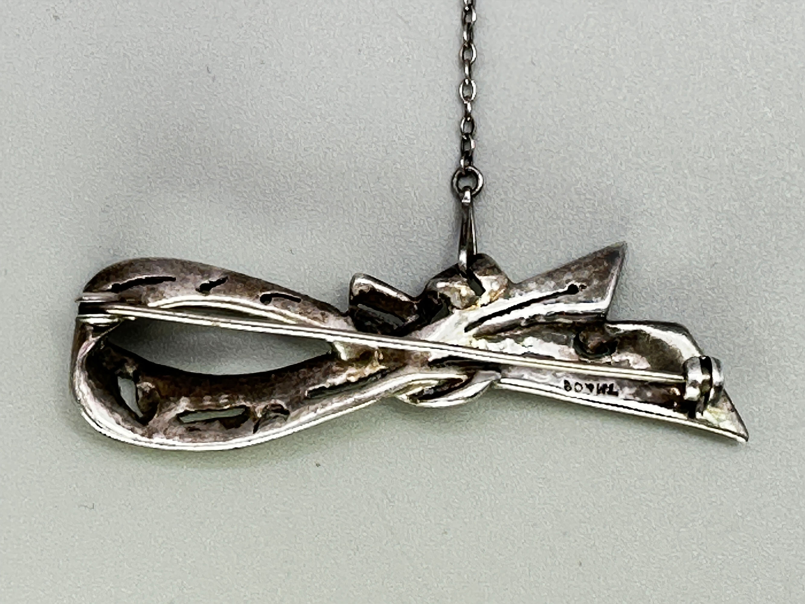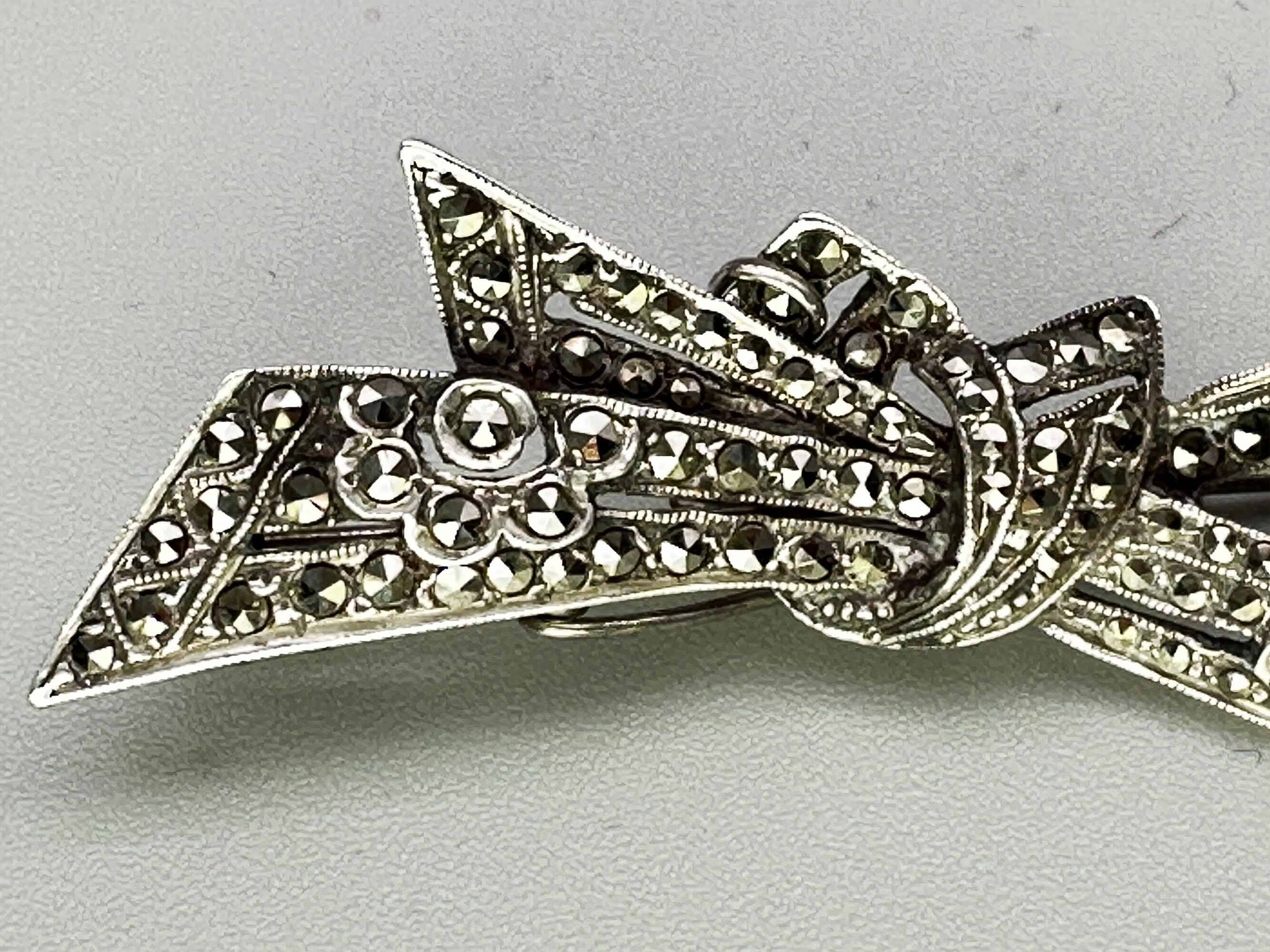 This is an excellent quality brooch in a riboon design set with bright marcasite stones. It bears a makers mark for T. M. & Co, Birmingham 1955| Size: | 58.3 x 16.6 mm |