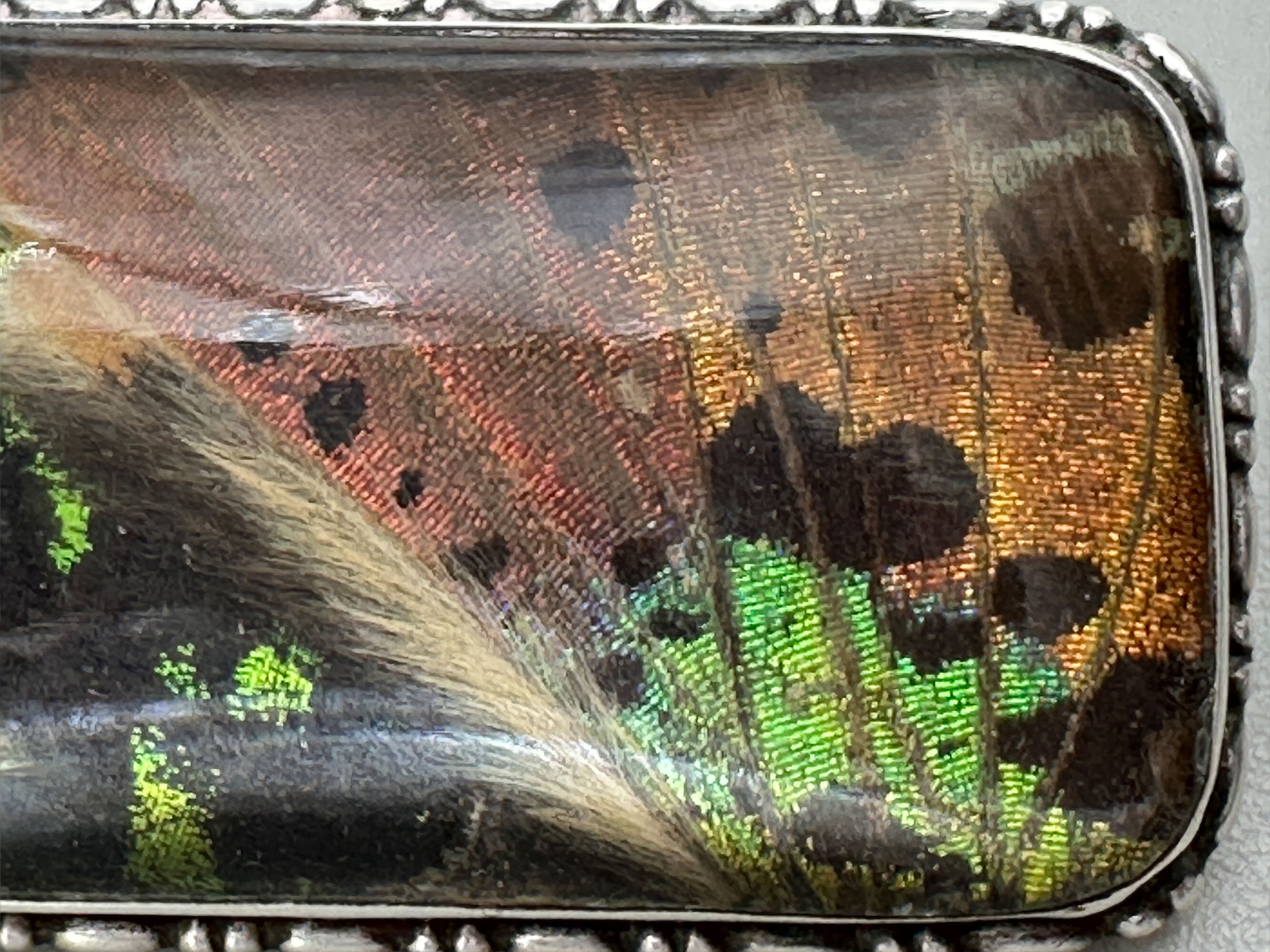 This is a lovely brooch that features a very unusual type ot butterfly wing. It is unusual that it is just showing the wing without an image over it but it is much more beautiful than those. It is covered with a glass cabachon stone and it is mounted in silver. It is marked Sterling so most likely it is American.| Size: | 40.7 x 22.6 mm |