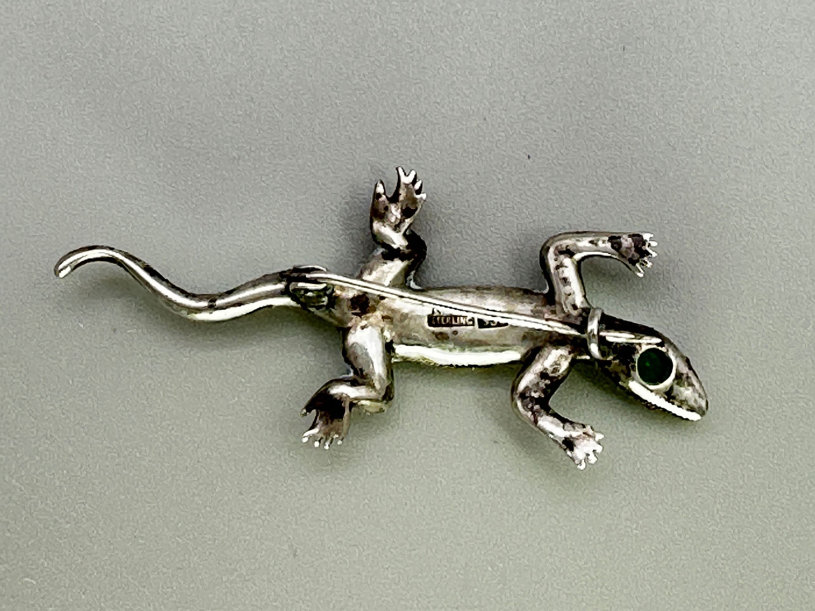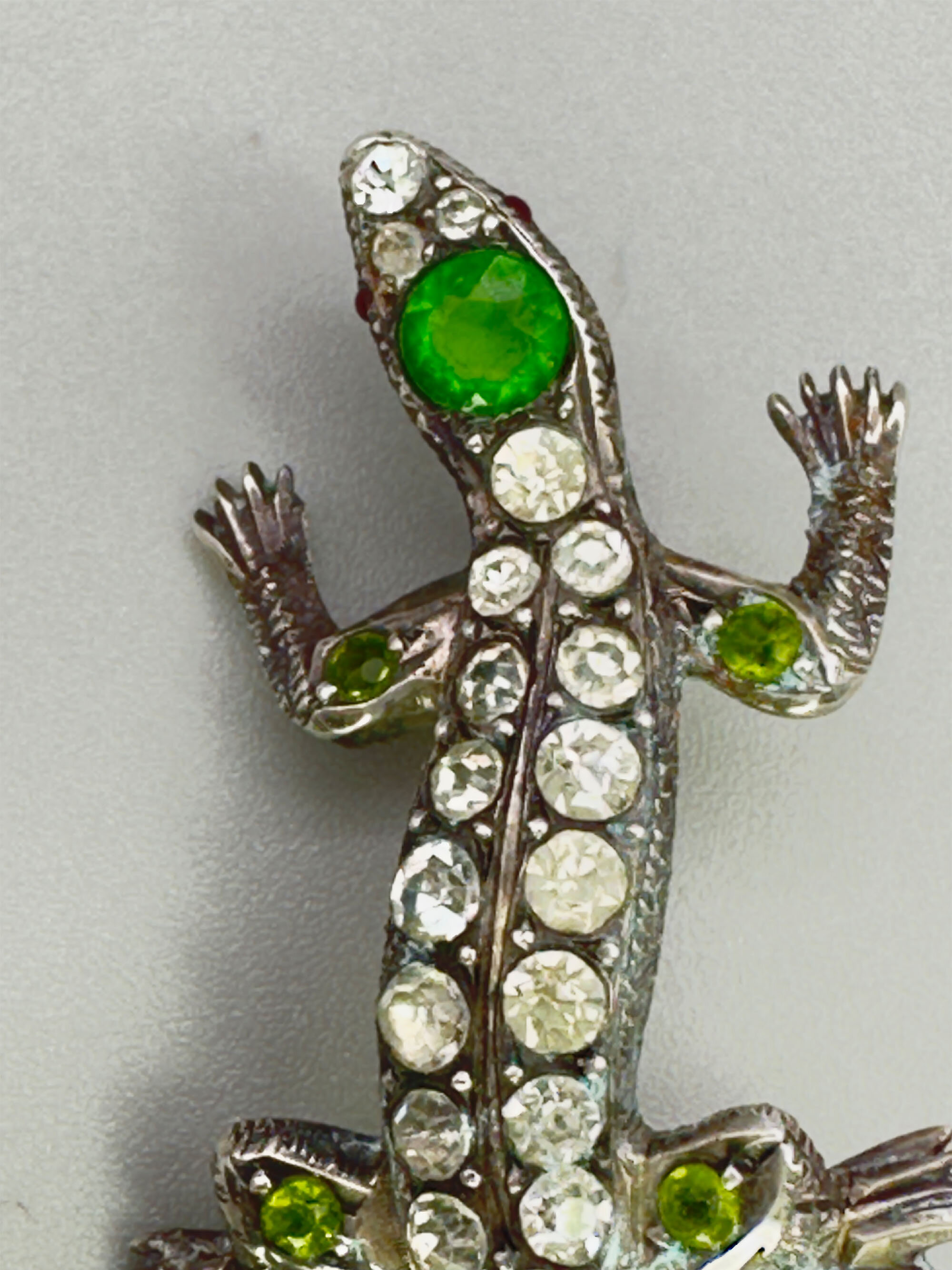 This is a very fine lizard brooch in silver with large paste stones. The green stones could be peridot and the eyes appear to be rubies. It is marked Sterling 935 so it is most likely French or German for export. It is very detailed with fine work on the feet and tail. This is a great example of these types of brooches with the Lizard motif. The box illustrated is included with this lot.| Size: | 58.4 x 21.2 mm |