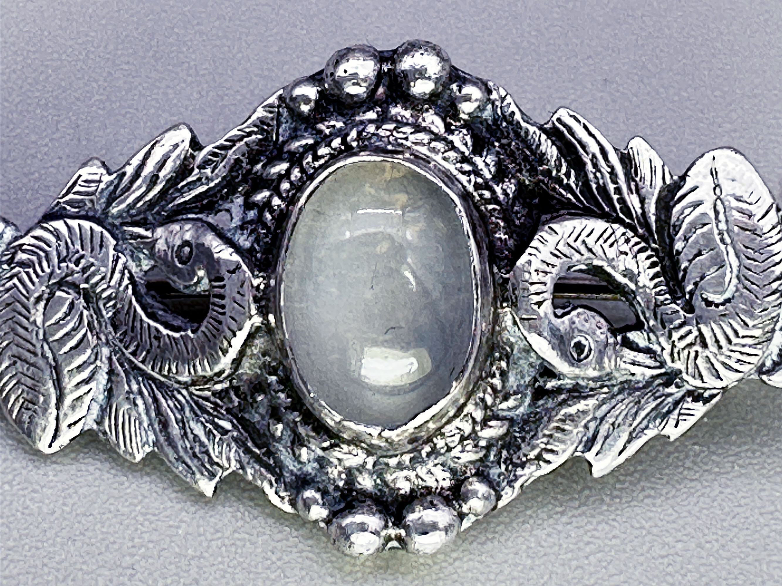 This is a very detailed brooch with a large moonstone that is set in silver and flanked by two swans with bent necks and flapping wings. This is unmarked and is most likely Indian in origin.| Size: | 40.6 x 20.1 mm |