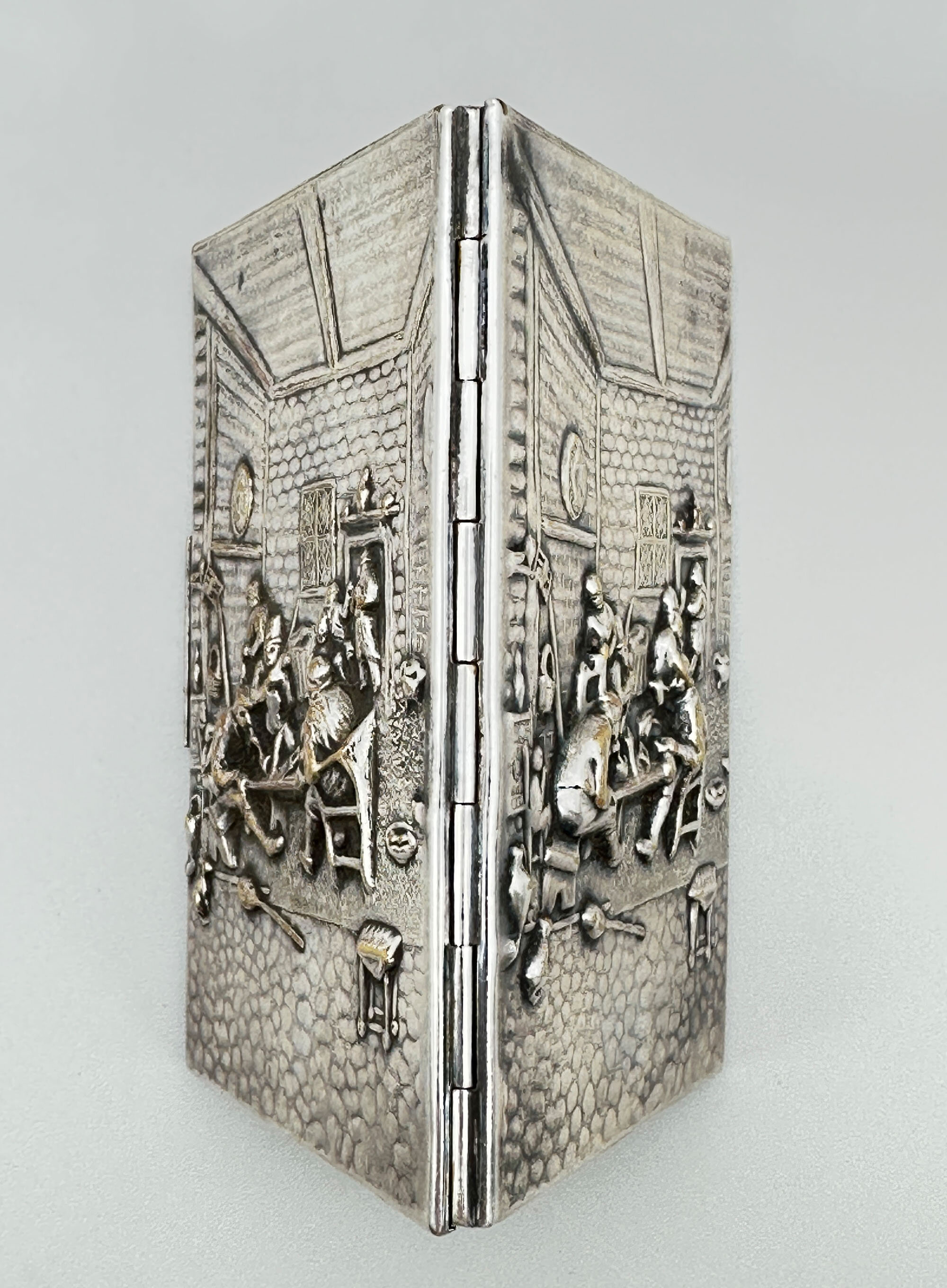 This is a folding silver plate photograph holder each side with a similar repoussé work scene of a traditional rustic interior with metal workers busy plying their trade. Repoussé work is a metalworking technique in which a malleable metal is shaped by hammering from the reverse side to create a design in low relief. Very similar pieces carry a mark for Denmark, as here, (see image 4) but also the initials JThS, or a slight variant on this, which seem to stand for Jorgen Th Steffenson of Randers who is known to have worked in the late 1970s. While not necessarily by him, a similar dating is most likely here.| Size: | Width (closed) 6.2cm, Length 9cm, Depth 0.3cm |