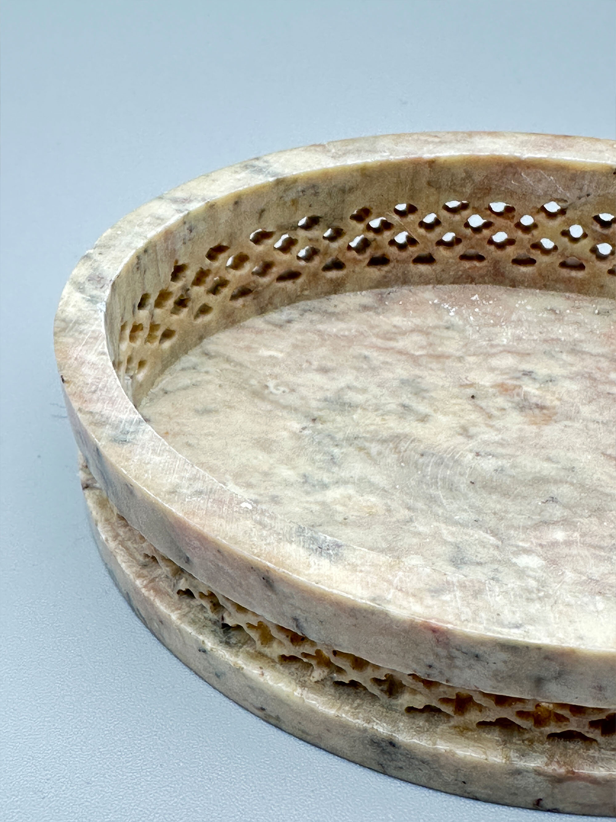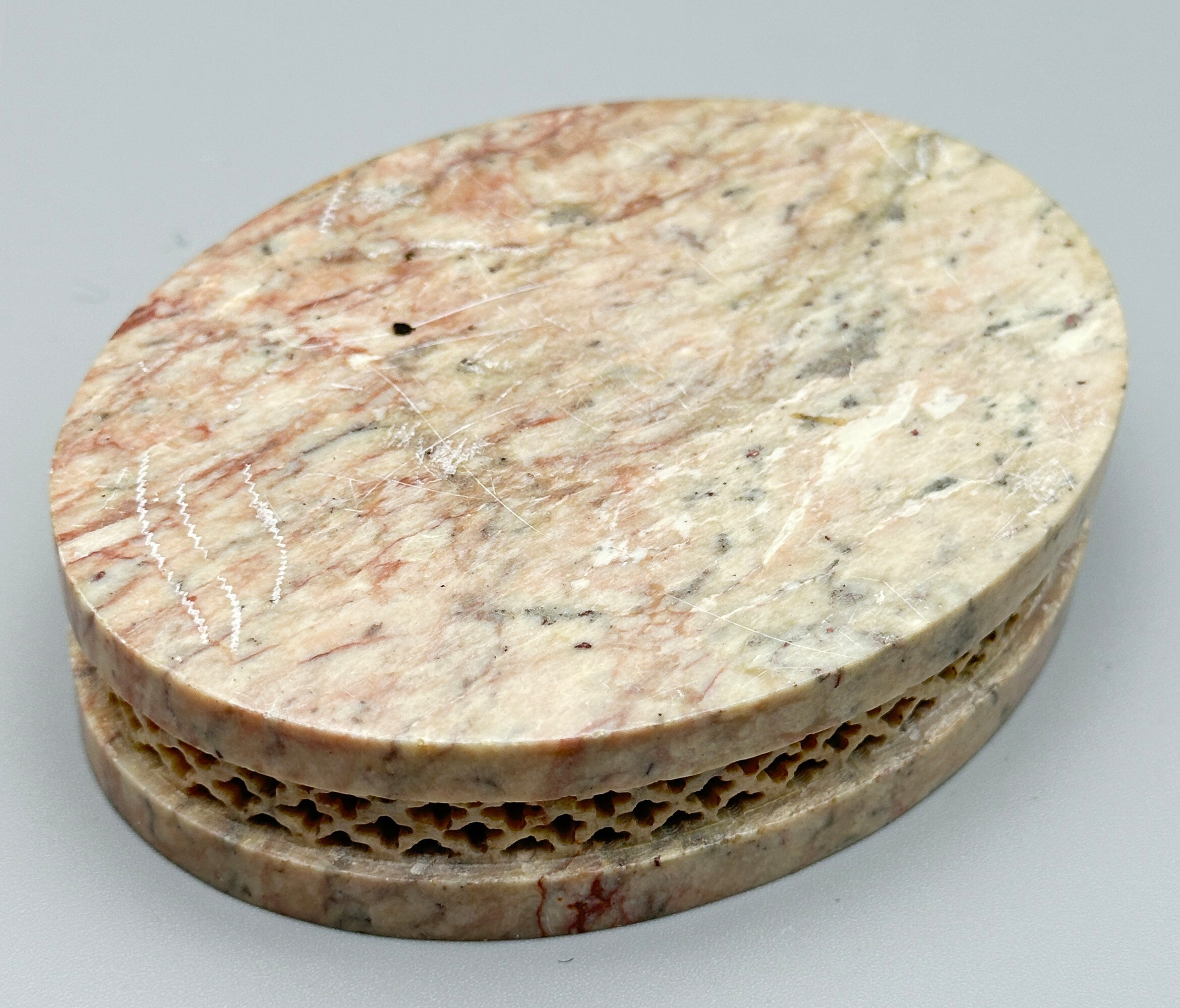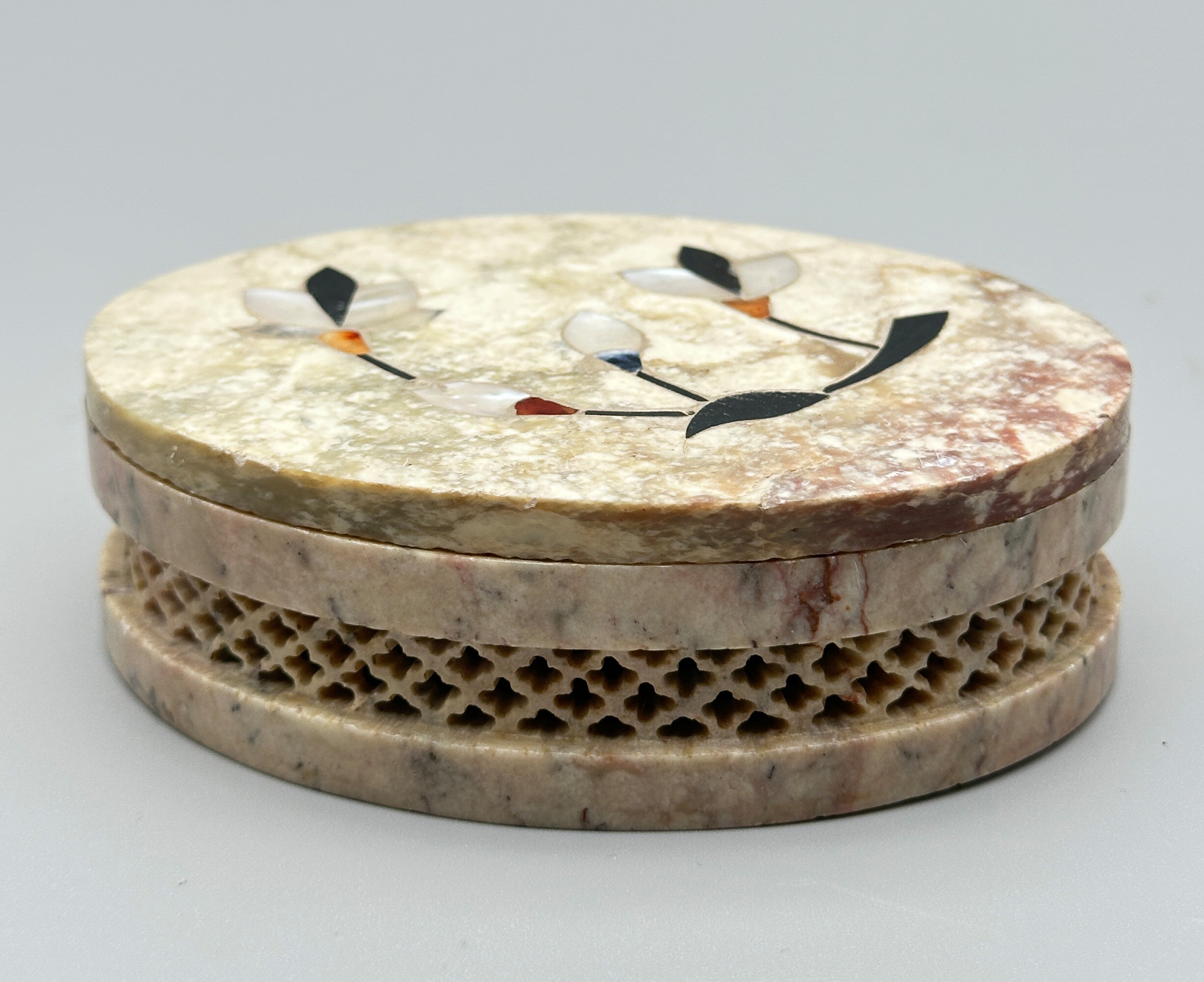 An oval soapstone box and cover, the sides of the box with reticulated or openwork lattice decoration and the flush fitting lid with ‘pietra dura’ inlay flowers. The technique of ‘pietra dura’ (literally ‘hard stone’) inlay in which polished and precisely cut, coloured and semi-precious stones were used to create intricate designs in stone (usually marble) was developed in Florence in the 16th century and then used around a hundred years later in the decoration of the Taj Mahal in India. The technique continued to be employed and is found even in pieces made in fairly modern times. These soapstone boxes were made in India and some retain their label stating this. Dating is probably to the mid twentieth century and these attractive pieces would be well suited for storing trinket items today.| Size: | Ht (max) 3cm, Ht (base) 2.5cm, Width 10cm, Depth 7.5cm |