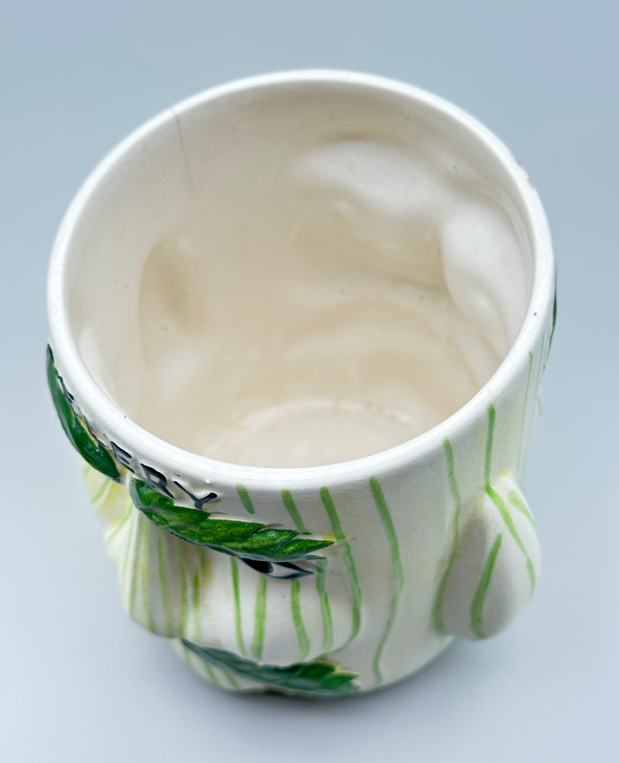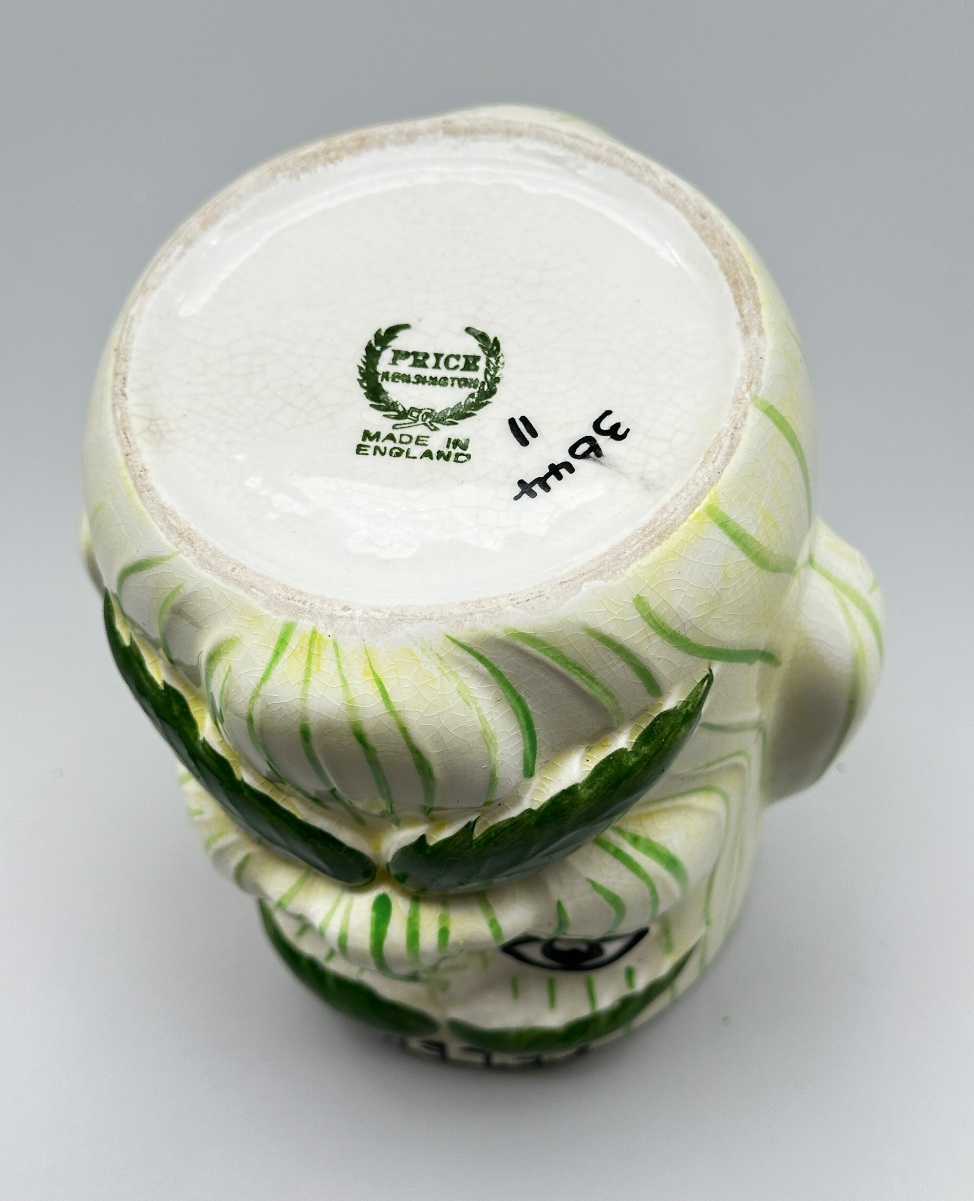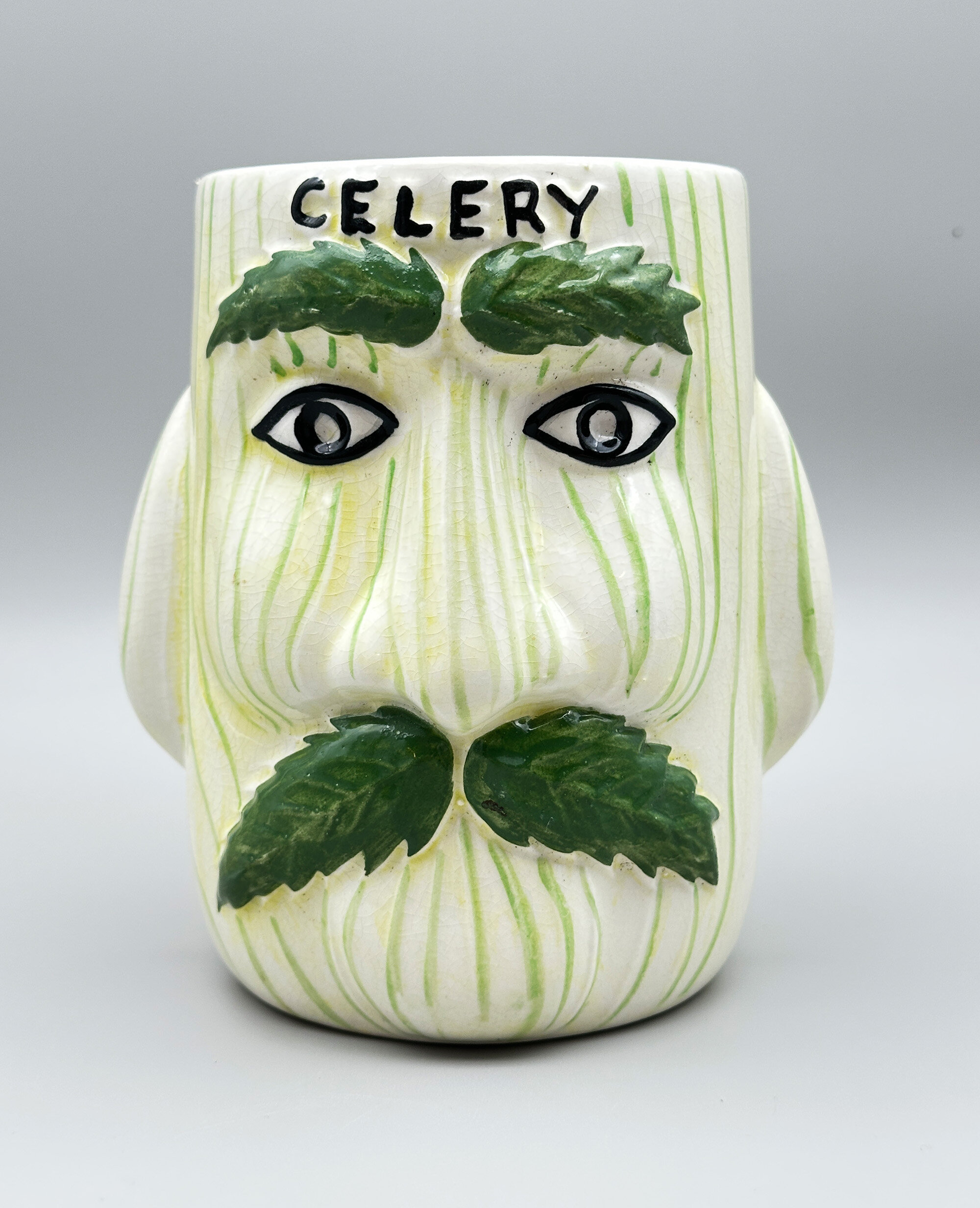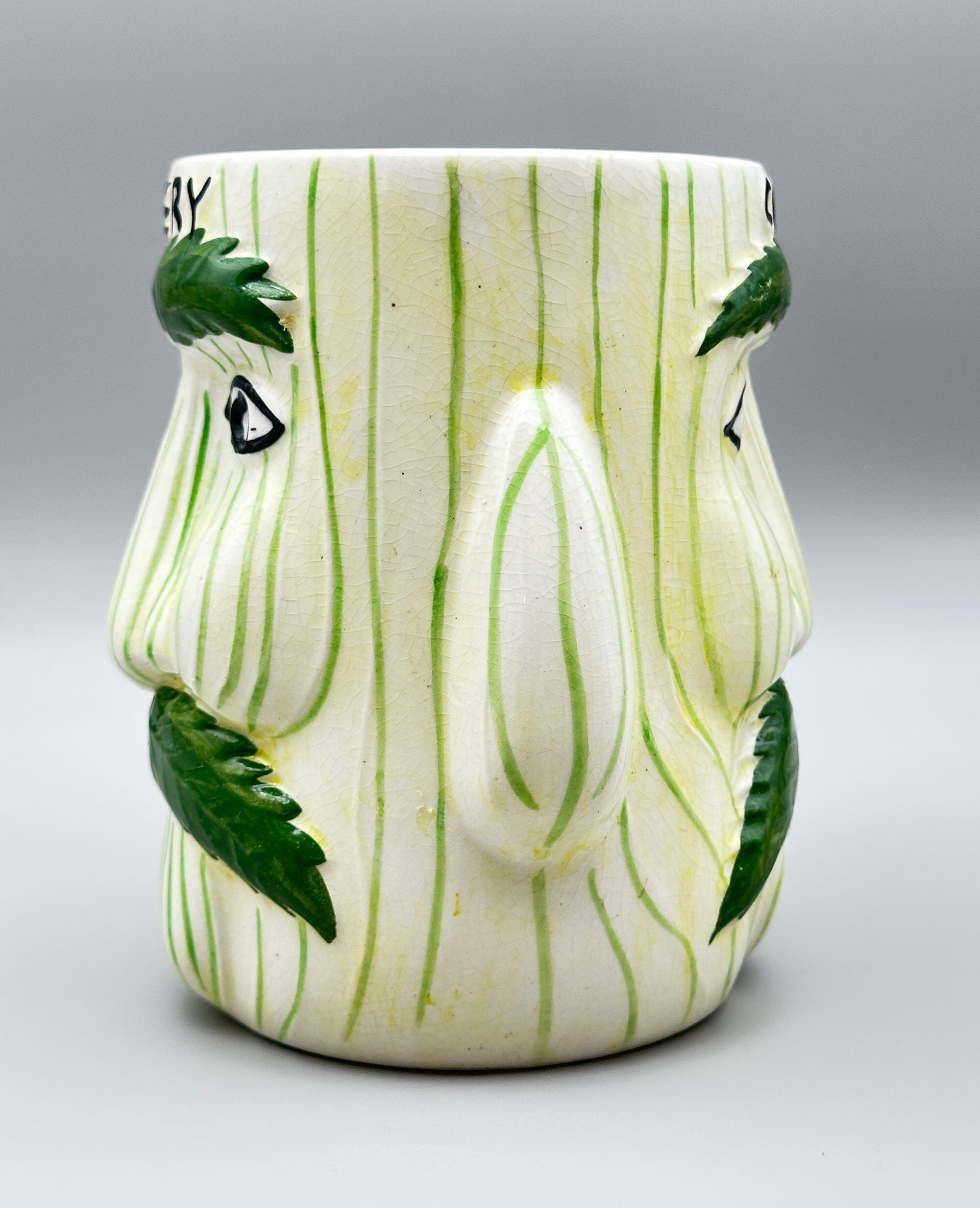 A novelty ceramic vase with two mask heads, the eyebrows and moustache formed as leaves, with the wording ‘CELERY’ above, the base with transfer marks ‘PRICE KENSINGTON’ within a wreath above ‘MADE IN ENGLAND’ and the pattern number ‘3644’ written at the side.Price & Kensington was the trademark for Price & Kensington Potteries Ltd which was formed in 1962 by the amalgamation of Price Bros. (Burslem) Ltd and Kensington Pottery Ltd which were both subsidiaries of Arthur Wood & Son (Longport) Ltd. From 1962 to 2003 Price & Kensington produced large quantities of domestic wares alongside novelties and souvenirs, but in 2003 their parent company went into administration and their brand name was eventually sold to Rayware Limited which continued to use it, eventually moving the manufacture abroad, mainly to China.