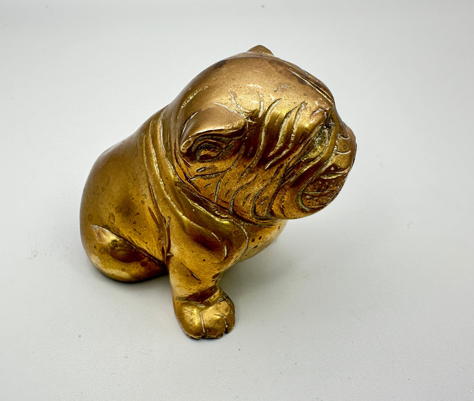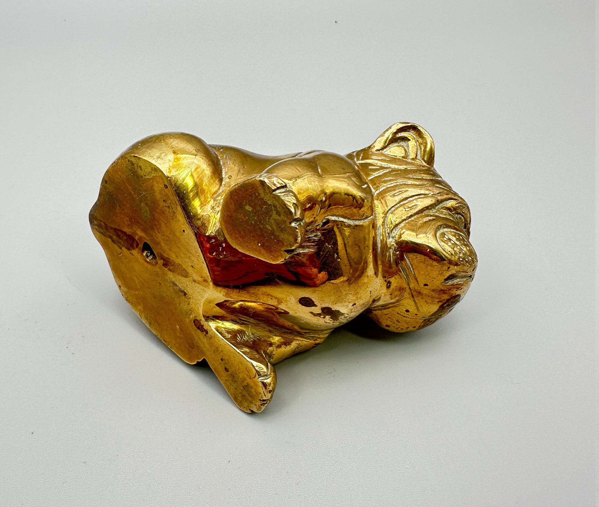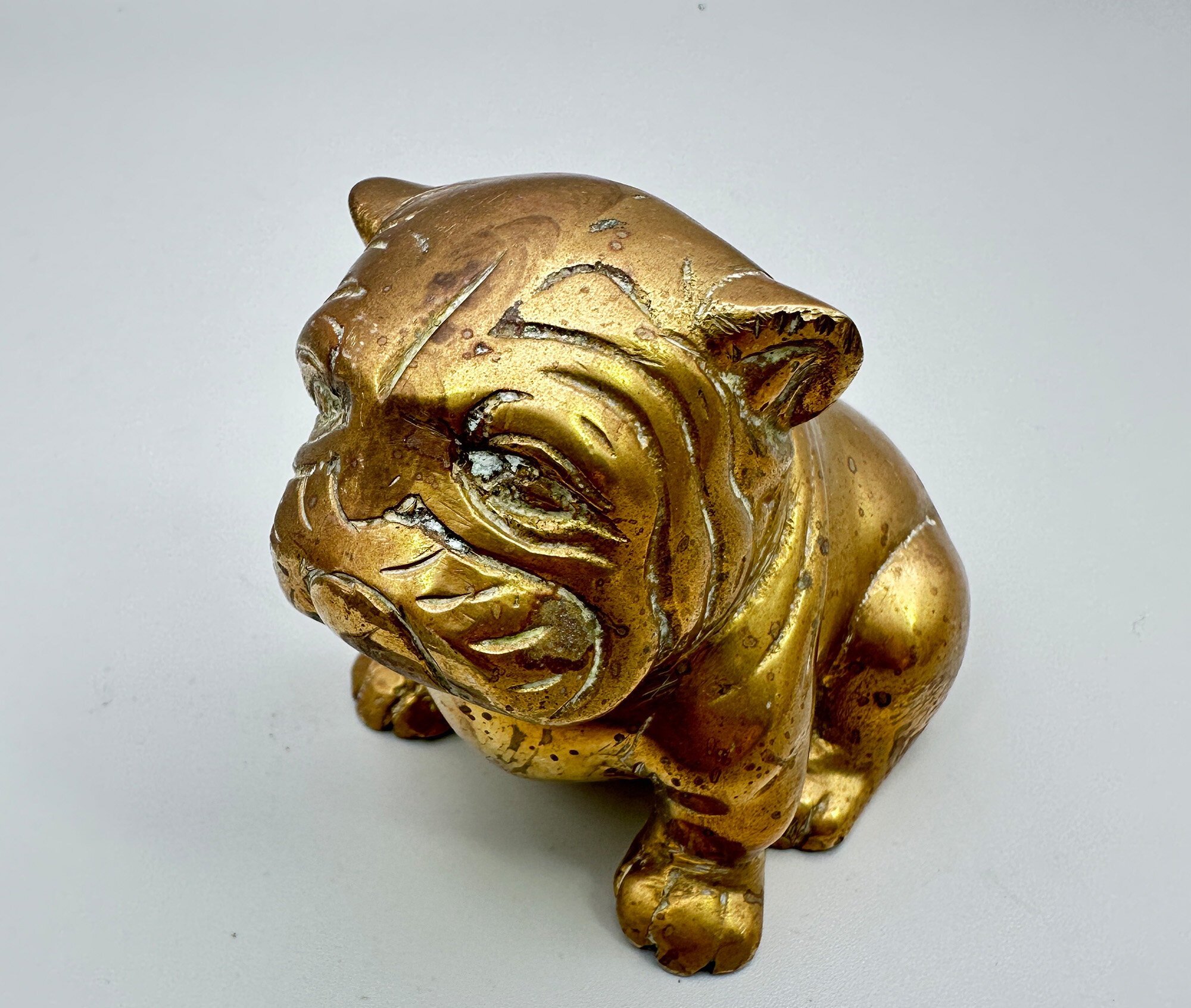 Two brass figures of bulldogs, one sitting erect and one crouching, each solid cast and expressively modelled. These small brass bulldogs are usually regarded as paperweights and appear to have been popular around the time of the second world war as an example of British stubbornness and tenacity. Some see reminiscences here of ‘John Bull’ and others the great ‘bulldog’ himself, Winston Churchill. Most likely, then, these two ‘mastiffs’ date to the 1940s and can carry out their function today just as well as they did all those years ago.| Size: | (i) Resting on front paws) Length (max) 10cm, Width (max) 6cm, Ht (max) 7.5cm (ii) Crouching) Length (max) 8cm, Width (max) 5.5cm, Ht (max) 7.2cm |