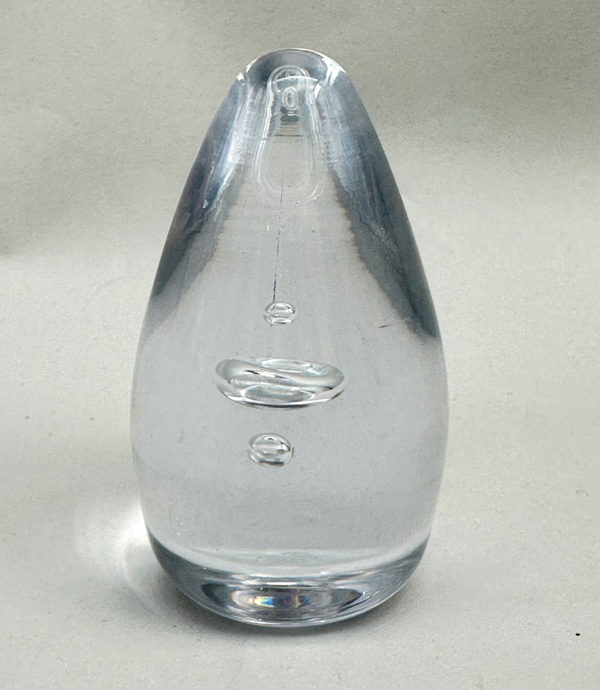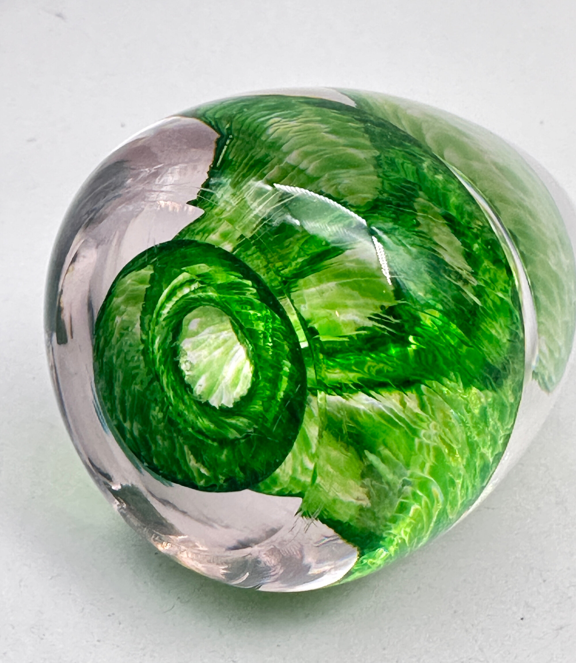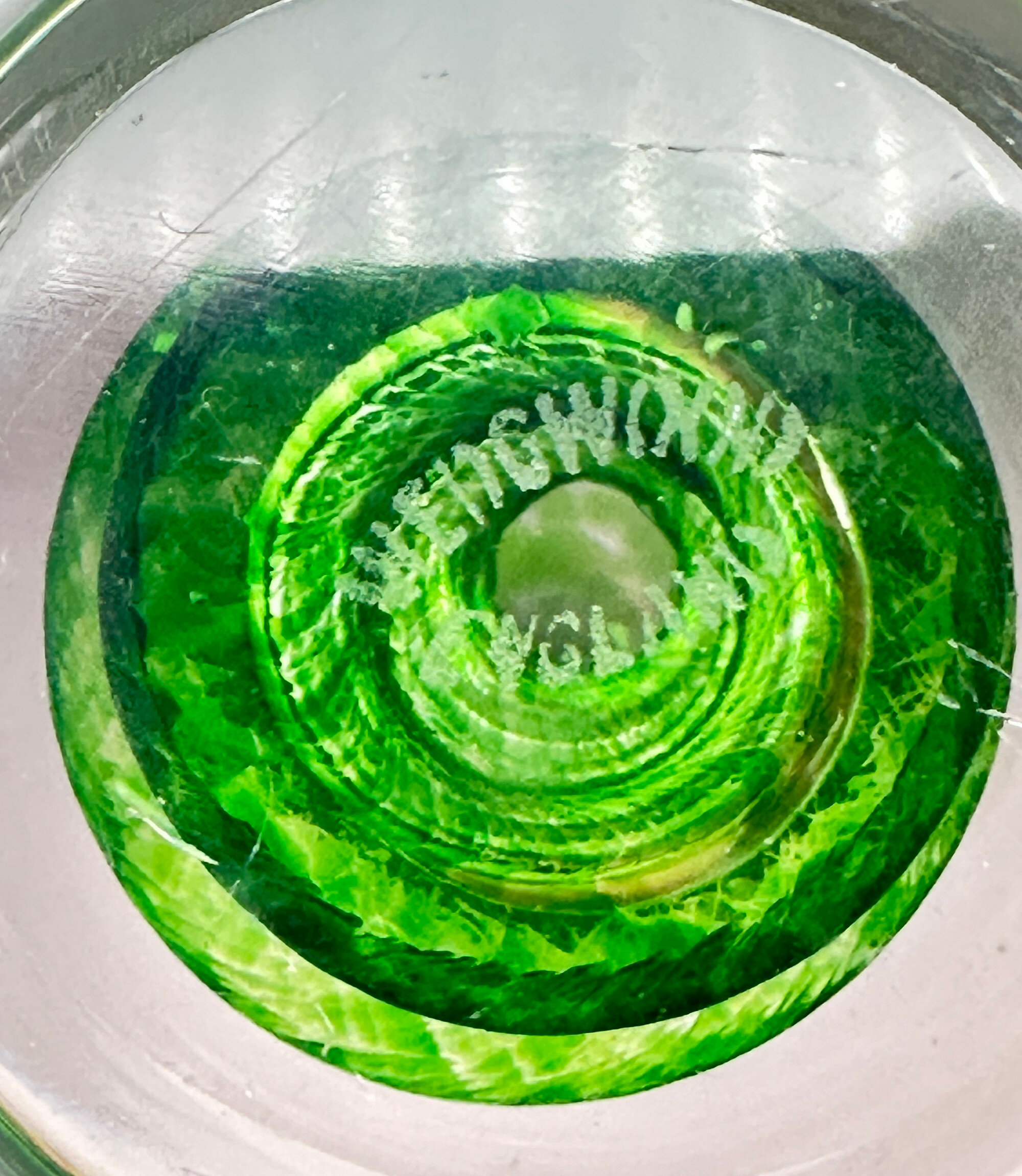 These are two Wedgwood Glass paperweights both of rounded conical form, one clear glass with small bubbles and one clear glass with speckled green large bubbles, a design understandably known as ‘topiary’. Both have acid etched marks to the base which can be read ‘Wedgwood’ ‘England’ although the mark on the first is off centre and indistinct (see image 5); this is compensated for by the attached paper label which also reads ‘Wedgwood’ ‘England’. Both were designed by Ronald Stennett-Wilson, one of the most prominent UK glass designers, who set up the firm King’s Lynn Glass in 1967. Before that he had worked for Swedish glass manufacturers and the influence of their styles can be seen in his own work. The clear glass example could be felt to recall Kosta Boda. King’s Lynn Glass was taken over by Wedgwood in 1969 and their name marked on its production thereafter, although there was apparently a slight delay in the delivery of the machine which was used to apply the marks, meaning that the very first ‘Wedgwood’ pieces are hard to identify. Stenett-Wilson remained as Managing Director and chief designer for Wedgwood’s newly acquired firm until his retirement in 1980. Many of the staff at King’s Lynn Glass when it started had worked in Sweden or Europe and they began to train local workers who followed, no doubt, the styles and techniques of their teachers. After Stennett-Wilson’s retirement, the firm was subject to various acquisitions and mergers, finally being sold to Caithness Glass in 1988 with the factory closing in 1992. These two pieces, then, are an excellent example of the Swedish inspired designs made by Wedgwood Glass in its early years. Both decorative and practical they can appeal to a specialist or non specialist alike.| Size: | Green 9.5 cm, clear 10.5 cm high |
