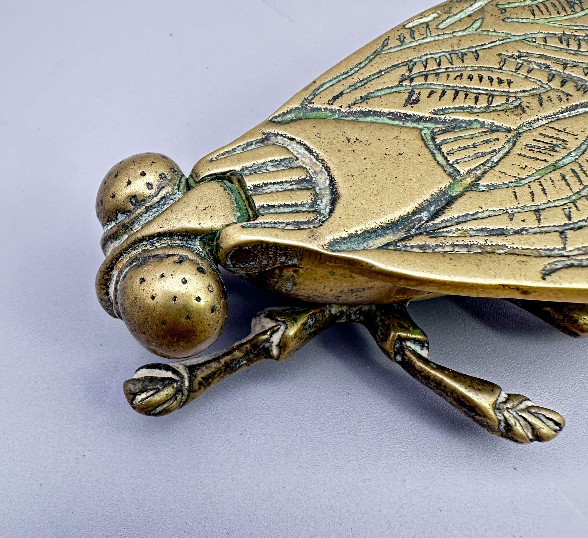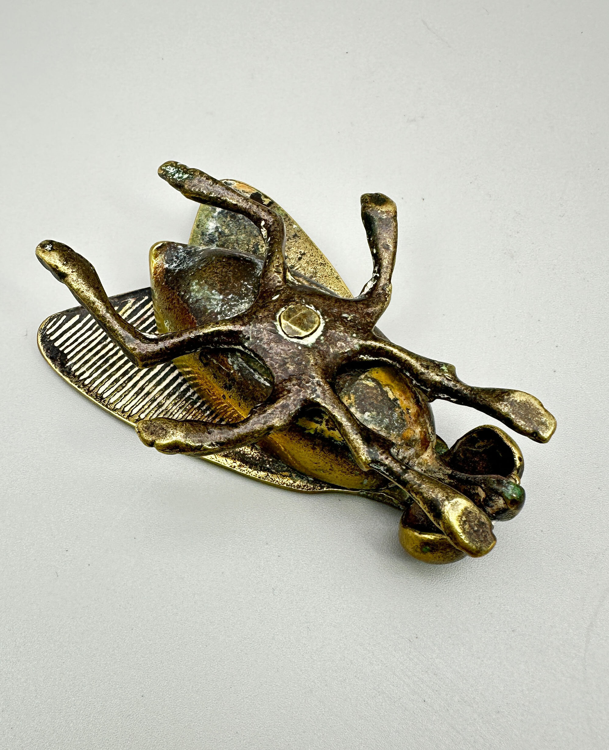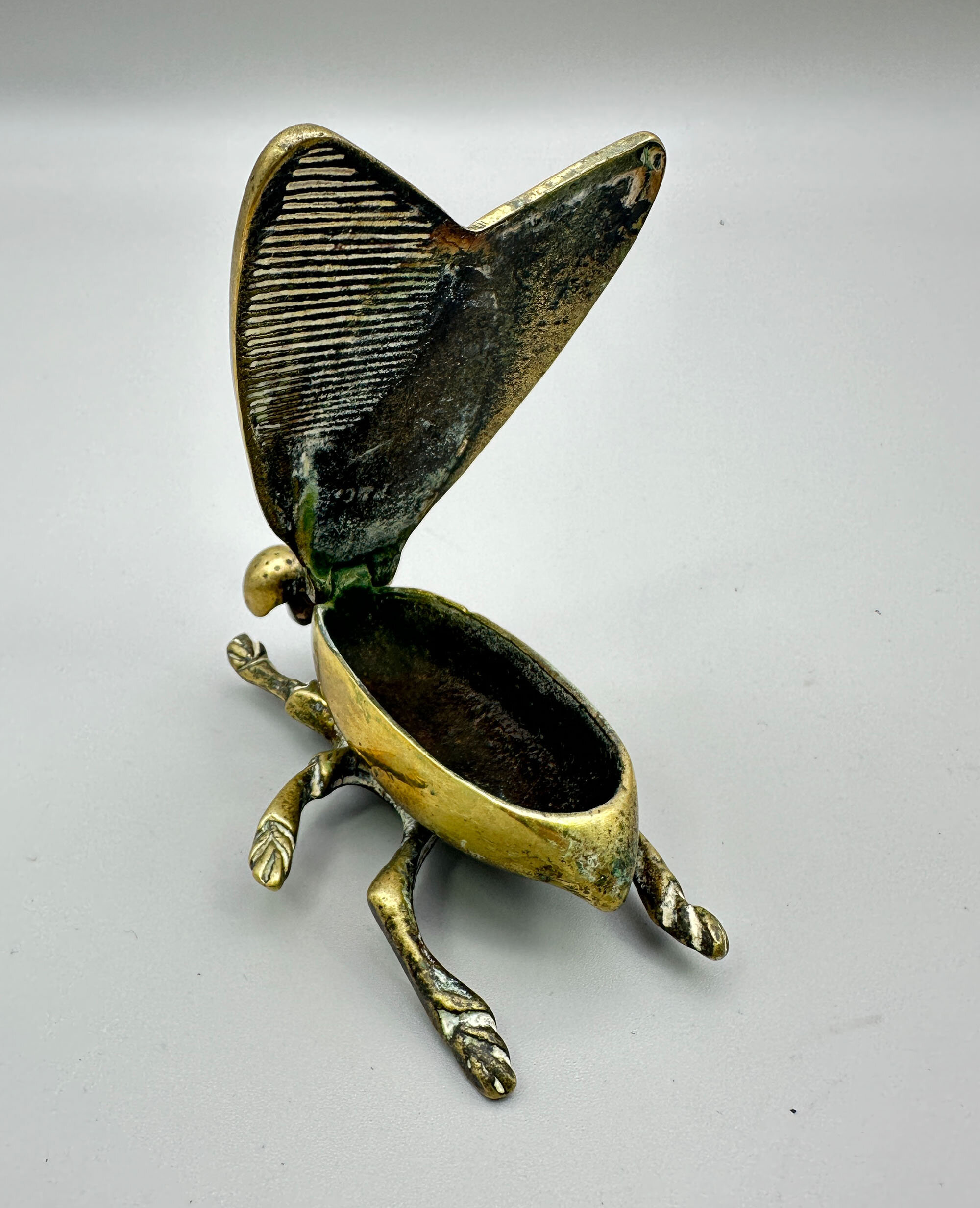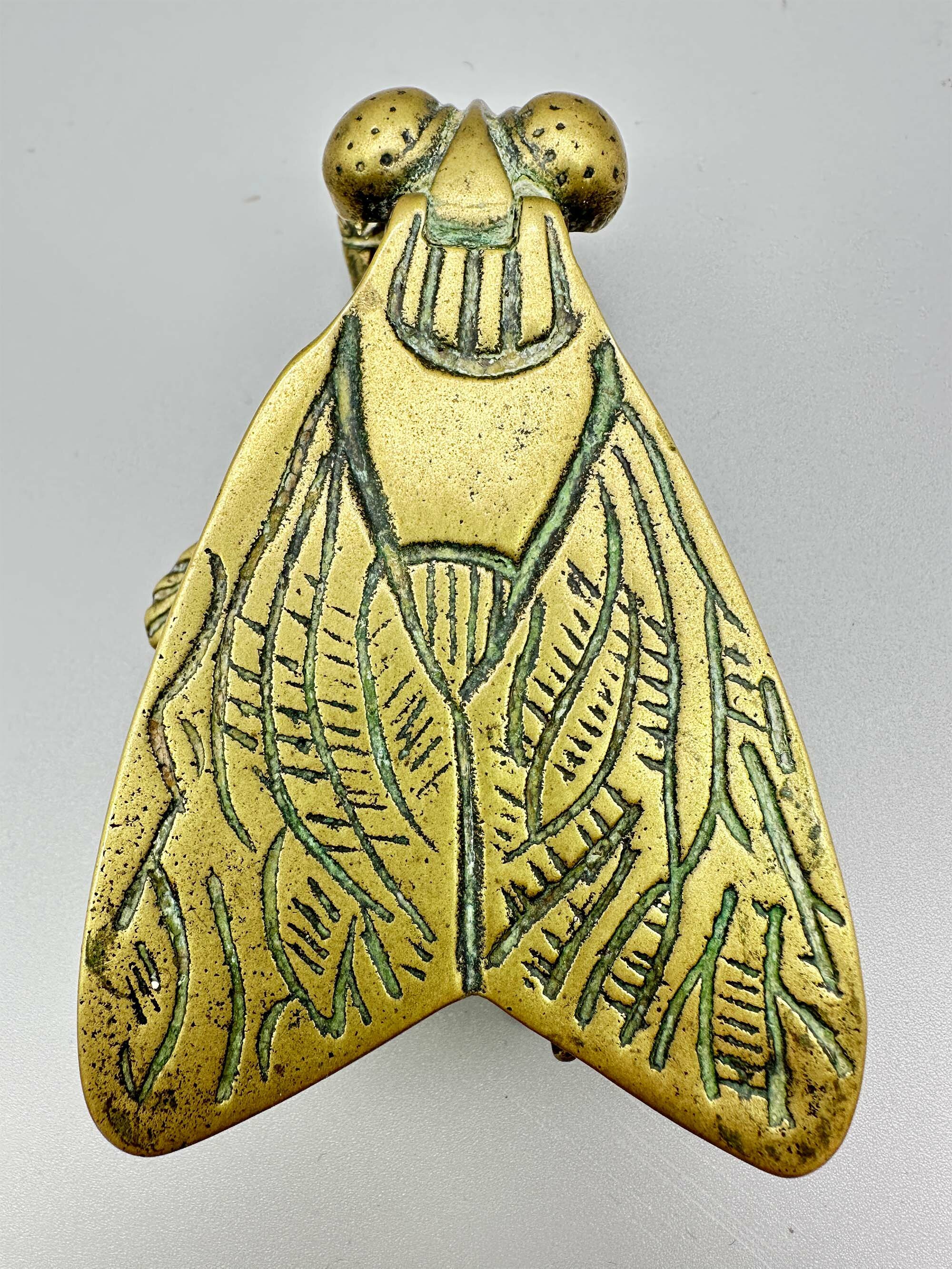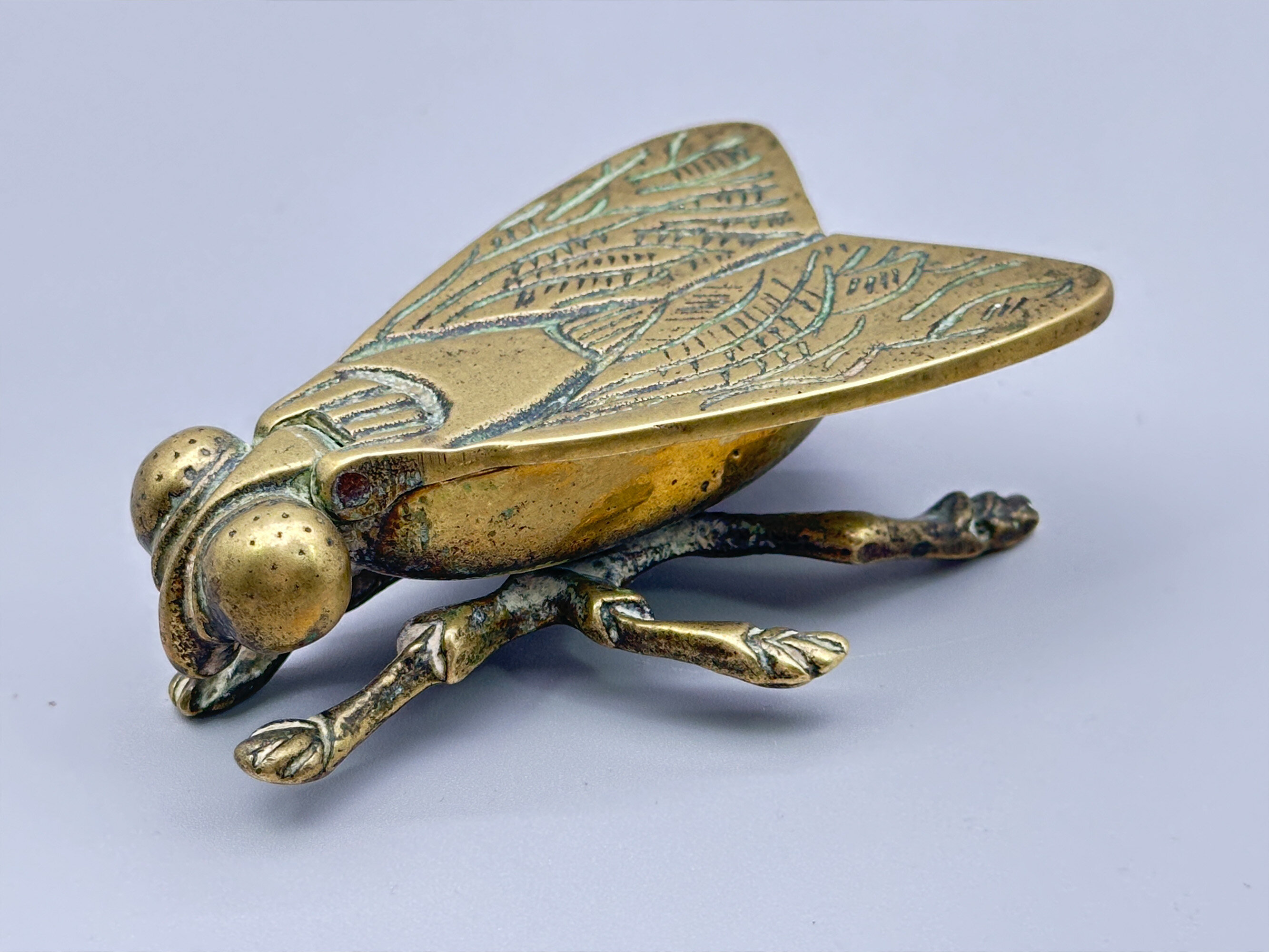 This is a vesta case in the form of a fly with a striker plate to the underside of one of its wings. Vesta was the Roman Goddess of the hearth, home and family and altars and temples dedicated to her commonly employed a live flame, which caused some manufacturers of matches in the nineteenth century to name their products 'Vestas', the most famous being the Swan Vesta match produced from around 1900. Early matches were highly combustible and cases to keep them safe were produced from around 1830 onwards. The peak of popularity of the 'Vesta Case' was around 1900 and their use declined in the 1920s when the first cigarette lighters were produced giving a probable dating here to the last years of their production. It is marked to the underside of the wings 'P&C' but this manufacturer cannot be identified.| Size: | Length (max) 9cm, Width (max) 6cm, Ht (max) 3cm |