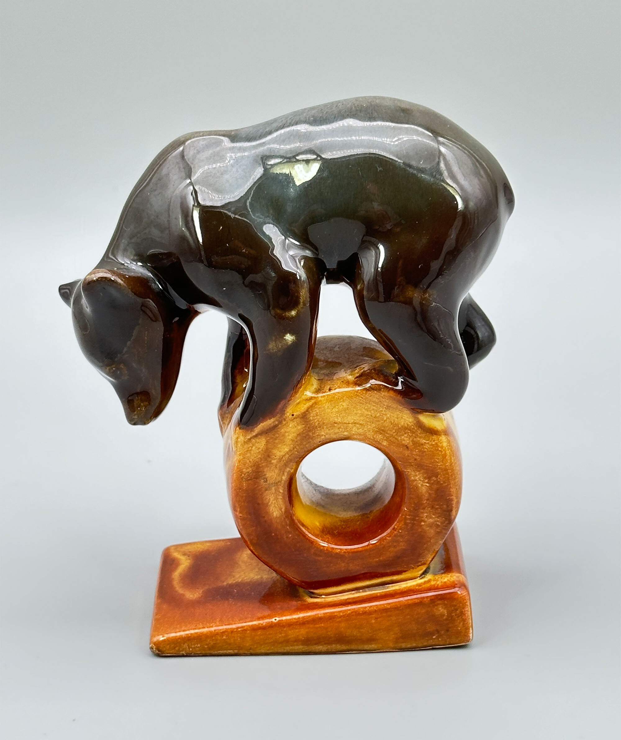 Figure of a Bear with hoop, Konakovo Faience Factory, USSR, marked, mid C20th