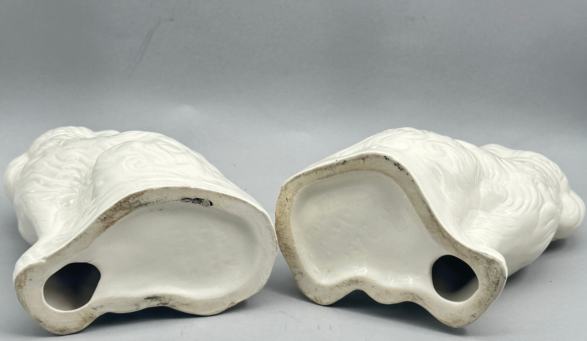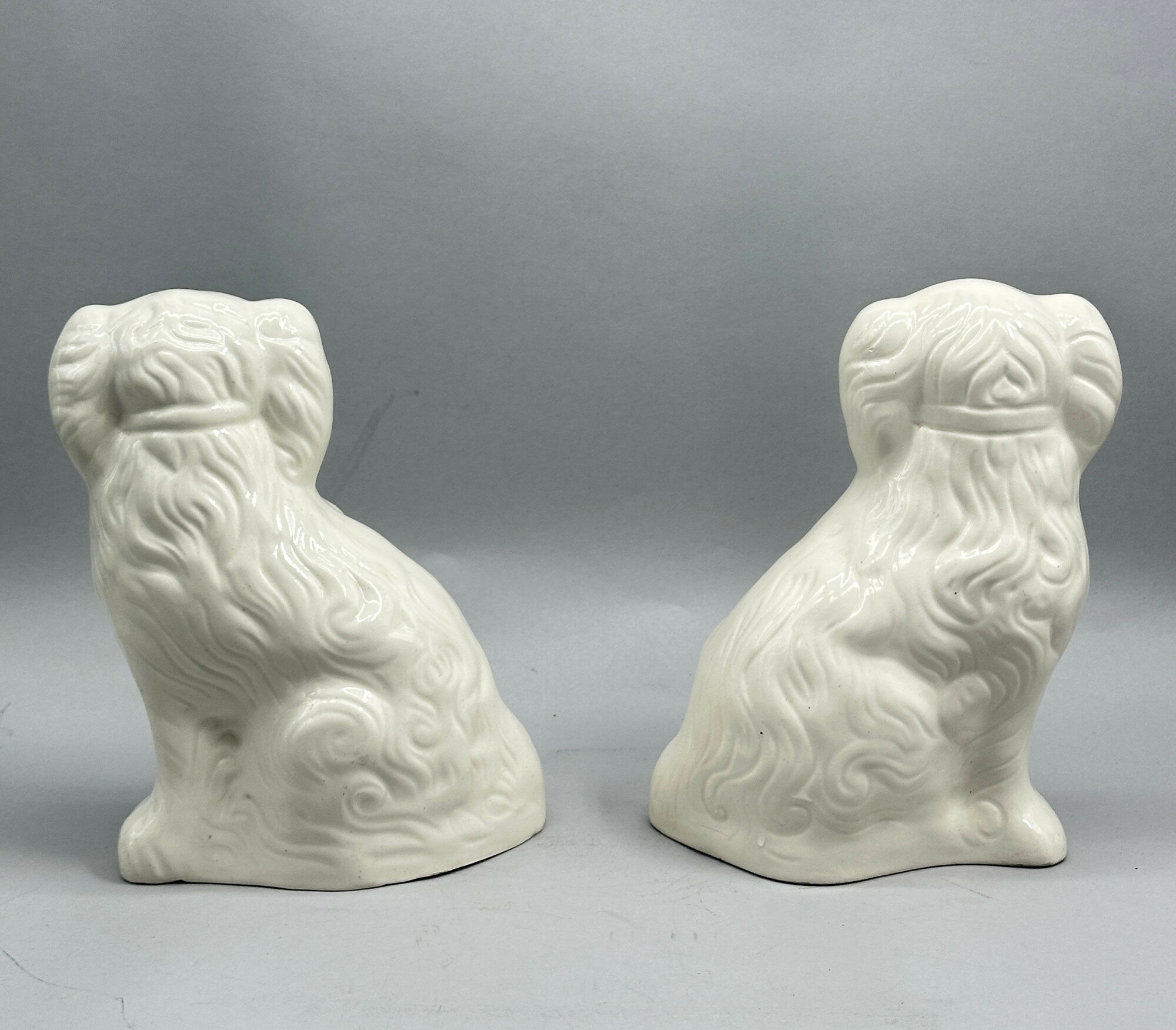 A pair of white glaze models of Spaniels, realistically modelled with detailing to the fur and faces, each in the traditional crouching pose and facing one another in mirror image, the bases pierced to assist firing and with rather indistinct impressed marks reading ‘BESWICK’ ‘ENGLAND’ ‘1378-5’.While a close relation to the traditional Victorian ‘Staffordshire Dog’, these figures were actually made by the English firm Beswick in the twentieth century. Founded in 1894 by James Beswick and his sons, the company became known for its output of figurines, eventually securing the rights to producing characters from the novels of Beatrix Potter and the films of Walt Disney. It was sold to Royal Doulton in 1969 who continued production until 2002, selling the pottery premises in 2003 and the rights to the name in 2004 when they were bought by Dartington Crystal who still manufacture pieces carrying the Beswick name. These spaniel figures appear to date from the 1960s and were made in at least two sizes. Most have painted decoration but the plain white finish here is really the most pleasing of all producing a pair of decorative items with timeless appeal.