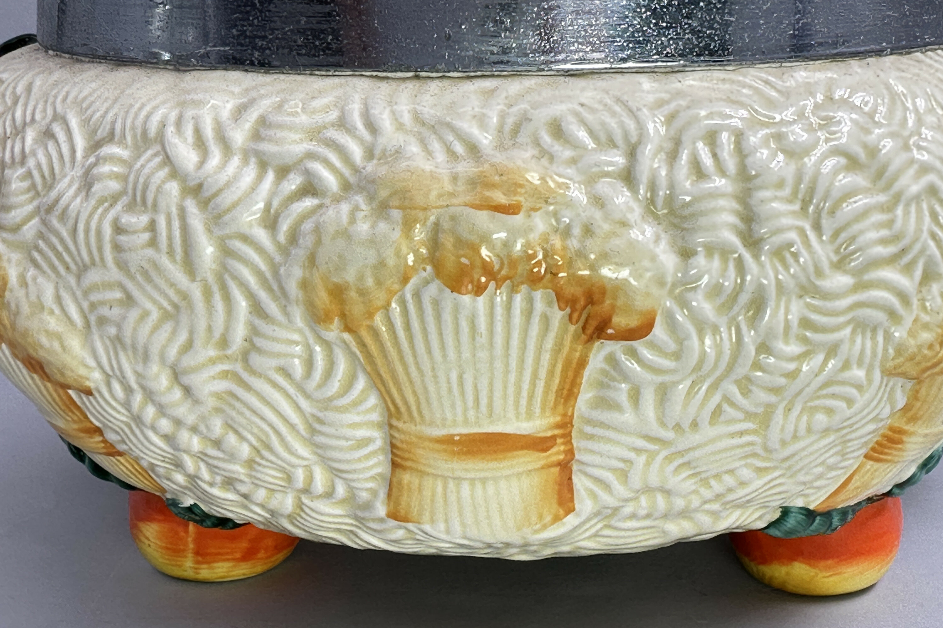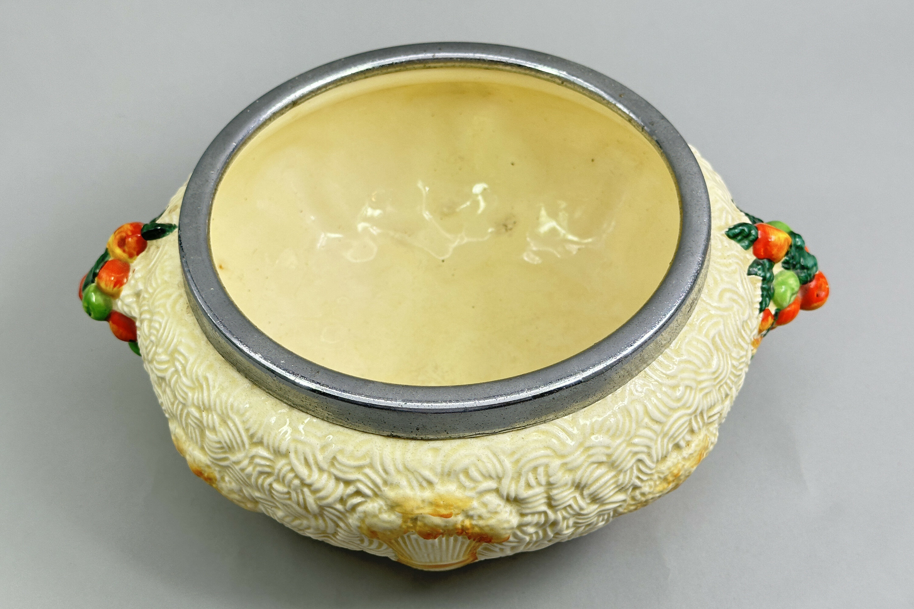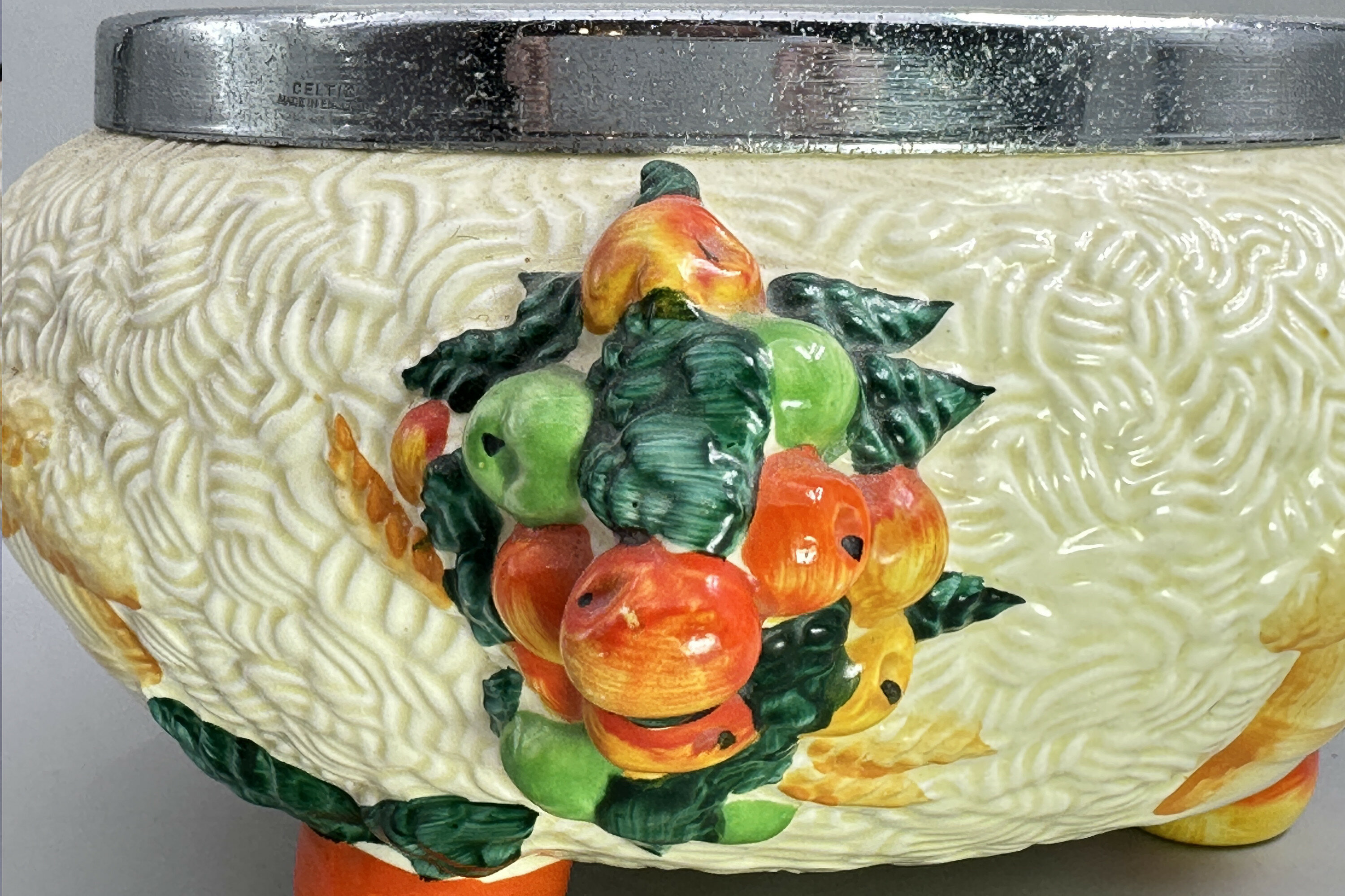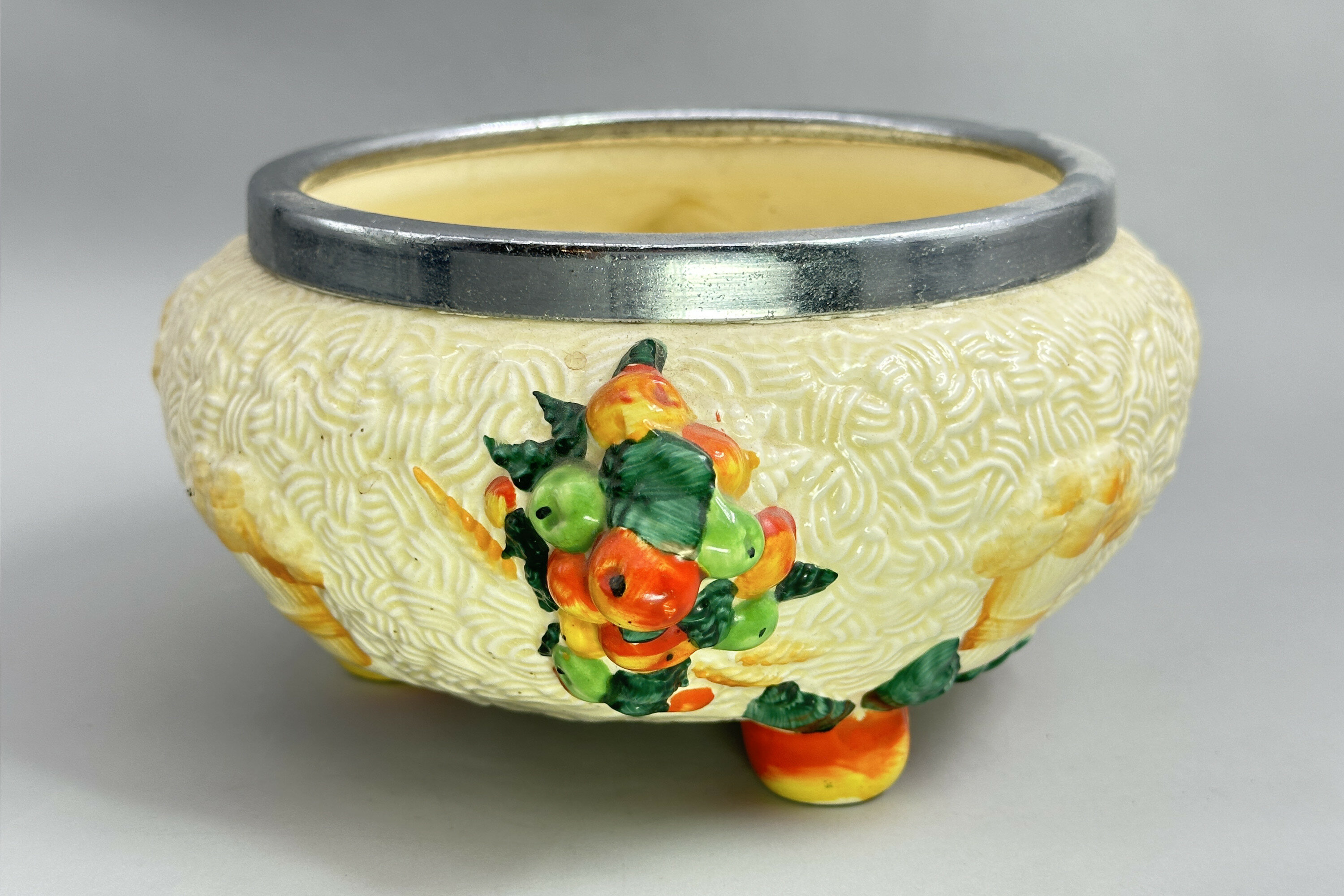 A ceramic bowl with a bulbous, squat body and three ball like feet, the body with moulded decoration of wheat sheaves and fruit in brightly coloured enamels on a beige raffia style background, the rim with a chrome metal band, the base with transfer marks ‘Celtic Harvest’, ‘Clarice Cliff’ ‘Newport Pottery Co’ ‘England’. Born in 1899, Clarice Cliff began with a varied career in apprentice roles in the North Staffordshire Potteries, at that time the major employers in the area of women. At the age of 17, she was working with the firm A.J.Wilkinson, owned by the Shorter family, and some of her designs began to appear in their pattern books soon after. In the late 1920s, she experimented with novel and bold designs termed ‘Bizarre Ware’ which met with unexpected success, much to the surprise of Wilkinson’s salesmen. A wide range of pieces in the style was then produced and named ‘Handpainted Bizarre’ by the managing director of Wilkinson’s, Colley Shorter. The ‘Crocus’ and ‘Conical’ ranges then followed and in 1930 Cliff was made Art Director of the firm, soon to be supervising a workforce of up to 1000 at the Newport Pottery. In 1940, she married Colley Shorter, after the death of his first wife, and her career came to an end, decorated pottery being prohibited during the second world war. Shorter died in 1963 and the following year Cliff sold the business to Midwinter Pottery. A recluse for many years, she died in 1972. The ’Celtic Harvest’ range was typical of her work and comprised a wide variety of serving pieces all decorated in the same style. This Centrepiece bowl was probably intended for fruit and like all the other examples is fitted with a chrome metal rim. Dating is most likely to the 1930s.