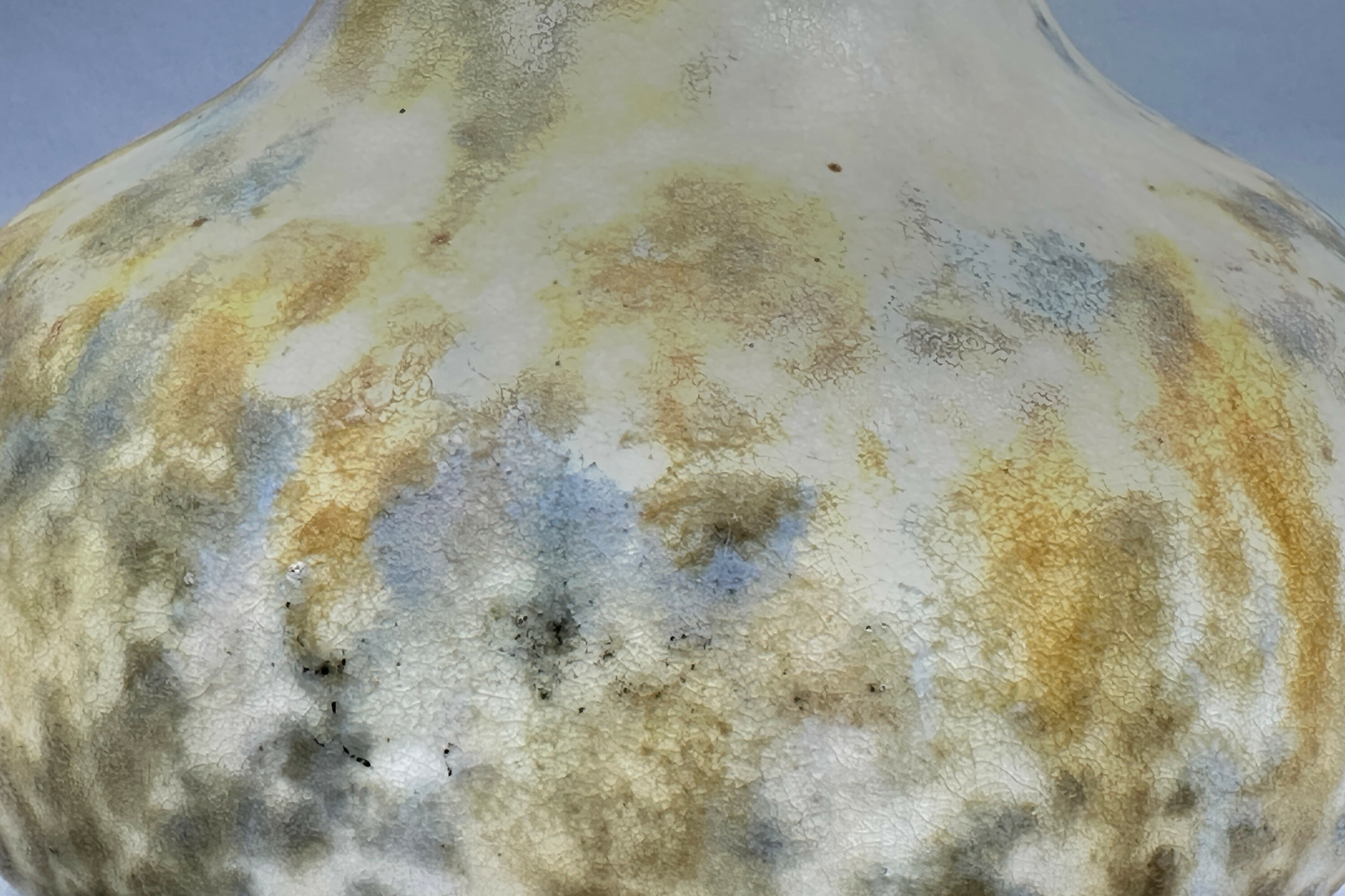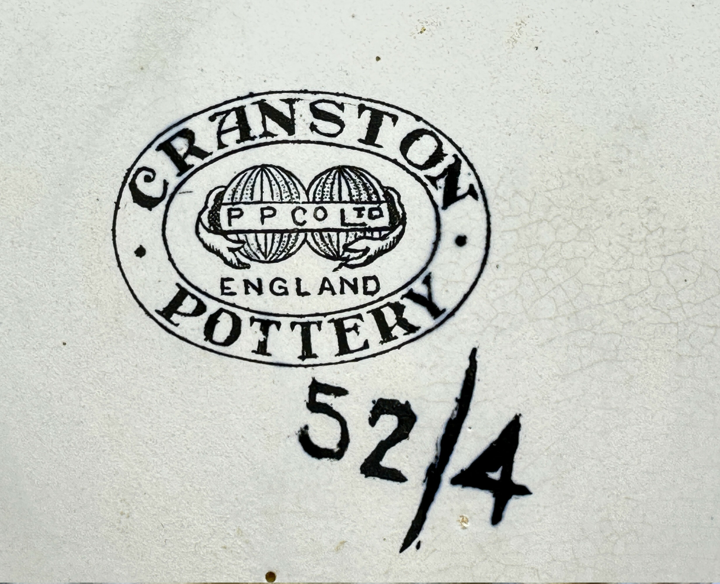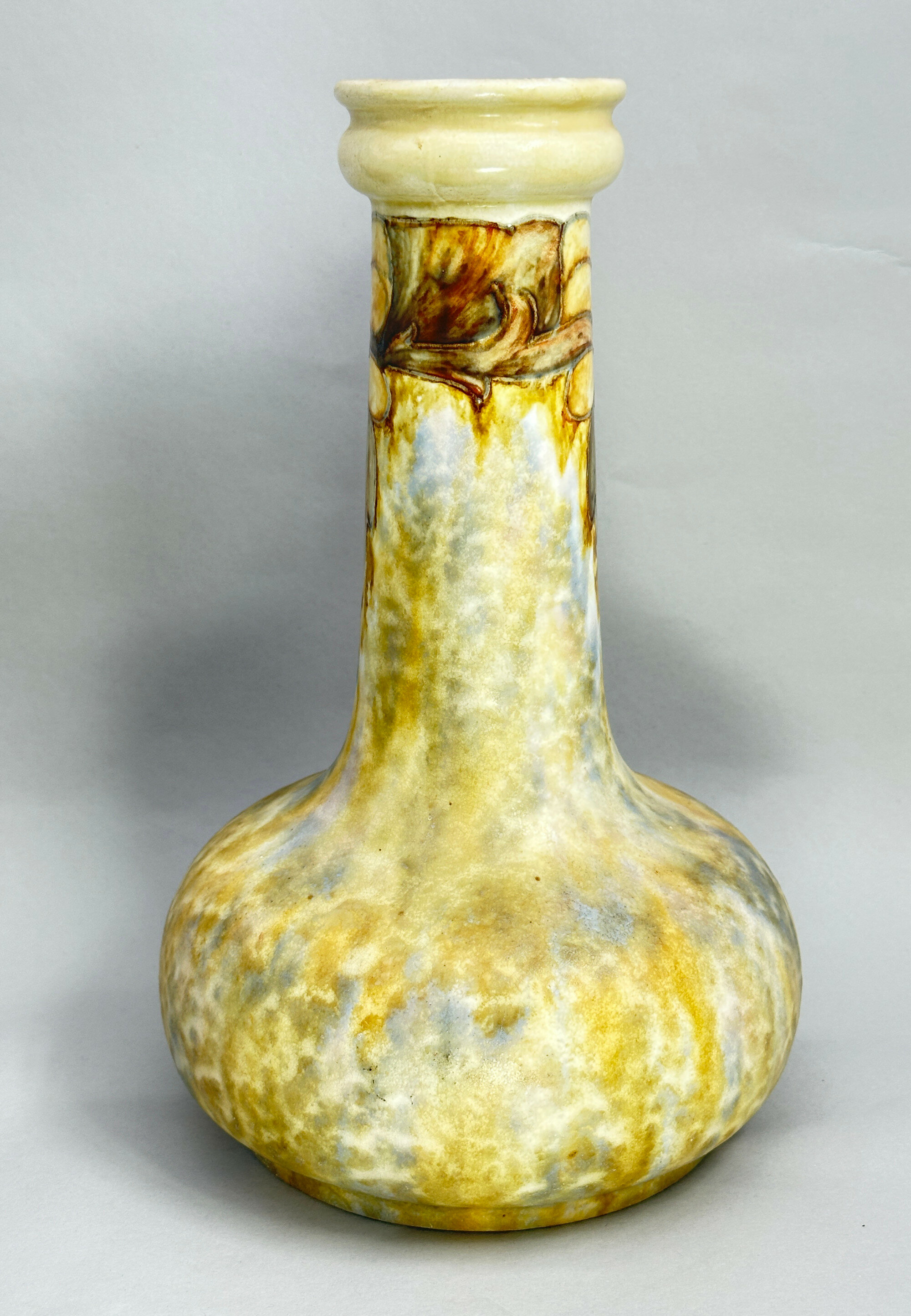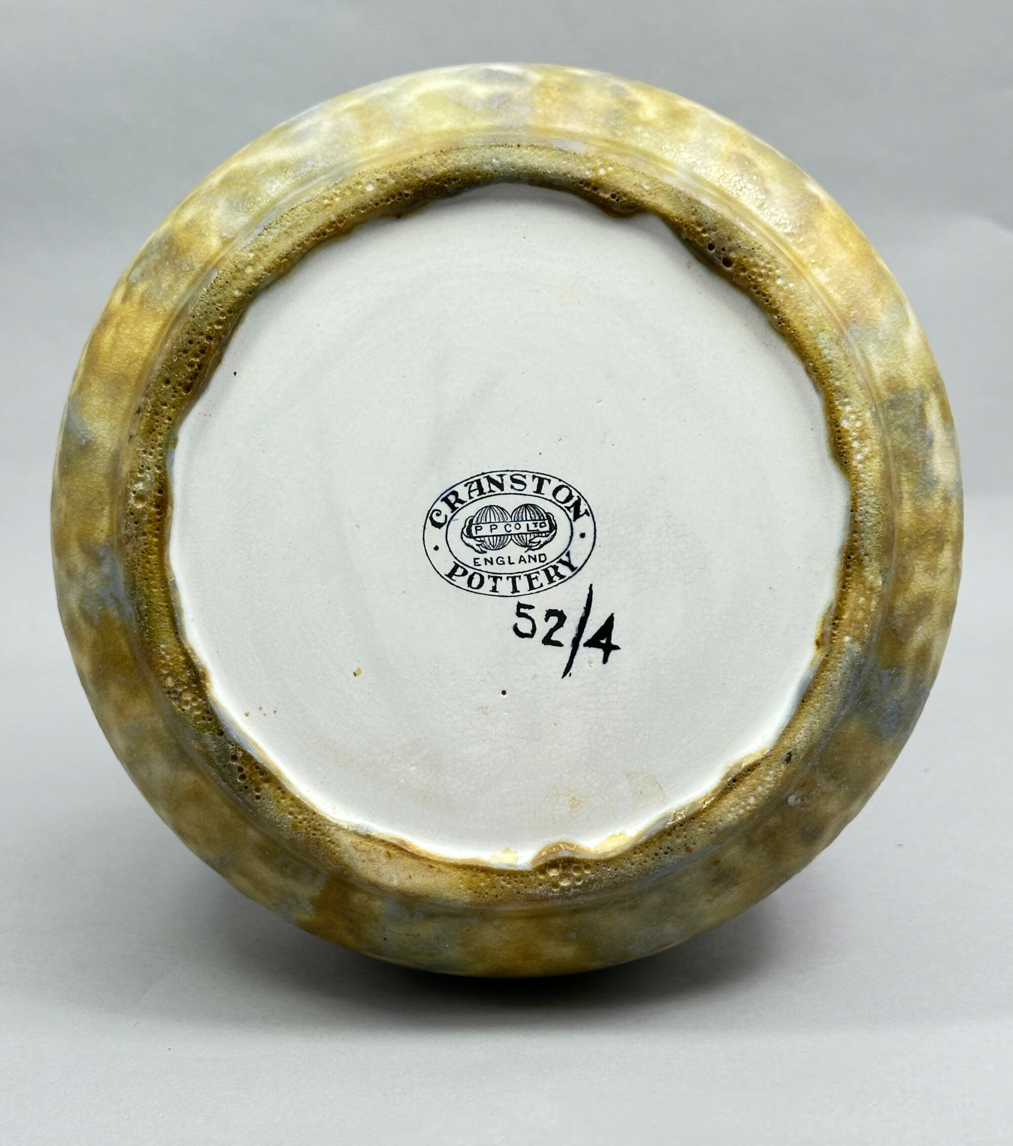 A ceramic vase of bottle form, the broad compressed globular body with a tubular neck terminating in a ‘garlic’ rim, glazed overall in a mottled effect employing tones of mustard, blue and green with two stylised motifs of leaves and grapes on the neck, the interior also with a mottled glaze and the base glazed white with a stamped mark ‘CRANSTON’ ‘POTTERY’ in an oval frame with two globes in the centre displaying a banner ‘P P CO LTD’ and a script mark ‘52/4’.Cranston Ware was one of the ranges produced by the Pearl Pottery Company, based in Hanley, Stoke on Trent. Founded in 1892, the firm produced a varied selection of ceramic wares, often following contemporary fashions, until its closure in 1947. This vase is demonstrably in the Art Nouveau style and would have been produced when it was at its zenith in the early 1900s. The pattern was known as ‘Tukan’ ware and some of the pieces, but not all, have an impressed mark displaying this. This is an excellent example of the type with the glazes and decorative detail well rendered and certainly deserves the attention of collectors of Art Nouveau.
