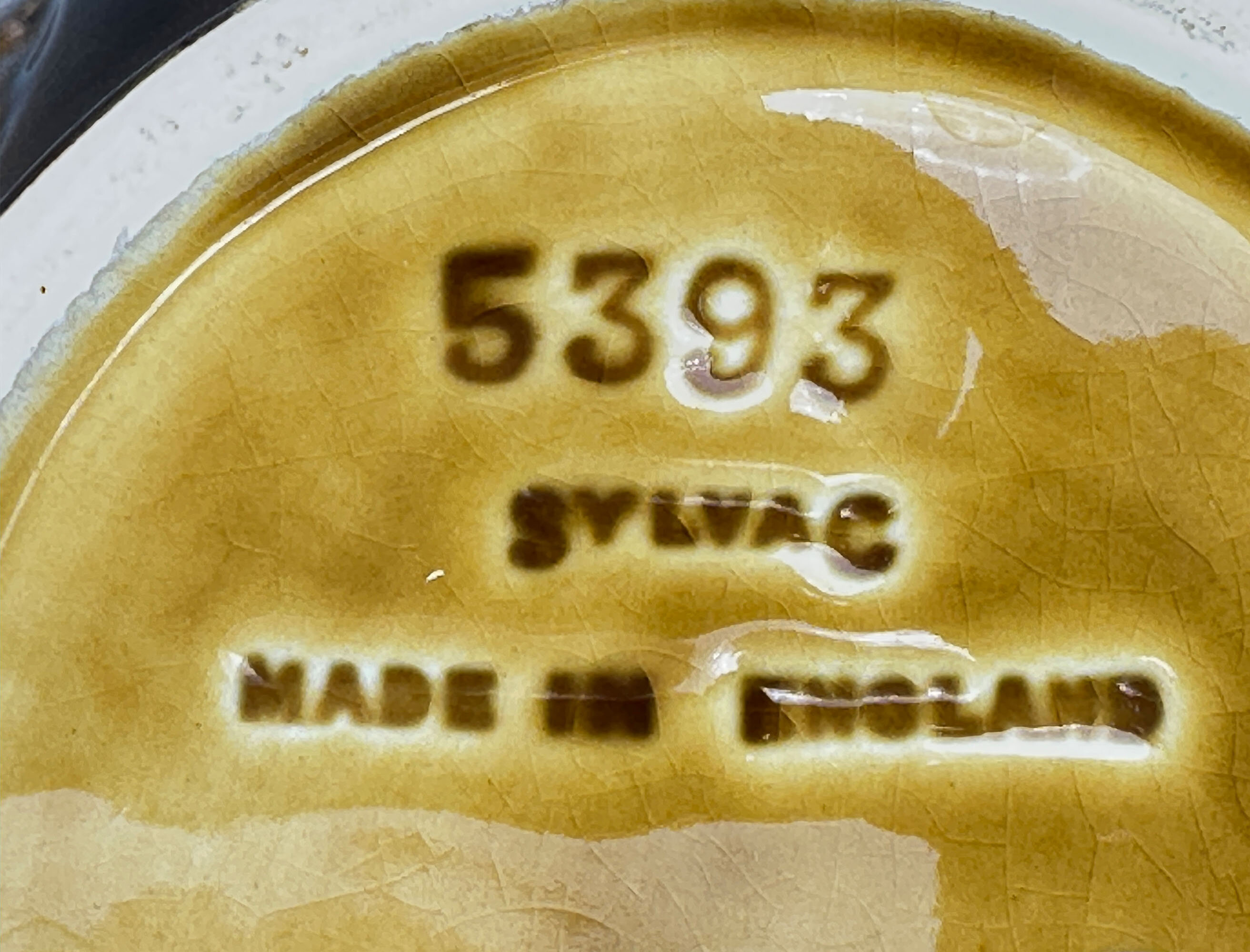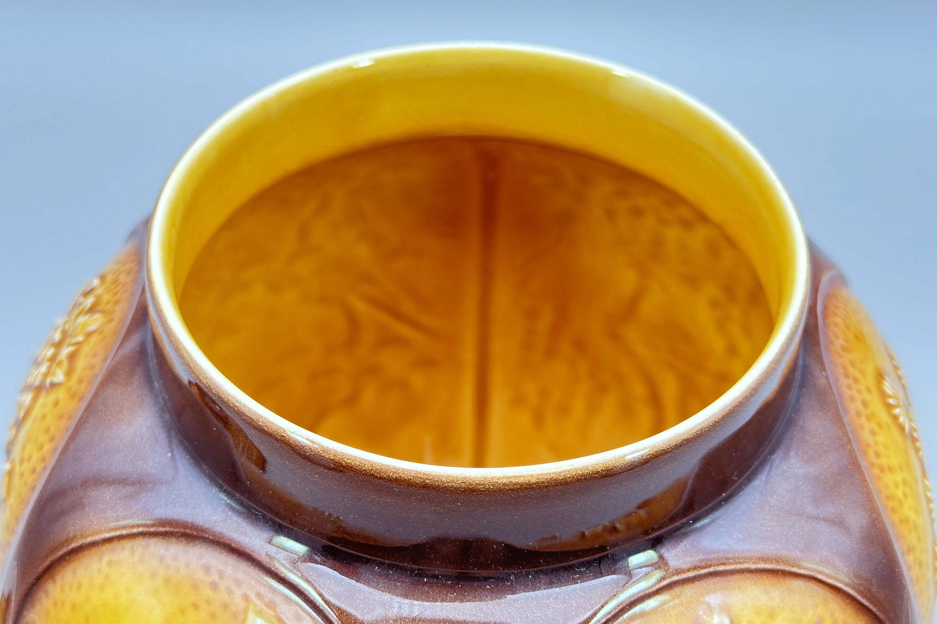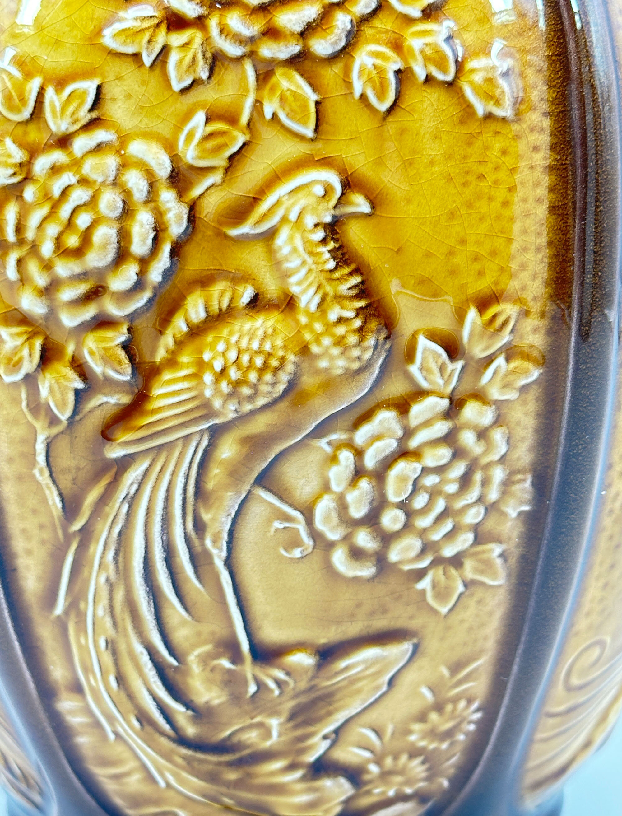 An exceptionally large jar and cover of ovoid form with a short straight neck, the cover of flaring conical form with a complementary small flaring conical form finial, the decoration comprising moulded mustard glaze panels (birds and flowers/pine trees) with brown glaze borders, the lid similarly decorated with flowering peony, the base with impressed marks ‘5393’ (the pattern number) ‘SylvaC’ ‘Made in England’ and a foil label, partially rubbed.The format of the label (the complete version can be seen in image 9) dates this piece to the 1970s The design here with its Oriental influence and often termed ‘Canton’ was one of the most successful produced by Sylvac in the post war years. It was made in a variety of colourings and a variety of sizes, this example being exceptionally and unusually large making it a striking decorative accessory for a modern interior.