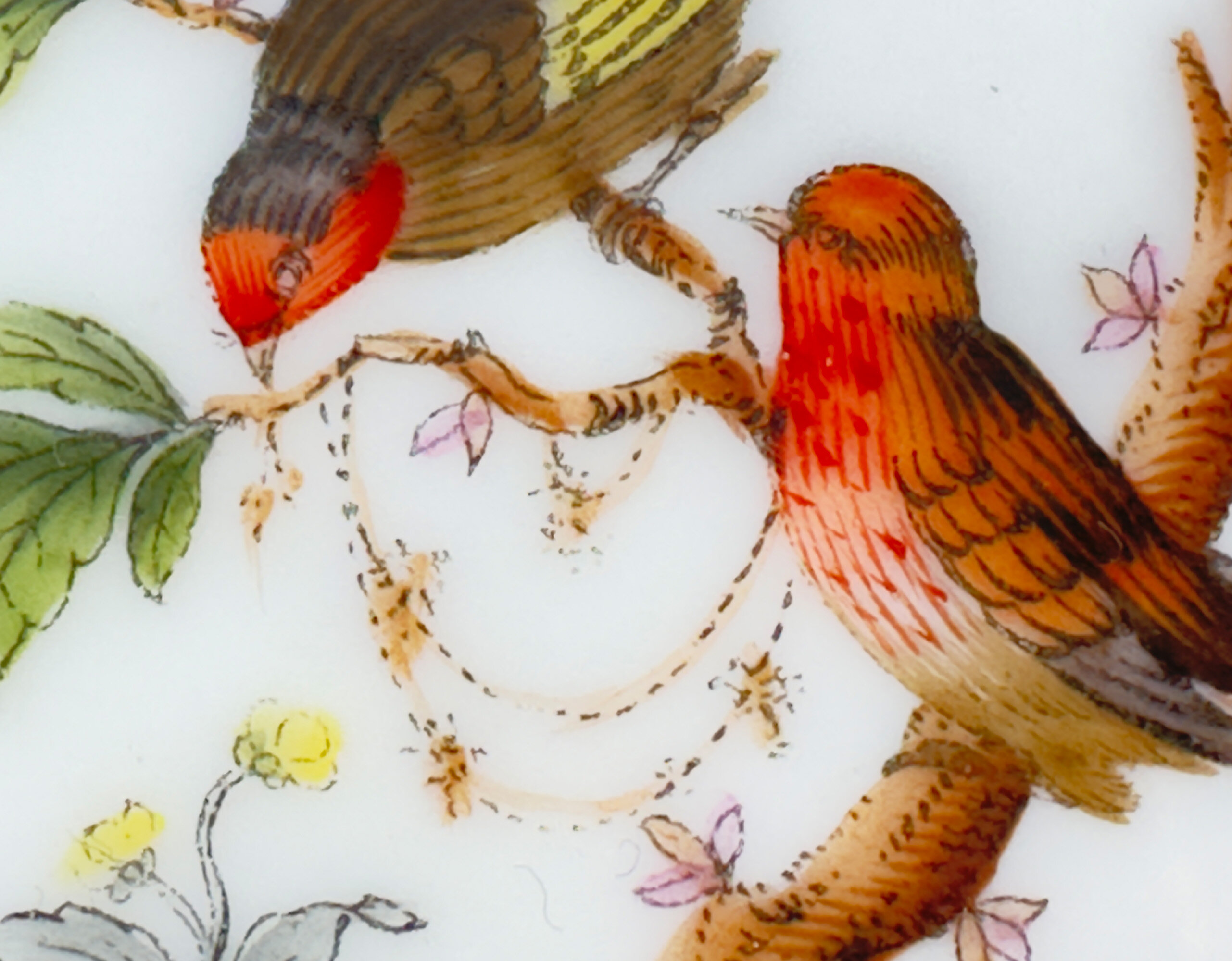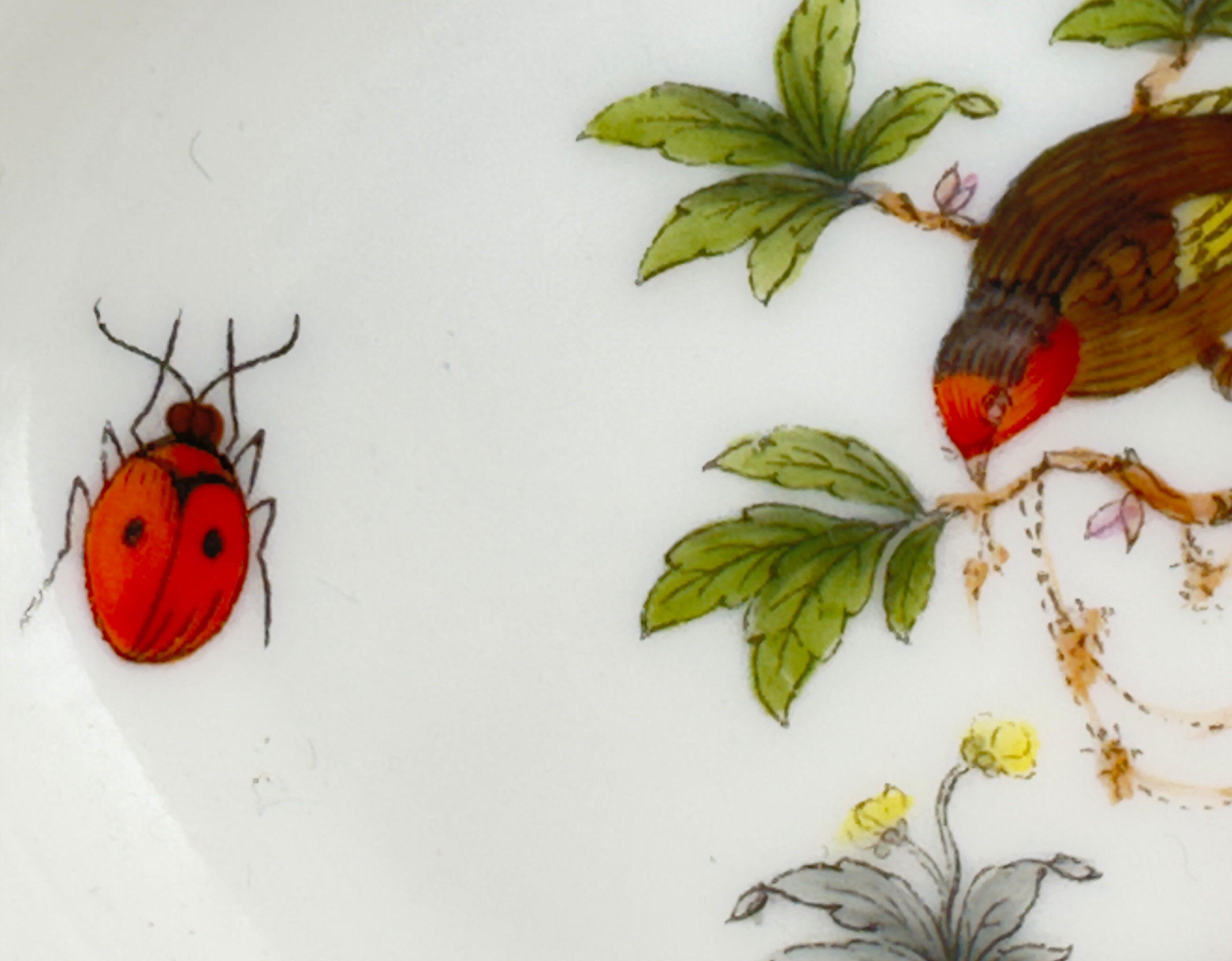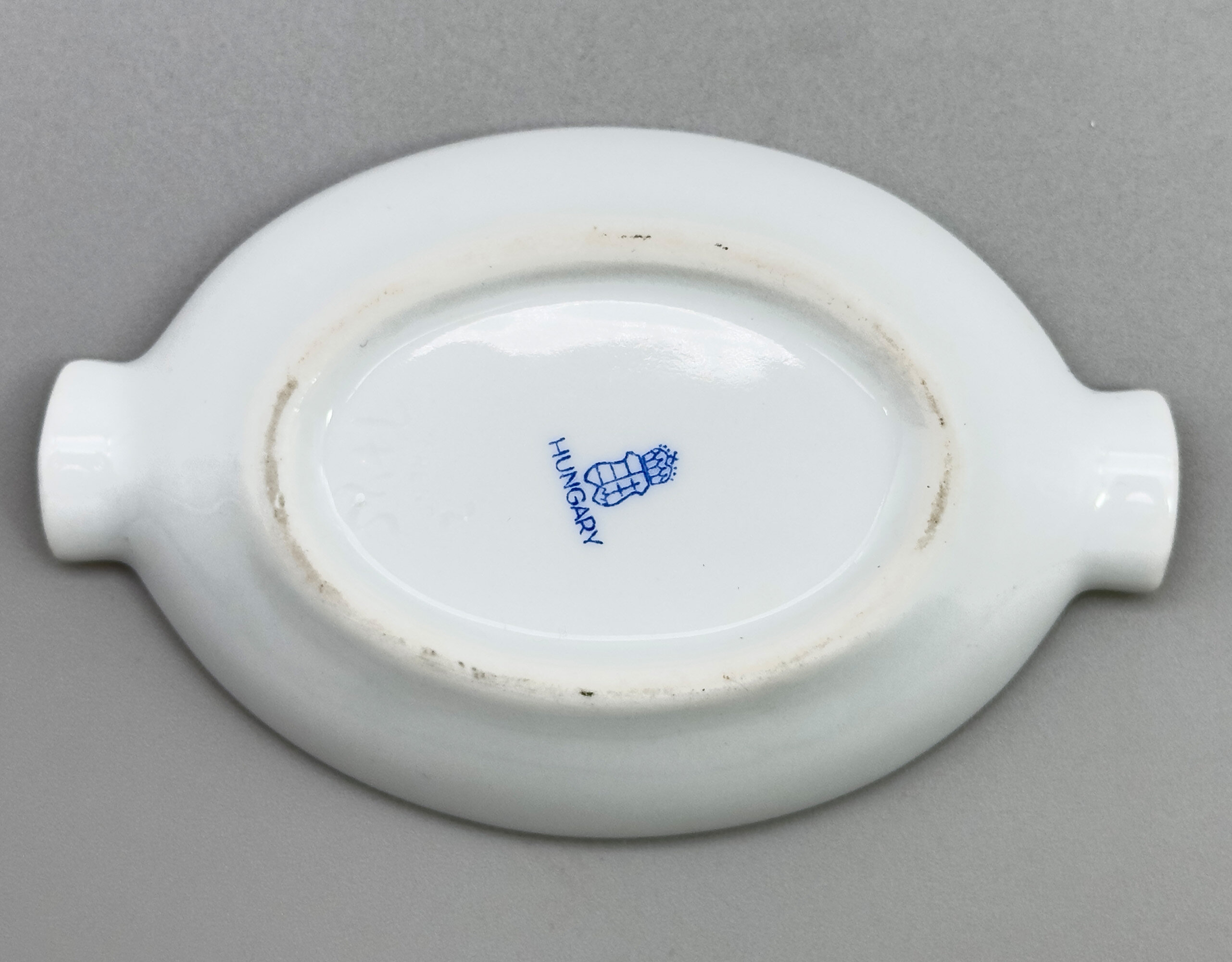 A small fine quality porcelain oval shallow dish with semi circular ‘handles’ at each end, delicately decorated in coloured enamels with birds on a branch and insects, the reverse with a blue printed crown and castle mark above the lettering ‘HUNGARY’ and impressed marks ‘HEREND’ and the numbers ‘XXXX’ [CHECK].This dish was made by the Herend Porcelain factory. Founded in Hungary in 1826 it almost immediately enjoyed enormous popularity with wealthy customers including members of the European aristocracy. Production continued into the twentieth century through nationalistion in 1948 and reprivatisation in 1993 and continues to the present day. Many of the patterns created in the nineteenth century are still reproduced. The design here is known as ‘Rothschild Bird’ doubtless from its first purchasers all those years ago. The format of the mark allows a fairly close dating to the years 1915-1930, making this an earlier version of the model than many others which appear on the market today.