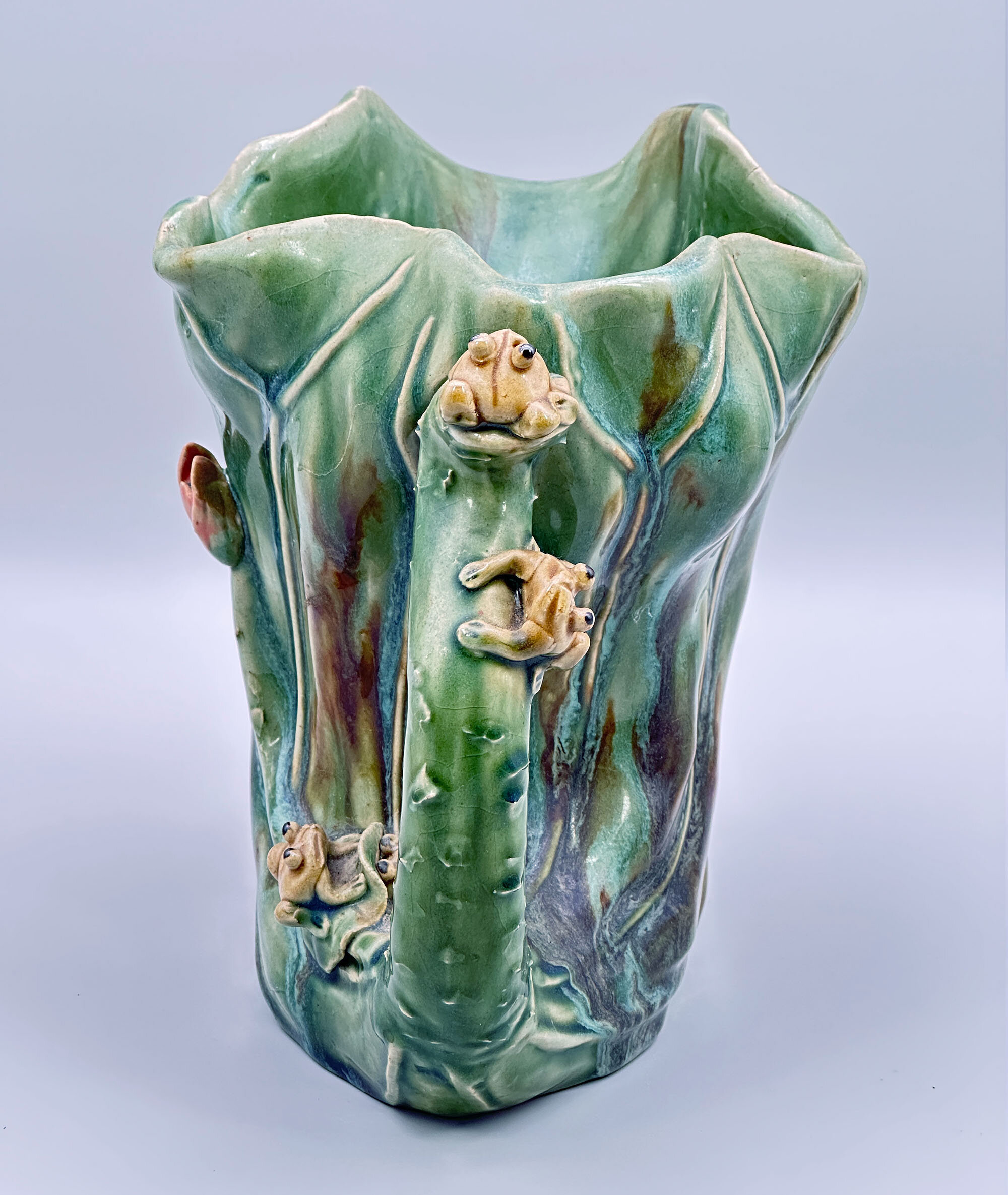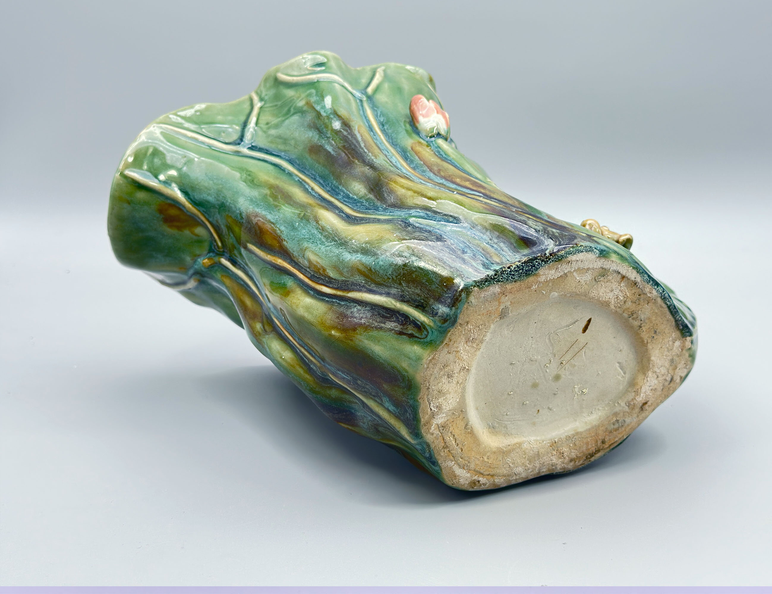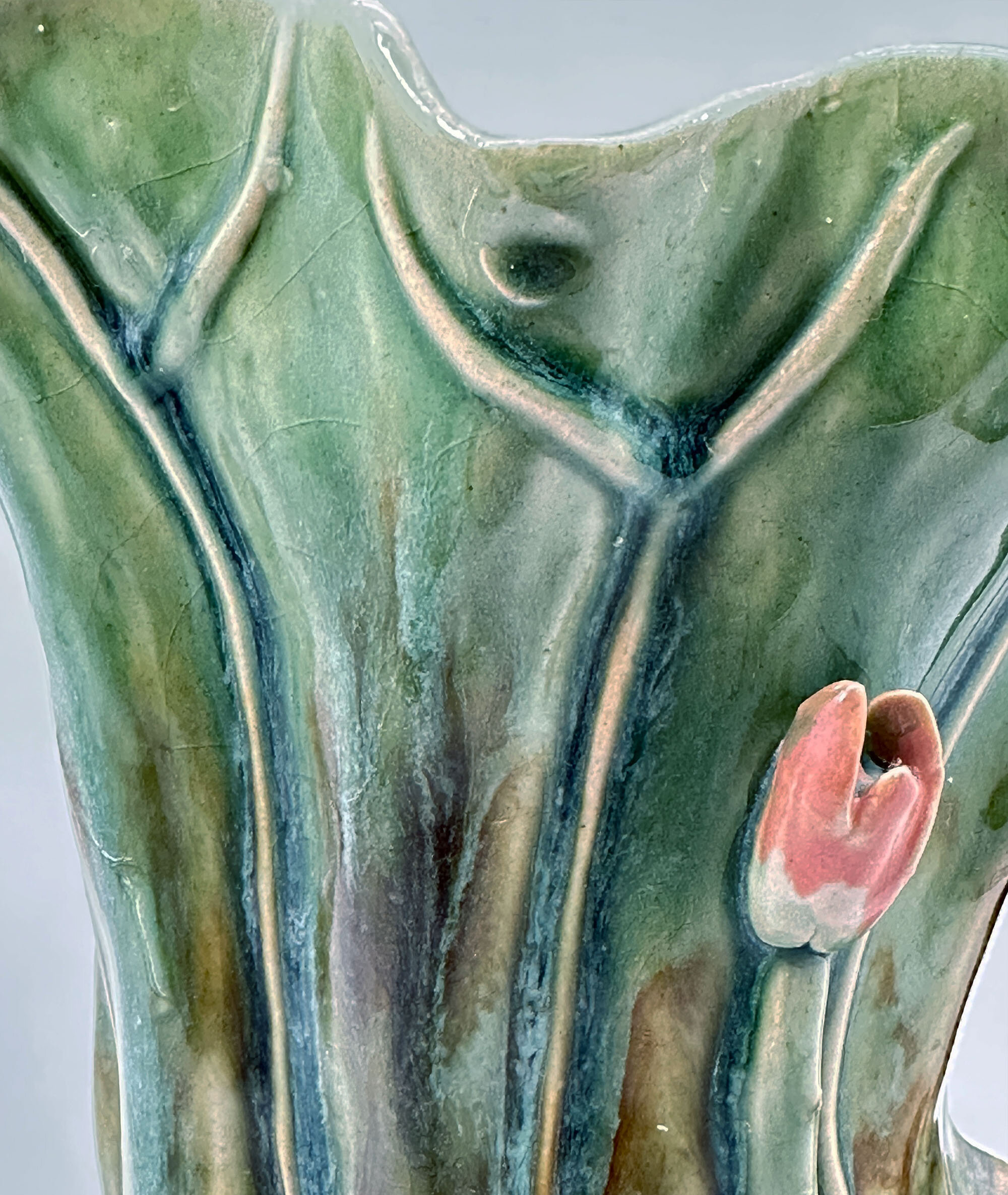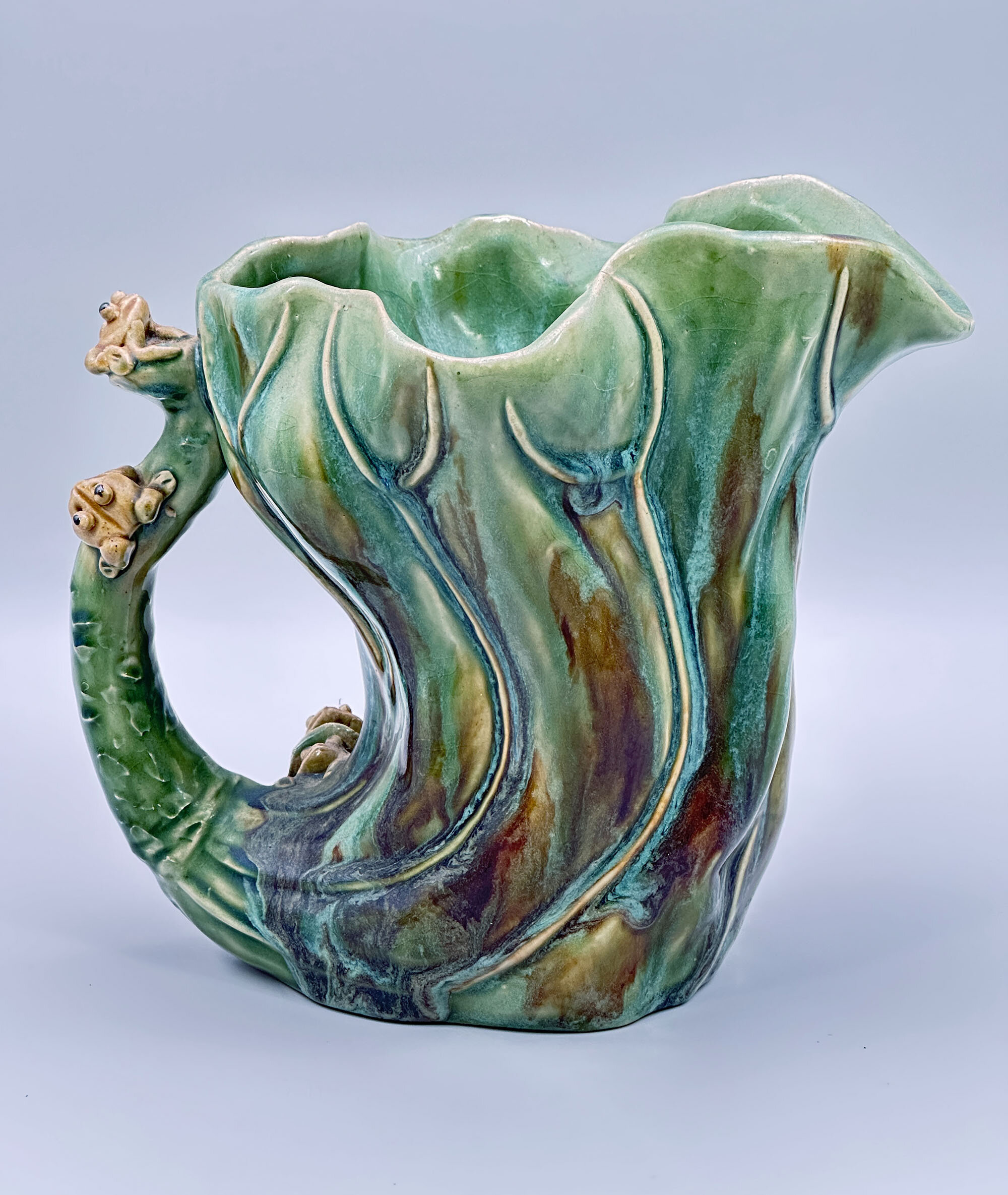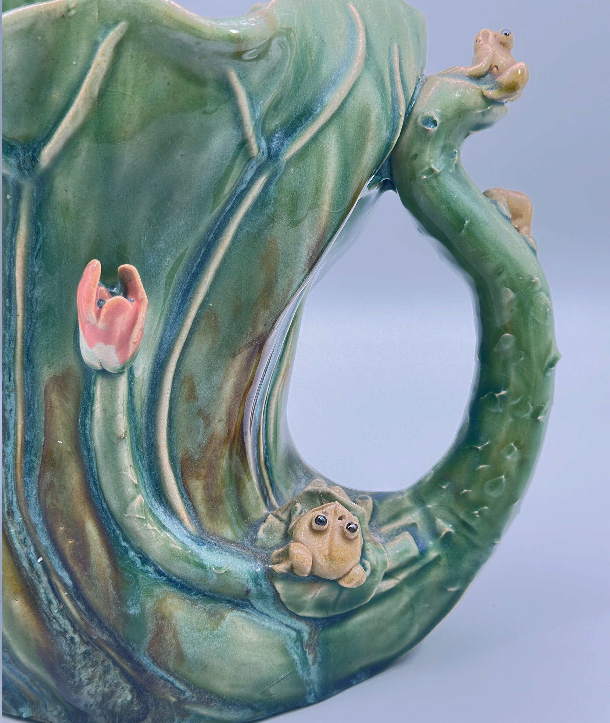 A majolica jug of naturalistic form, the body modelled as lotus leaves with one pink bloom and the handle as a thorny curved branch on which sit three frogs, the glaze a mixture of greens, blues and brown and the frogs deep beige with their eyes picked out in black, the footrim of the base showing a coarse, near stoneware finish. The work here is almost certainly continental and the closest resemblances to this whimsical creation, not that there are any direct parallels, are to be found in Portugese pottery, which did have a tradition of naturalistic pieces, for example Mafra Palissy ware or pieces from Caldas da Rainha, which continues today. Dating is a matter of guesswork but probably, at least, most likely to be in the second half of the twentieth century.| Size: | Ht (max) 23cm, Width (max) 23.5cm, Depth (max) 17cm, Base (max)14cm x 10.5cm |