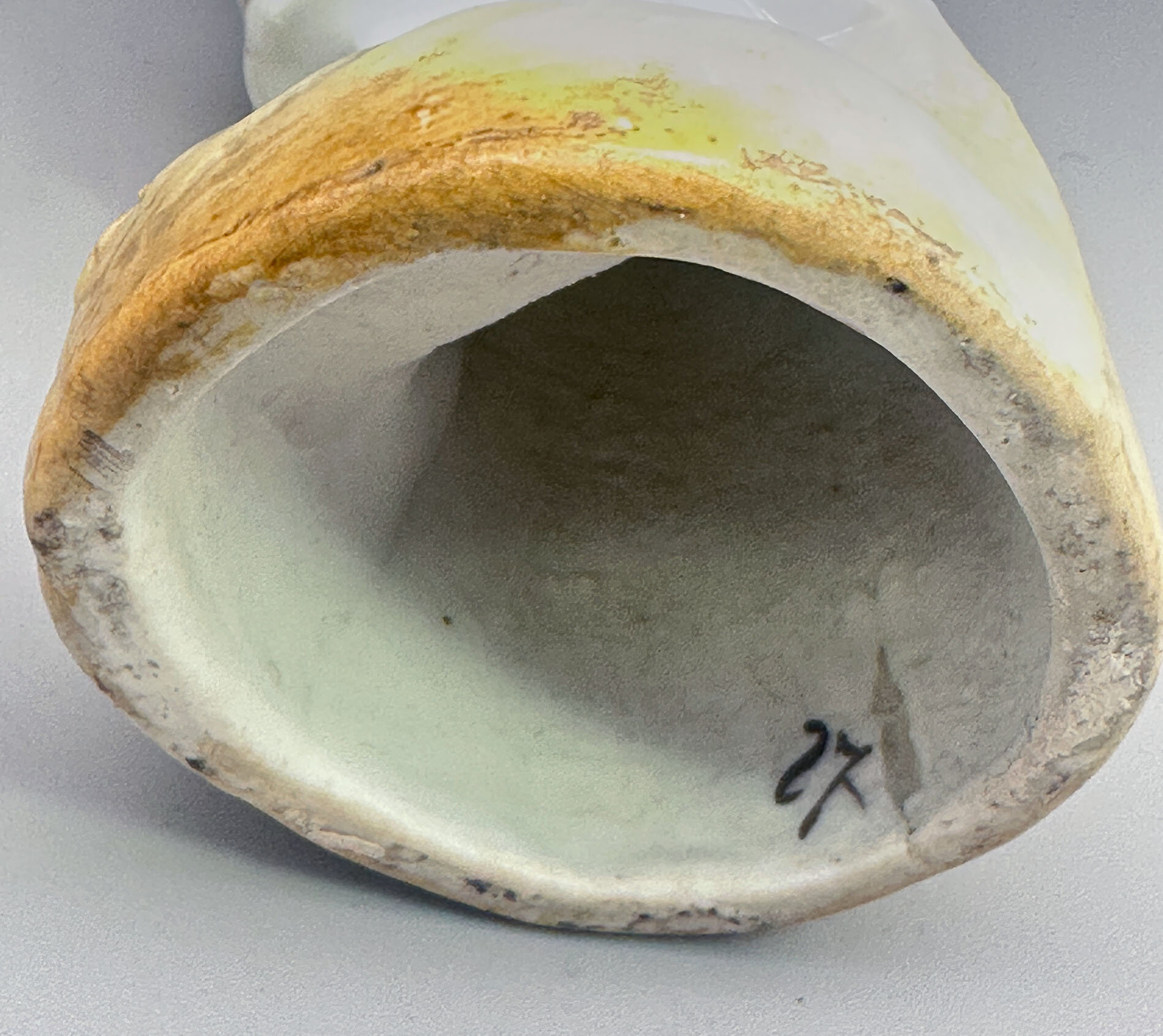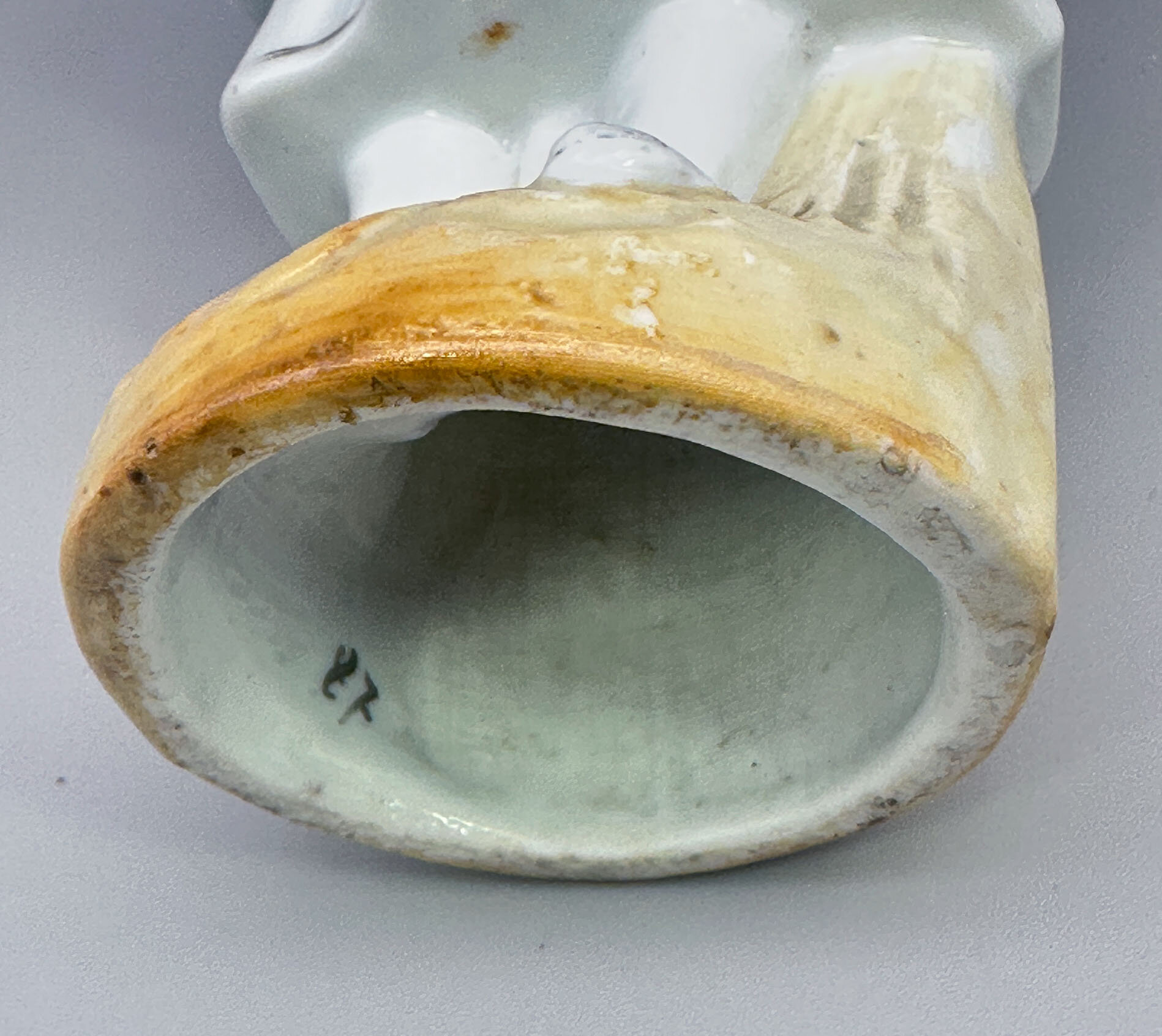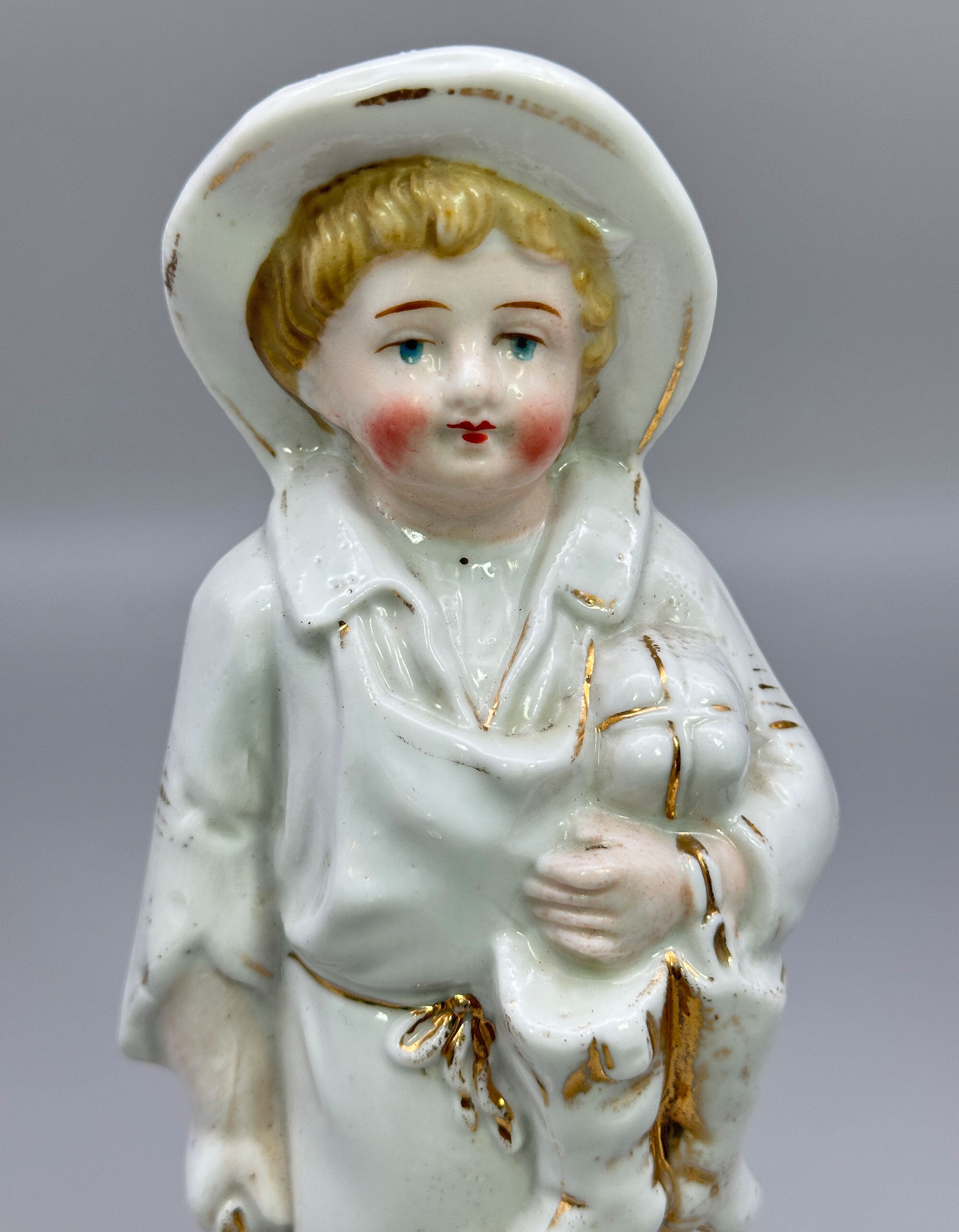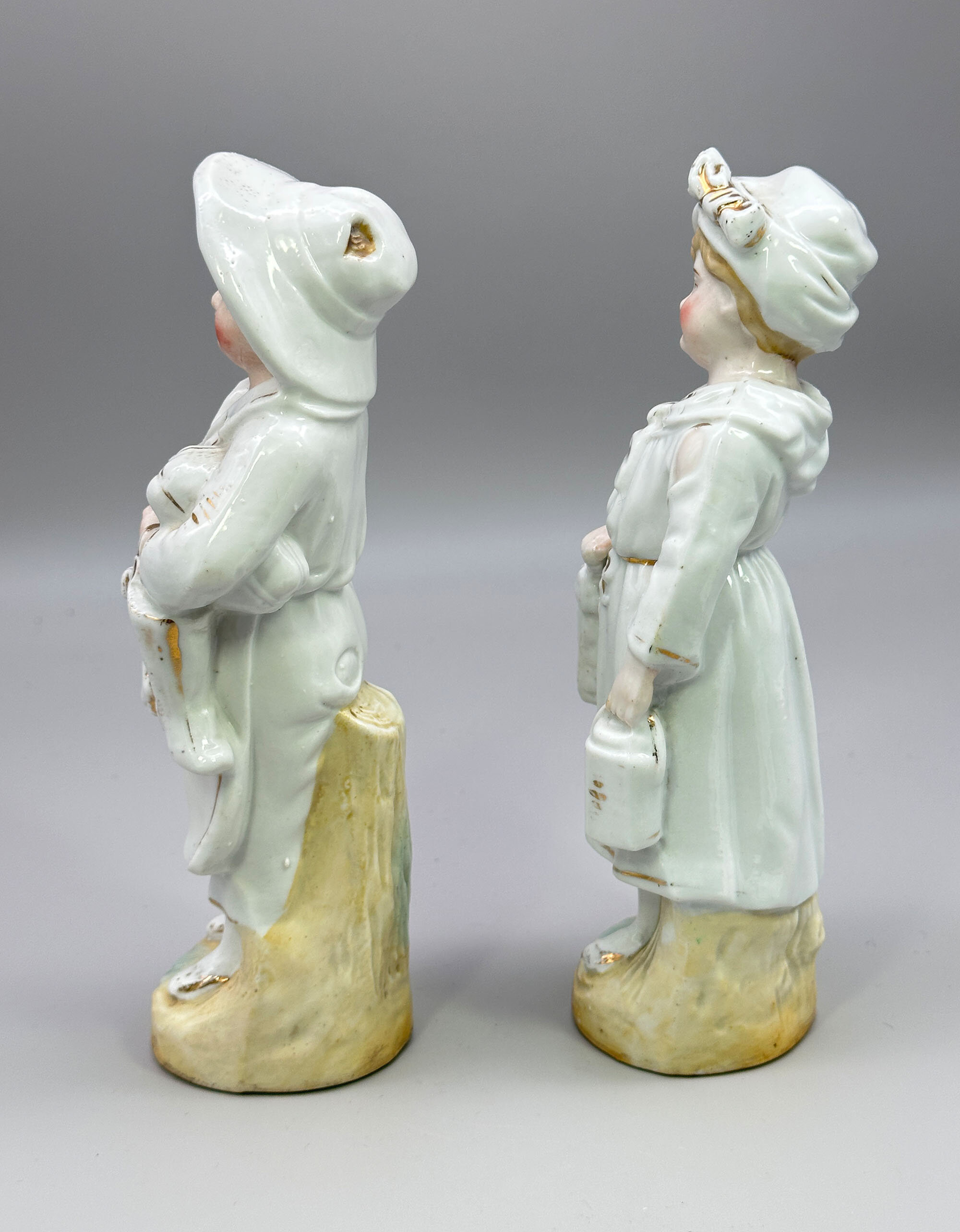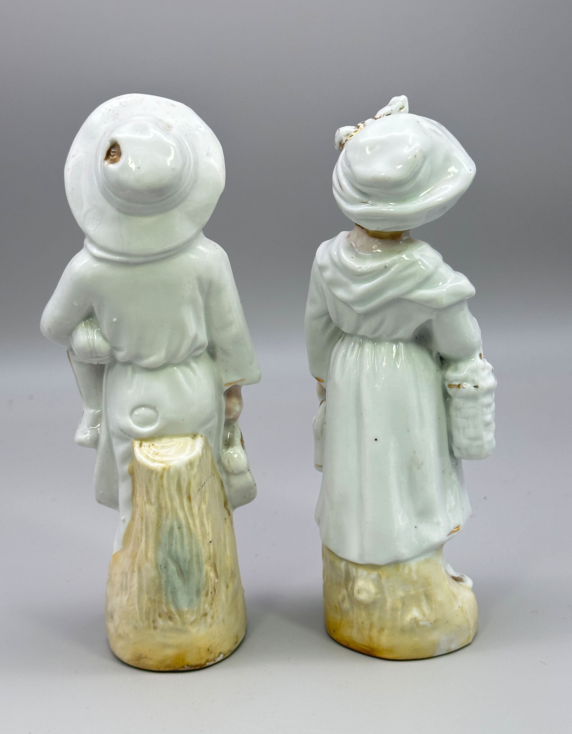 A pair of ceramic figures of a boy and a girl modelled standing on a base resembling tree stumps, both dressed in country attire, the girl carrying a basket and a bag and the boy holding boots and a scarf, the white glaze with polychrome colourings and highlights in gilt, the bases hollow with markings ‘27’. While these look superficially to be English Staffordshire, the paste of the foot and some elements of the decoration indicate continental work most likely from Germany. There are resemblances here to the figures, many of them ‘fairings’, made by Conta and Boehme in the late nineteenth and early twentieth centuries and some see the factory Heubach here, who did indeed make ceramic figures in a ‘rustic’ style but these are usually more elaborately modelled. So while German work is the most likely an exact attribution has to remain uncertain. But this young couple make an attractive pair and while intended for a late Victorian interior would not look out of place in a more modern one.| Size: | Girl : Ht (max) 18.5cm, Width (max) 6.5cm, Depth (max) 5cm Boy : Ht (max) 19cm, Width (max) 7cm, Depth (max) 5cm |