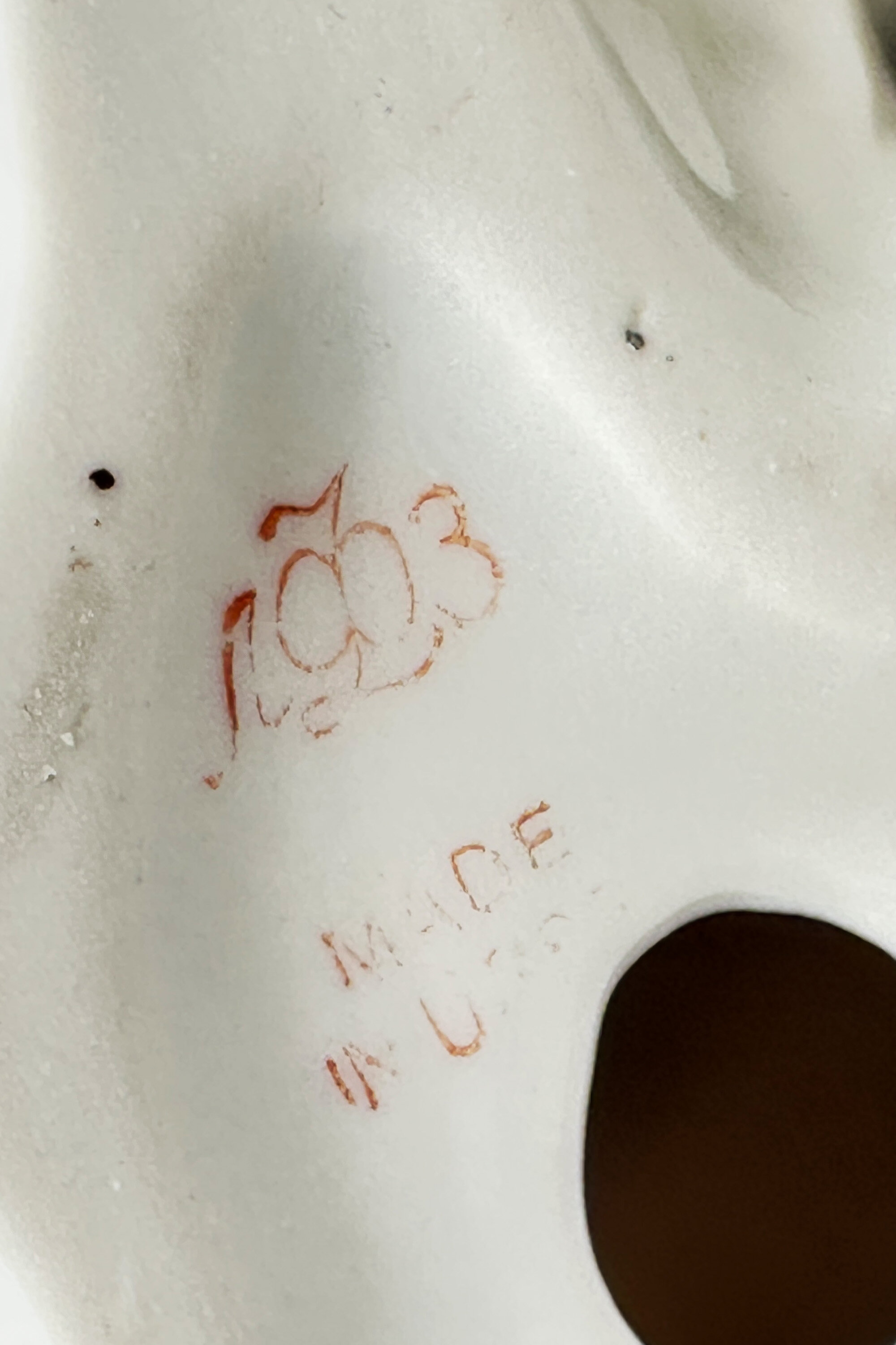 A porcelain figure of a spaniel modelled crouching with his head raised, the markings on the fur and face highlighted in black. The underside has a stamped mark in iron red which is for the Lomonosov, factory situated in St Petersburg. With a history of production spanning back to the mid eighteenth century, Lomonosov became well known for its ceramic figures of animals in the mid twentieth century, expressively modelled and brightly coloured, including tigers, giraffes and, as here, dogs. Dating here is determined by the form of the mark which was used from 1986 to 1992. Red was reserved for the best quality pieces and the mark itself is in the Russian alphabet (ЛФЗ), that is ‘LFZ’ in English which is an abbreviation of the factory name ‘Lomonosovkiy Farforoviy Zavod’. In addition are the words, rather indistinct, ‘Made in USSR’ which may imply that the piece was intended for export.| Size: | Ht (max) 14cm, Width (max) 13cm, Depth (max) 7cm |