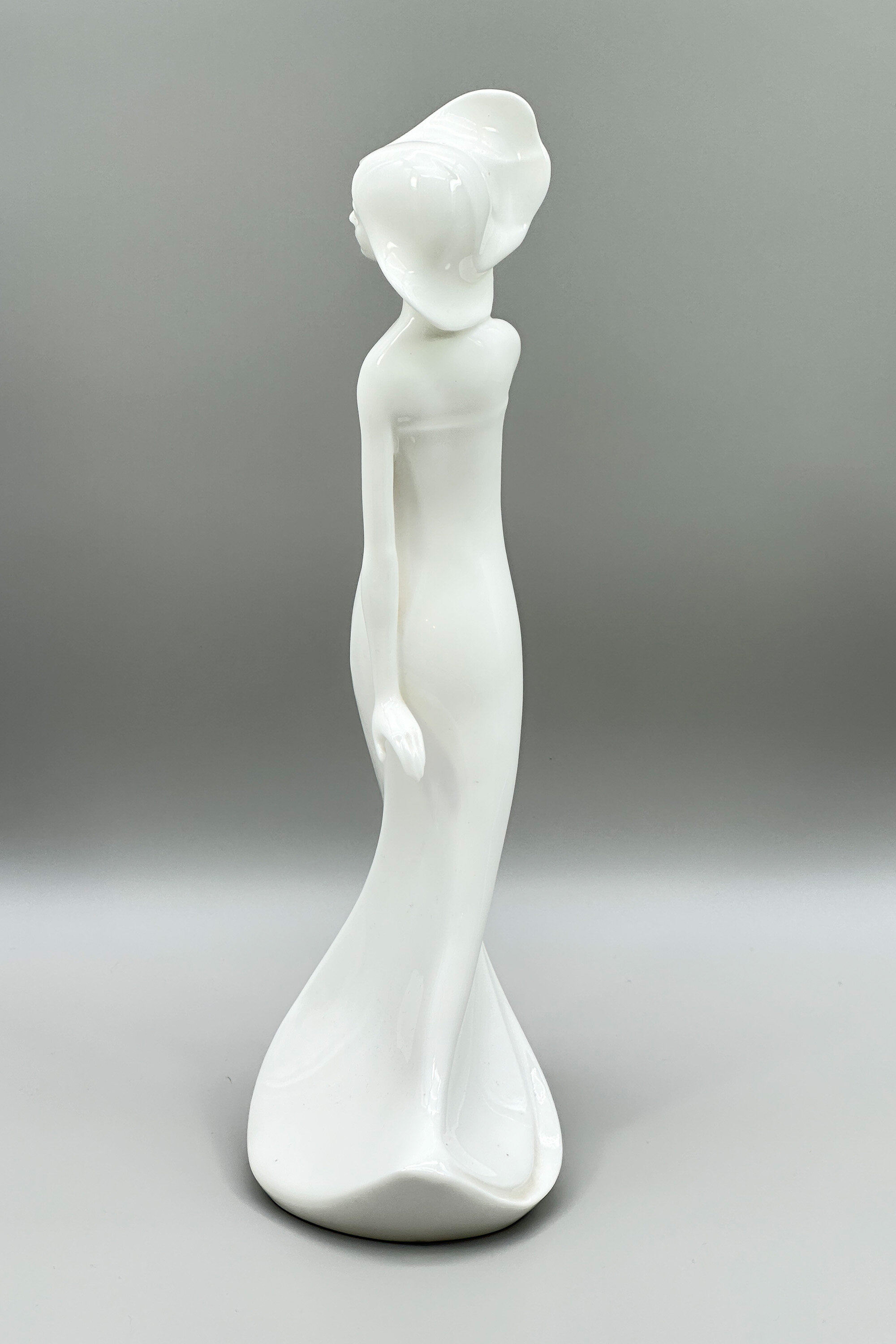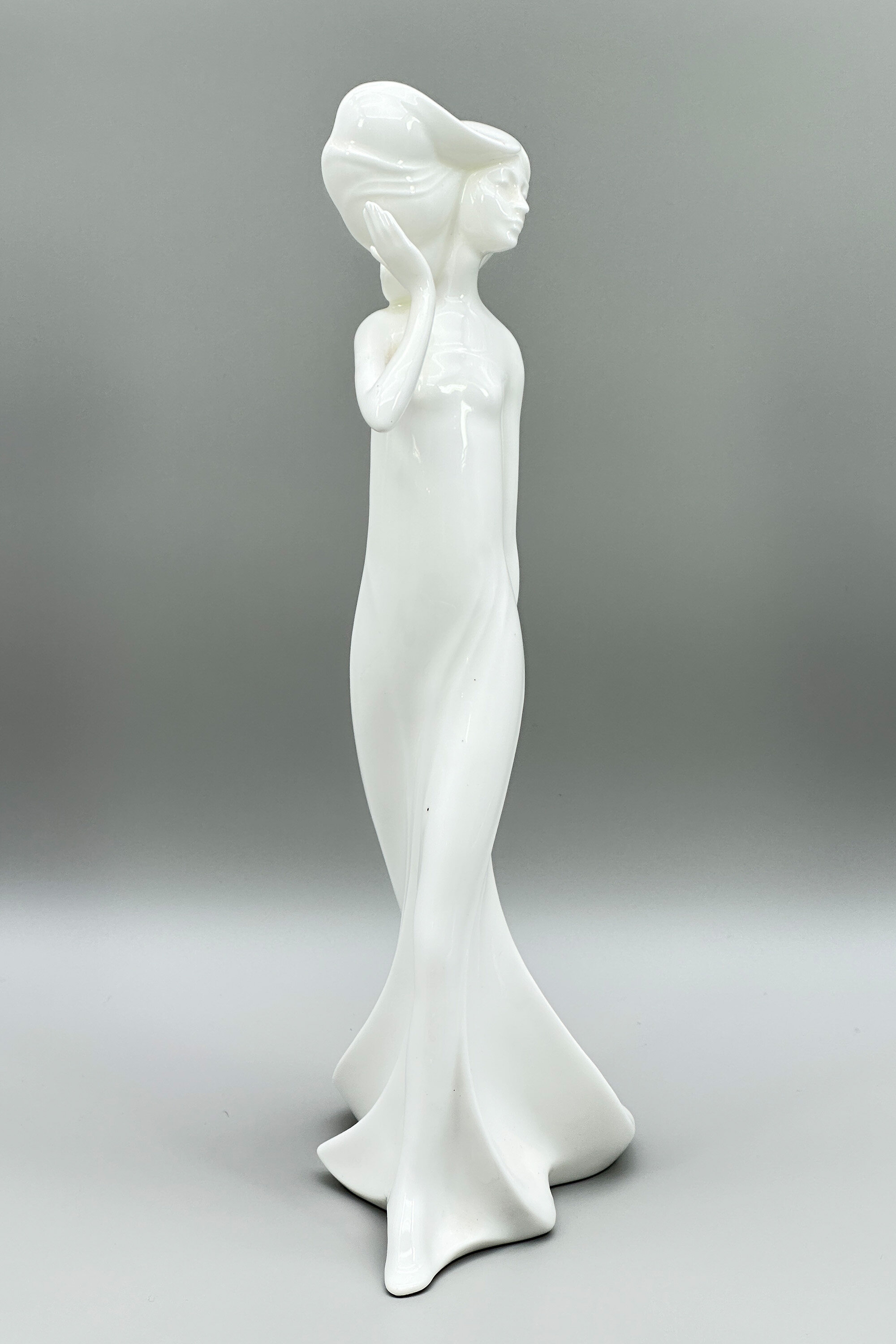 A finely modelled Art Deco style white glazed figure of a lady, her right arm raised almost in the act of catching her hat, with her wind swept robe flowing behind her. This piece comes from the ‘Images’ collection produced by Royal Doulton in the 1980s and comprising a set of figures in a contemplative style sometimes deriving from the more abstract works of Henry Moore or Barabara Hepworth. The design here, entitled ‘Carefree’, is more realistic though and the model number ‘HN 3206’ indicates that it was created by one of Doulton’s talented designers at the time, Robert Jefferson. It survives in excellent condition allowing the elegance of its composition to be appreciated today.| Size: | Ht 31cm, Width (max) 15cm, Depth (max) 9cm |