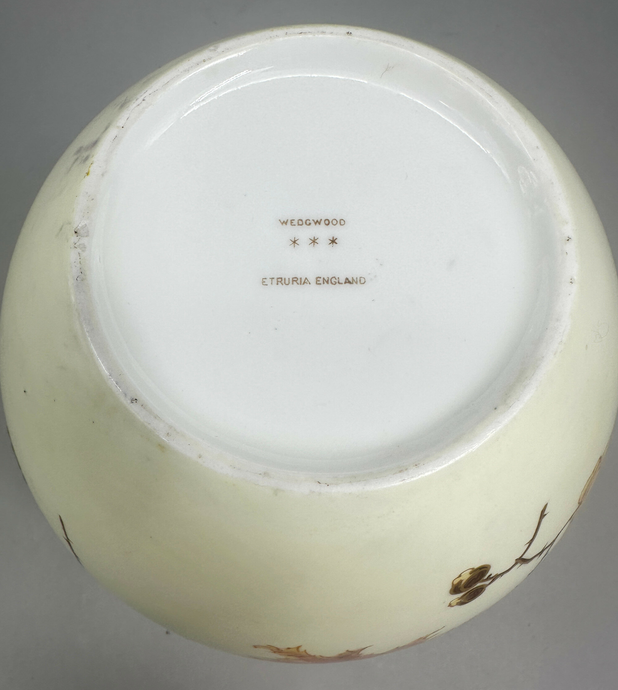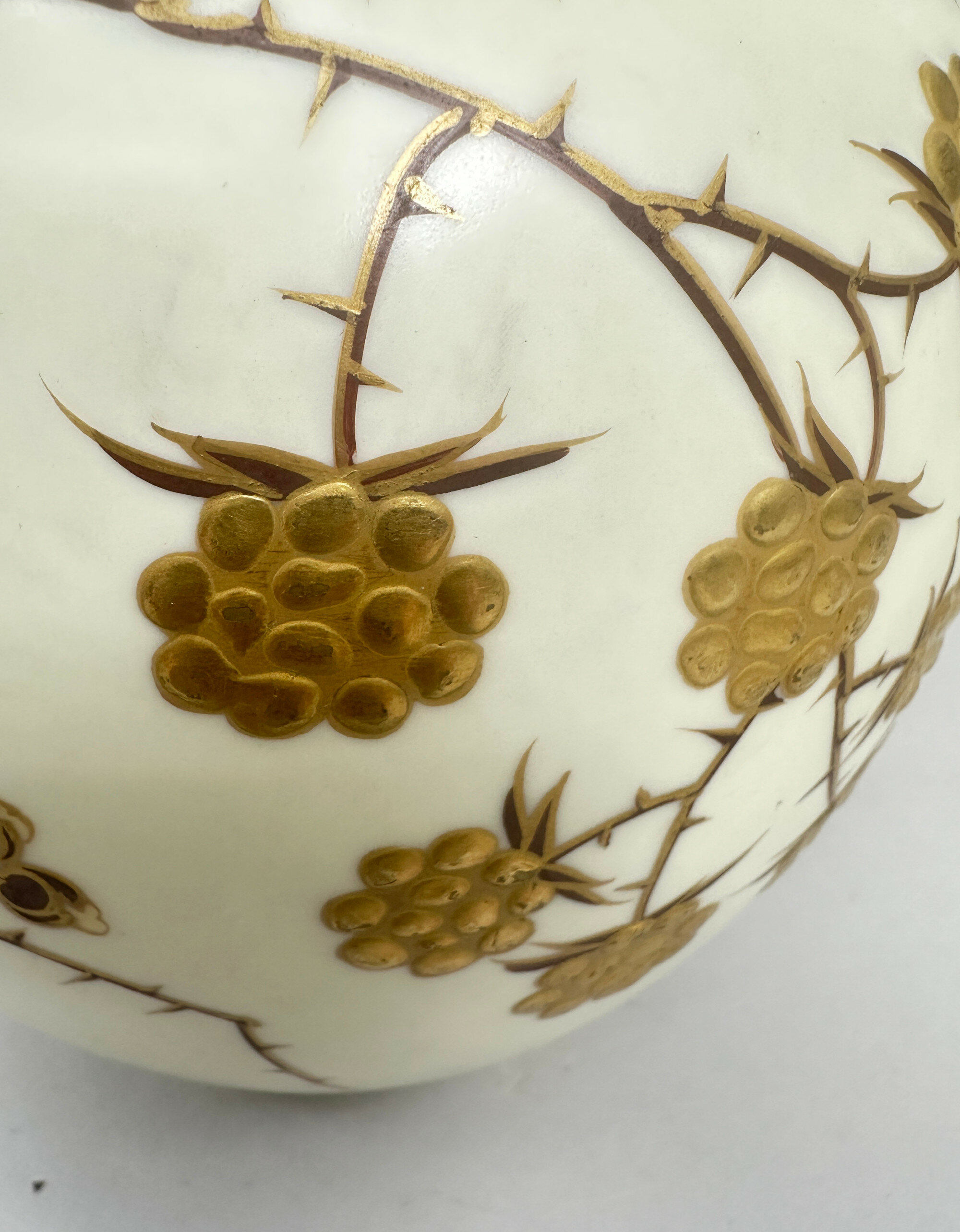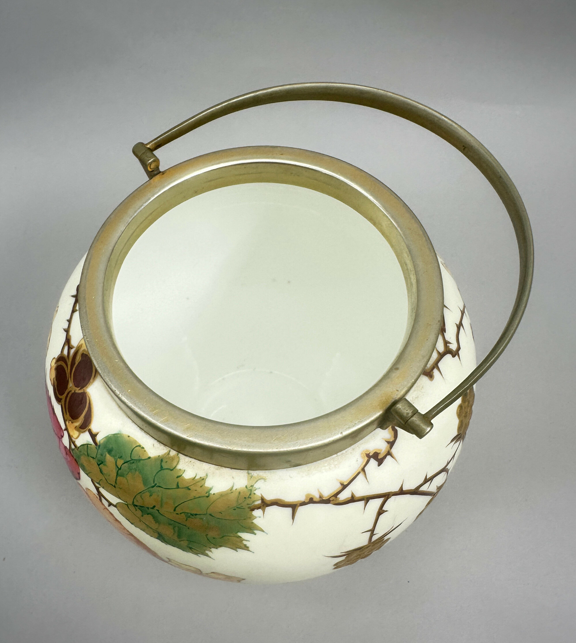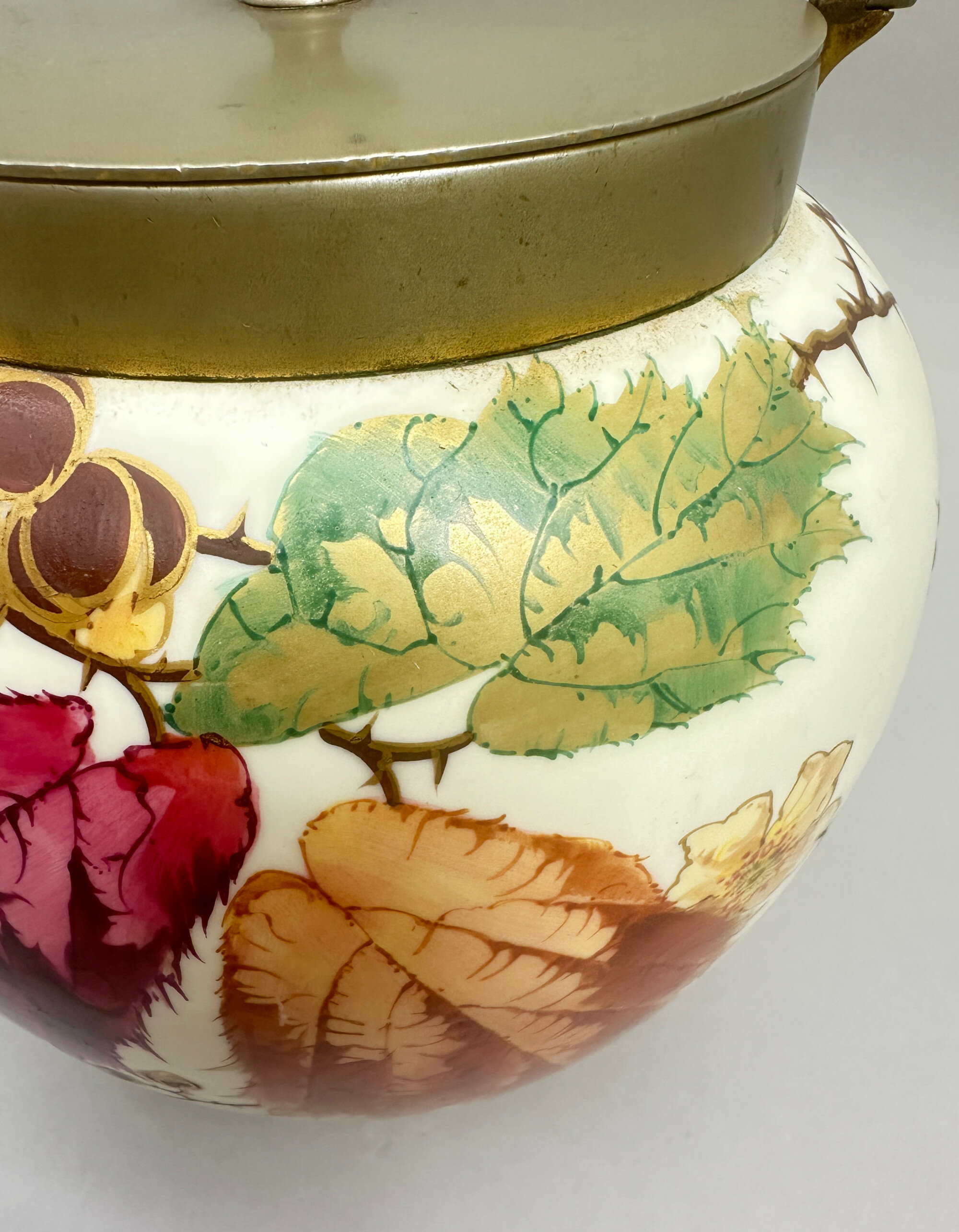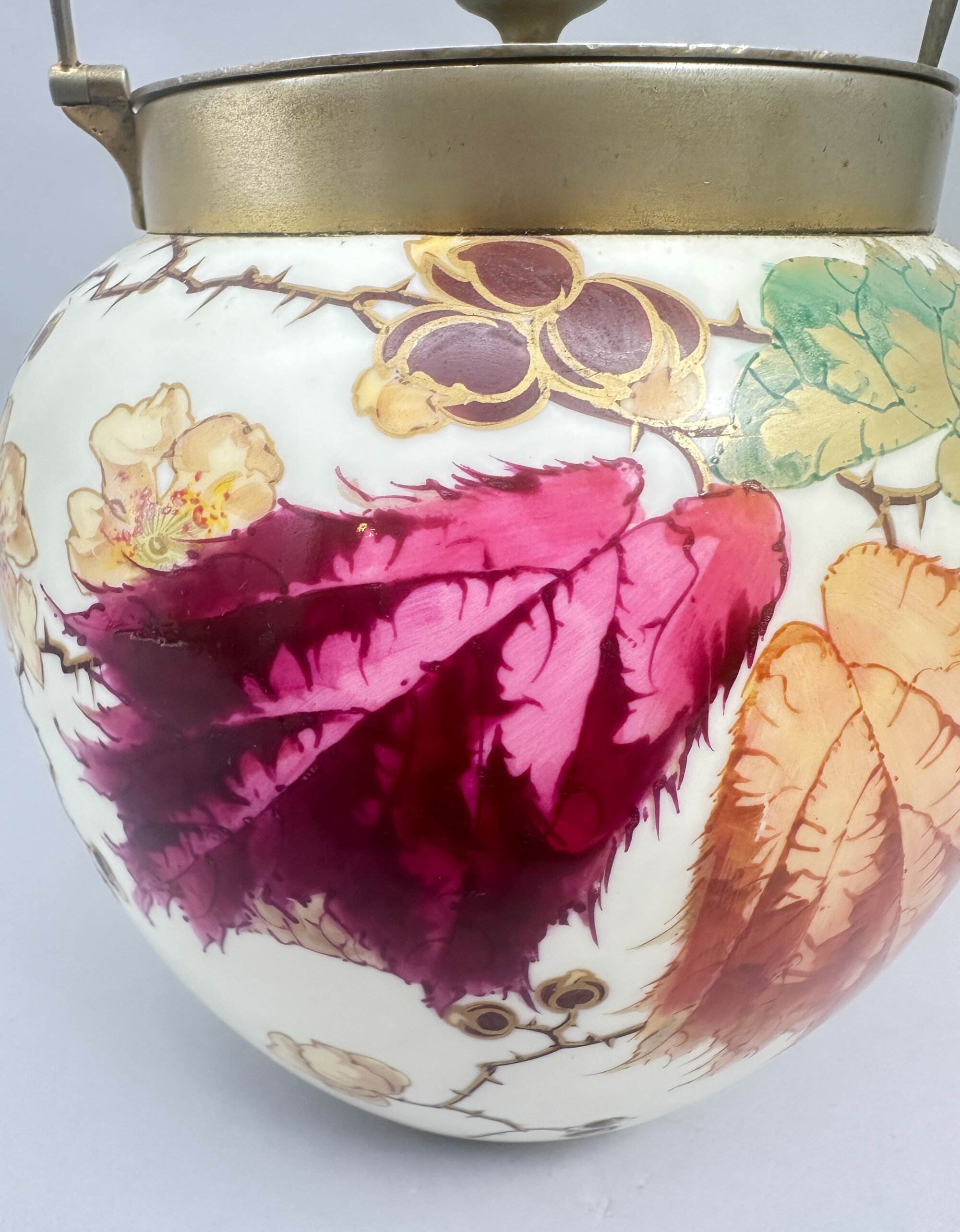 A bone china biscuit jar and cover, the globular body with a short straight neck mounted in brass with a loop handle attached and a flat flush fitting lid with a knob handle, the cream glaze richly decorated in polychrome enamels and gilt with leaves, flowers and berries, the berries with raised surface detail, the base glazed in white with stamped marks ‘WEDGWOOD’, ‘***’,‘ETRURIA ENGLAND’, and the brass lid stamped underneath 'J.W&Co' '9863' '7' .The naturalistic decoration here with its vivid and finely executed detail has elements of the Art Nouveau style to it and this is consistent with the format of the mark. The Wedgwood factory needs little introduction. Founded by Josiah Wedgwood in 1769 in Stoke-on-Trent, England and named after the Italian Etruria region to reflect its neoclassical designs, it rapidly became famous for its stoneware designs in the classical style but ceramic tablewares were produced as well and this biscuit barrel is a good example of the high quality wares produced in the early twentieth century. The inclusion of ‘ENGLAND’ indicates a dating after 1891 and the addition of three stars occurs after 1900 suggesting that this piece was made in the early 1900s The rather grand design is in keeping with the opulence of the Edwardian era and survives in excellent condition with the brass metal fittings undamaged and intact.