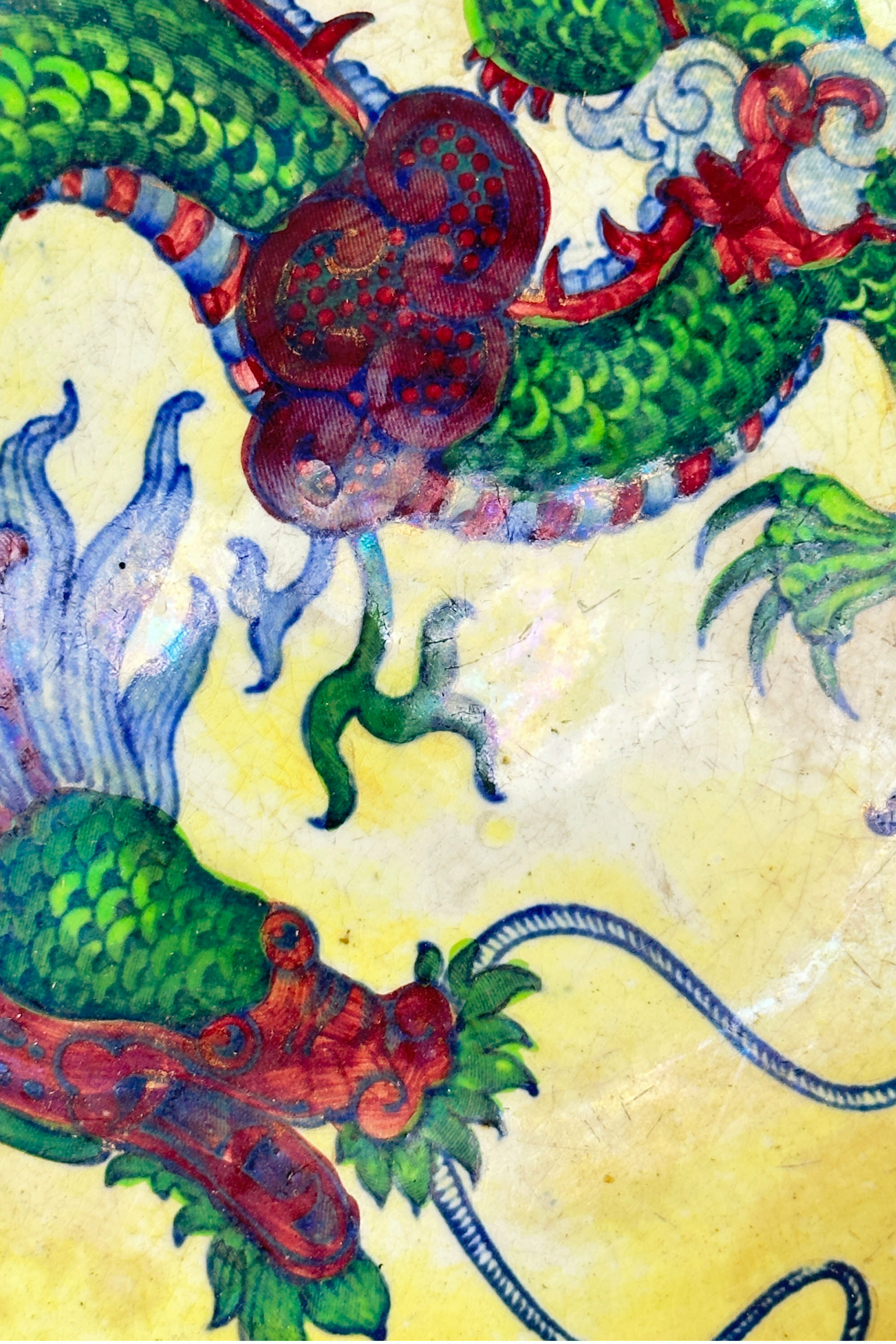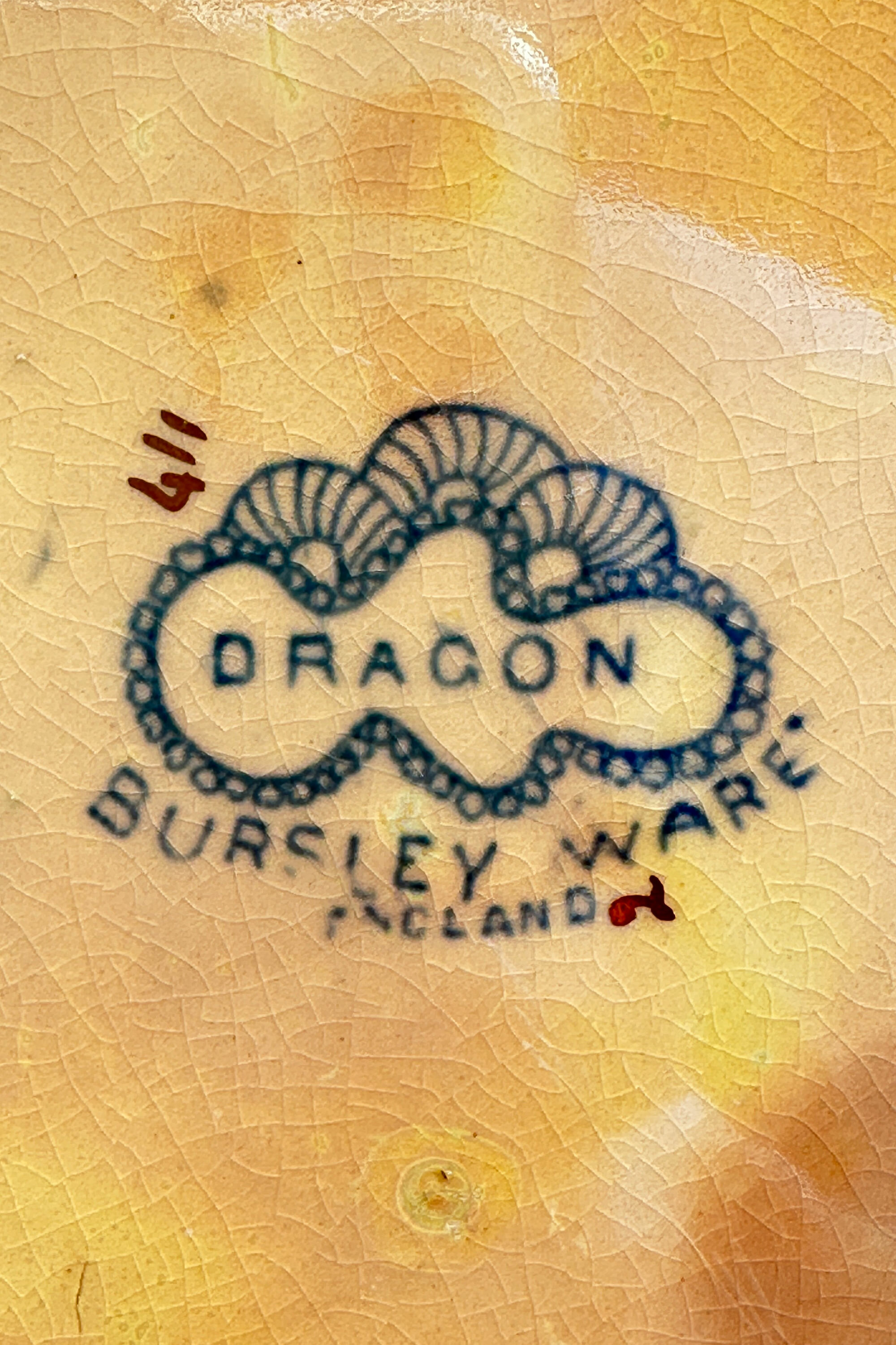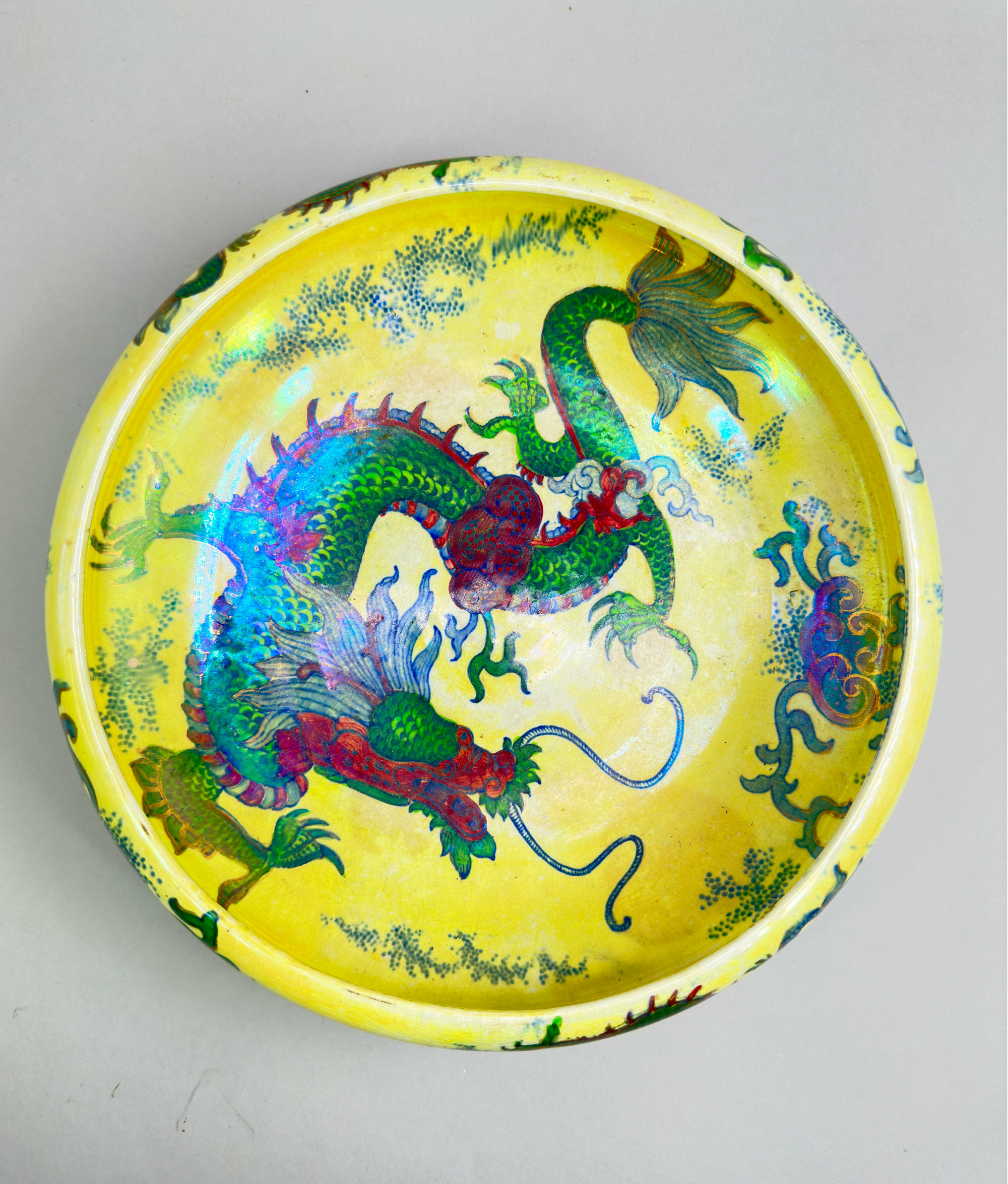 A shallow ceramic bowl of squat form with a turnover rim, resembling a Chinese brushwasher, the yellow lustre glaze with a feint craquelure and boldly decorated with an interior design of a dragon pursuing the flaming pearl amidst seaweed, the exterior with two similar dragons, all coloured in bright shades of red and green with the outline design in blue, the base glazed and with the mark ‘Dragon’ within a rococo style border and the manufacturer’s name ‘Bursley Ware England’. From 1910 to 1982, the firm Wood and Sons Ltd operated potteries at the Trent, New Wharf and Stanley Potteries Burslem. Throughout its history the firm produced high quality earthenware pieces aimed at the middle market, using a variety of brand names including Bursley Ware. Frederick Alfred Rhead, the Father of Charlotte Rhead, was a ceramicist and designer who worked for Bursley Ware in the 1920s and 1930s. The ‘Dragon’ pattern is one of his best known designs and was made in a variety of forms and colours including white and orange. The yellow glaze here is particularly effective and the piece combines Chinese inspired designs with an Art Deco twist to produce an object with decorative appeal even today.