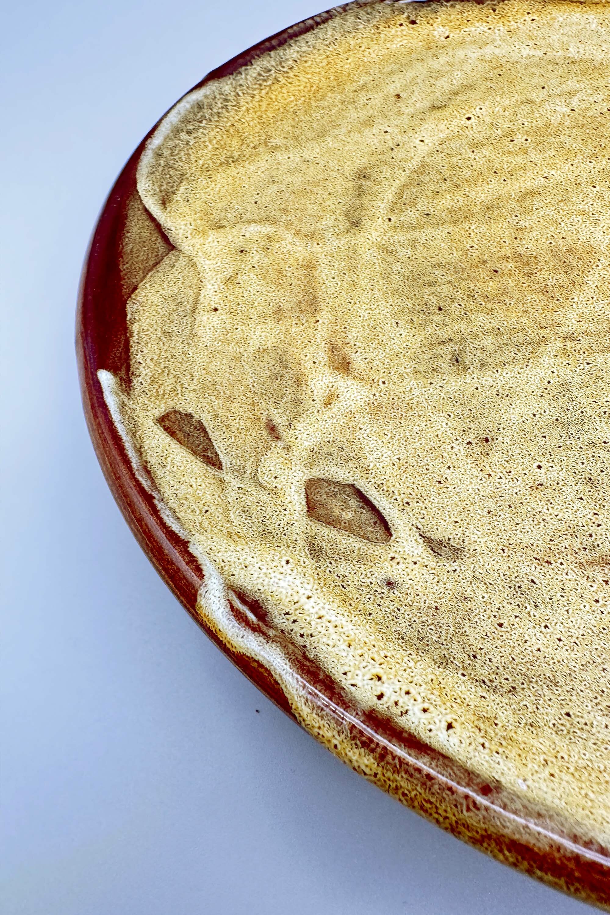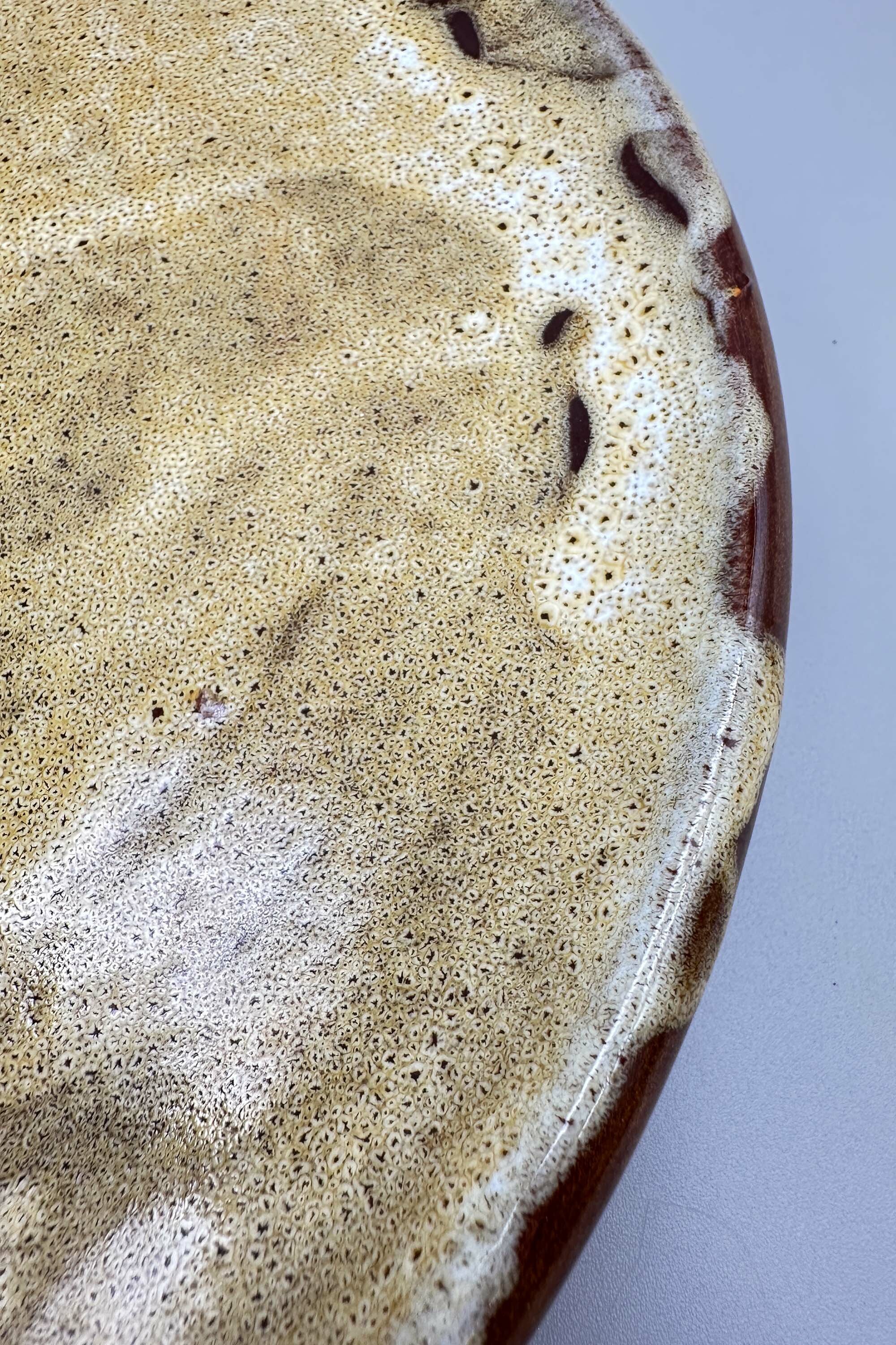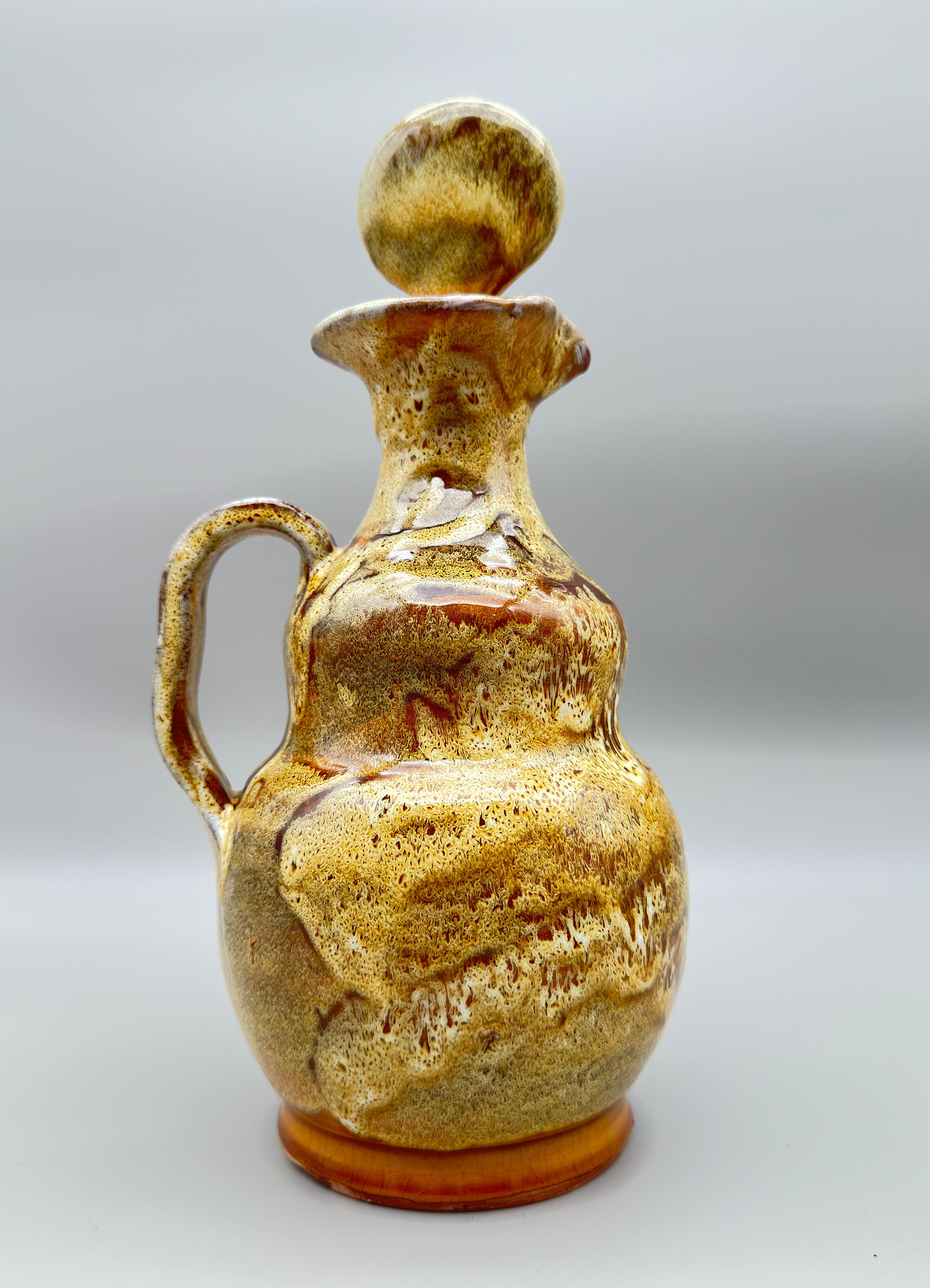There are many items to be found with the Bongiovanni mark, usually a flowing ‘FB’ as here, but sometimes his first name, Francis, is written followed by ‘B’ and some pieces, probably the later ones, have an impressed script mark ‘F Bongiovanni’. Usually there is an impressed mark for Vallauris as well, which again occurs here. Little is known about him but much of his output comprised jugs and dishes although various serving sets were also produced including ones for tea and even fondue. The liqueur service seems to be the rarest of these and complete sets in perfect condition are not often found. The jug is almost double gourd in form with a flat circular stopper terminating in a cork which suggests its use for liqueur or spirits which would require an airtight seal. The thick glaze employs a variety of ‘splash’ effects in tones of mustard and brown with speckling in addition, a complex mixture to achieve. It trickles down unevenly towards the base, revealing the terracotta clay of the body which is also seen on the foot rim. The interior of the base is glazed and has a stamped mark ‘Vallauris’ with the initials ‘F’ ‘B’ boldly written in black. The six cups, with broad ovoid bodies and flaring rims, complement the form of the jug and the set is completed by the circular tray, glazed at the back apart from the foot rim and similarly marked as the jug. Both the cups and the tray also employ similar glaze effects with the distinctive speckling.
