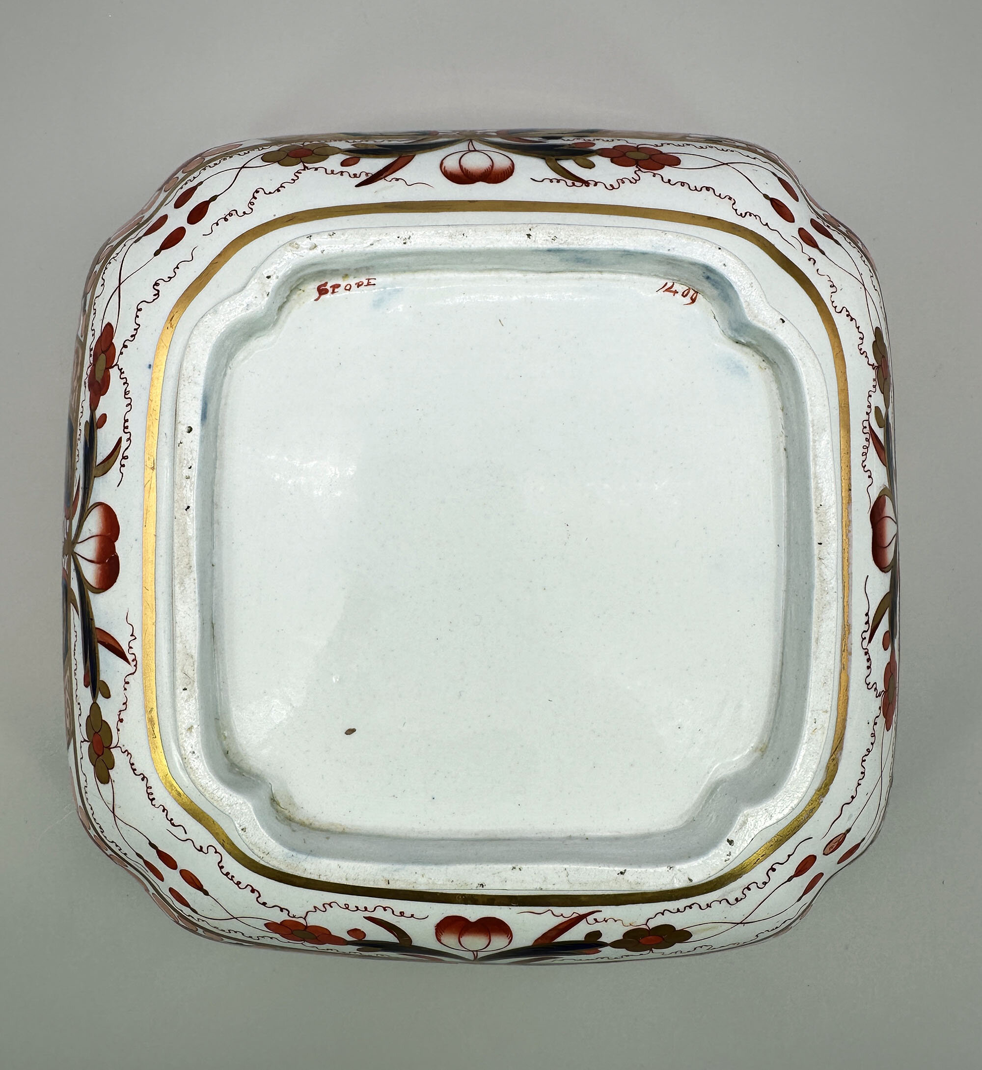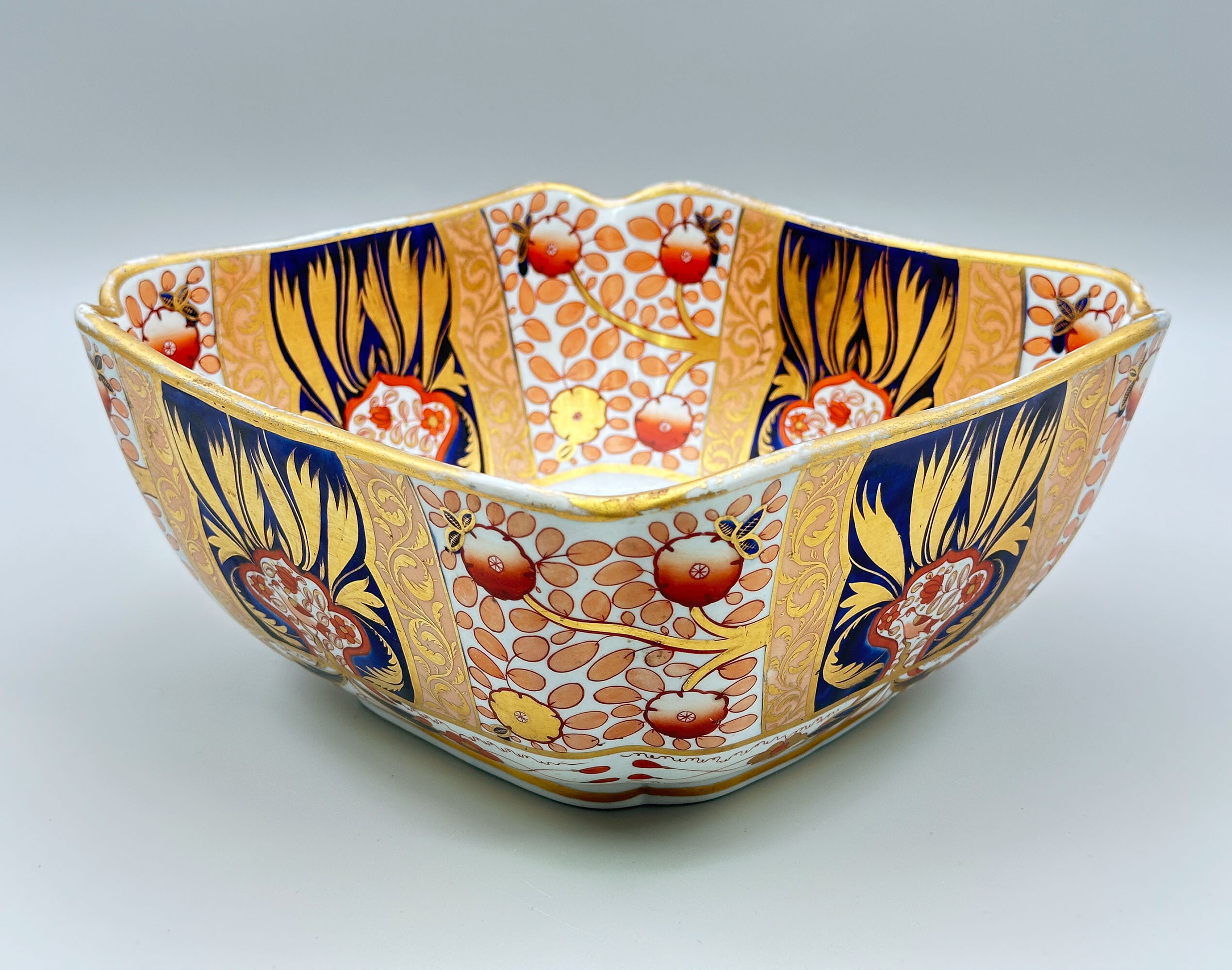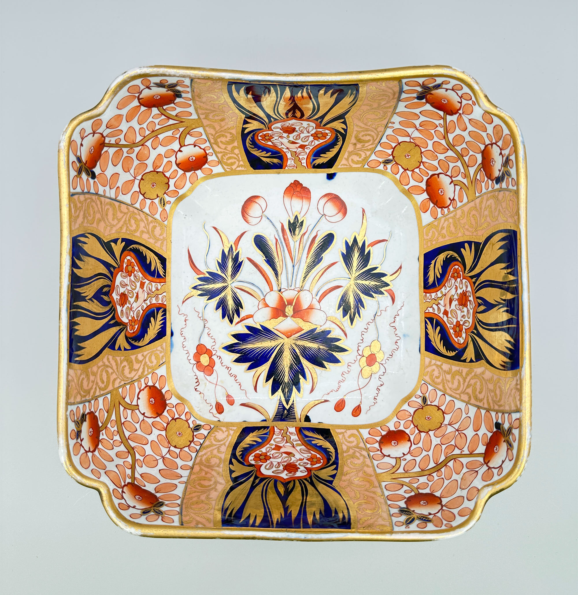The square form bowl, indented at the corners and curving inwards towards the base, was a classic Chinese form and is usually referred to as a salad bowl. The standard Chinese dinner service would have had a pair of these, but the shape is rarely found in the English dinner wares made in imitation. Its occurrence here combined with a firmly dateable early nineteenth century pattern in an opulent design which has survived in a remarkable state of preservation makes this very much a ‘one off’ piece and a highly desirable addition to a collection of nineteenth century decorative ceramics.