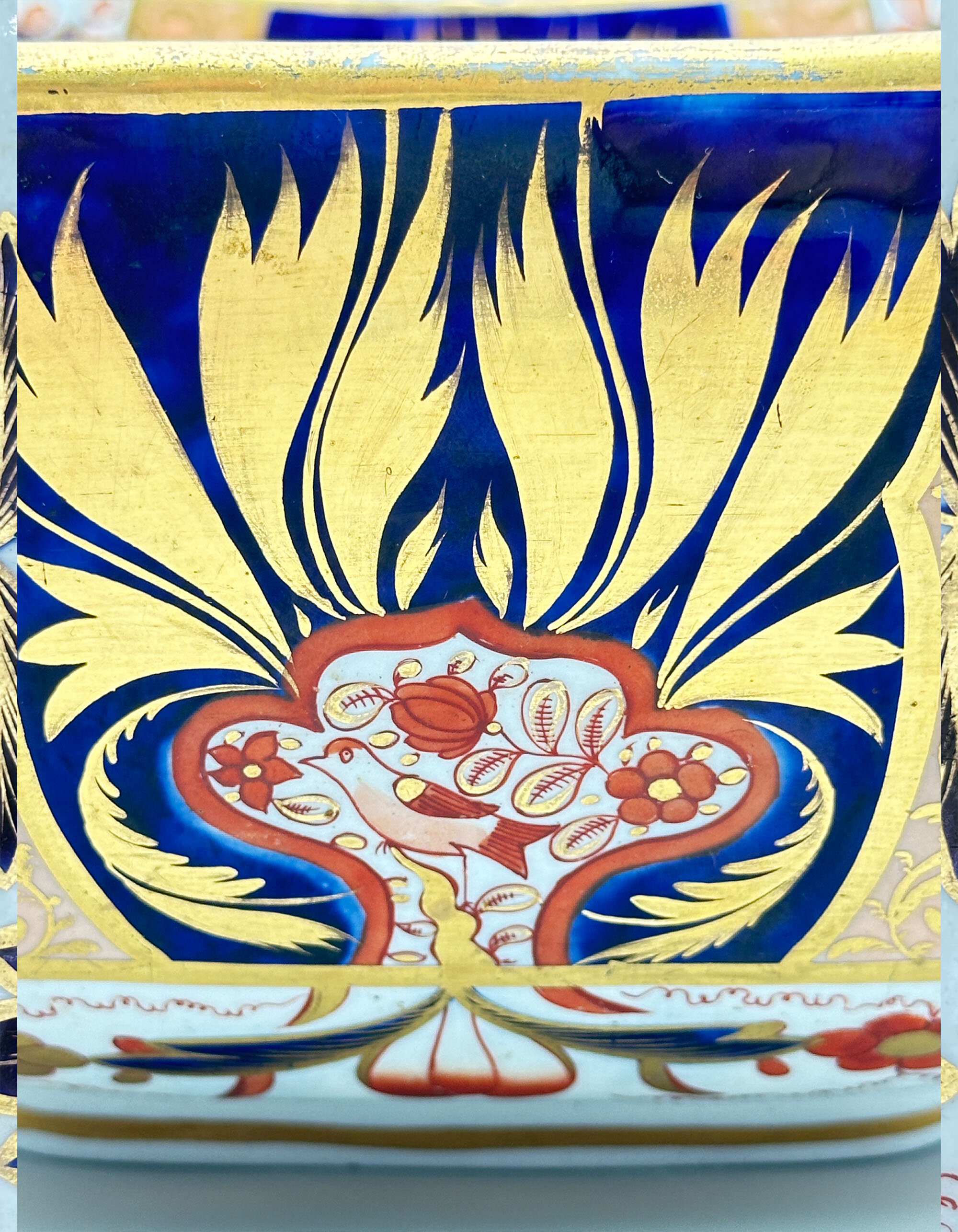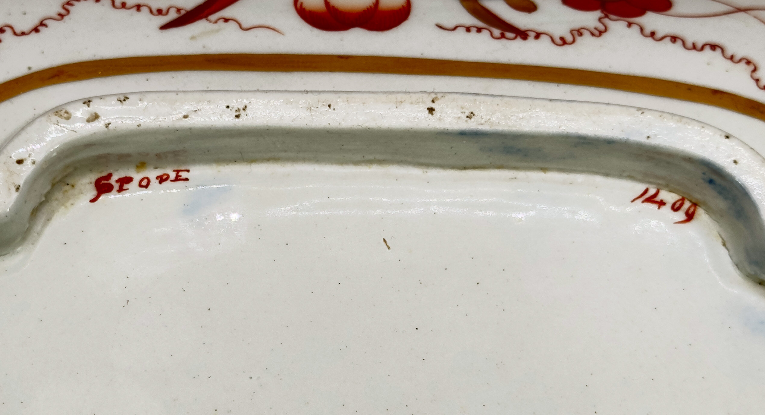 Spode is one of the great names amongst the English potteries of the eighteenth and nineteenth centuries. Founded by Josiah Spode in 1770 it saw under his leadership the development of innovatory techniques for transfer decoration onto earthenware and the production of bone china. But there was another important invention which was introduced by Josiah’s son, Josiah II, who took over the running of the firm after the death of his father in 1797. ‘The Times’ in 1817 referred to a range of ceramics now produced by the firm called ‘Stone China’ which it described as ‘newly invented’. There is some mystery about this. The technique of producing ‘stone china’ was invented by the sons of the Staffordshire potter John Turner and by repute Josiah Spode II bought their patent in 1805 when they went bankrupt. This conflicts with the reference in ‘The Times’ and according to Leonard Whiter in his authoritative book on Spode, examples of the ware decorated with patterns introduced before 1813, when it began to be manufactured in volume, ‘are rare in the extreme. I can recall seeing only one – a magnificent service in the freehand Imari-style pattern, 1409, introduced c1810’ (Leonard Whiter : Spode p191).The bowl featured here is indeed marked ‘1409’ (see image 8) alongside a form of the name ‘Spode’ which dates to before 1821 (Leonard Whiter : Spode p224). It most likely derives from the service which Whiter once saw complete but has now, presumably, been dispersed. The pattern with its vivid palette of red, blue and gold and floral decoration is a lavish reinterpretation of the ‘Imari’ wares which had been exported to the West in great quantities by the Chinese in the eighteenth century and the Japanese before them. These pieces took their name from their port of export in Japan, Imari; they were actually made at Arita in the former Hizen province. Amongst the wares exported by the Chinese were extensive dinner services and their popularity caused them to be copied and imitated by many of the English potteries from early 1800s onwards, indeed a near identical and contemporary version of this pattern was produced by Coalport.