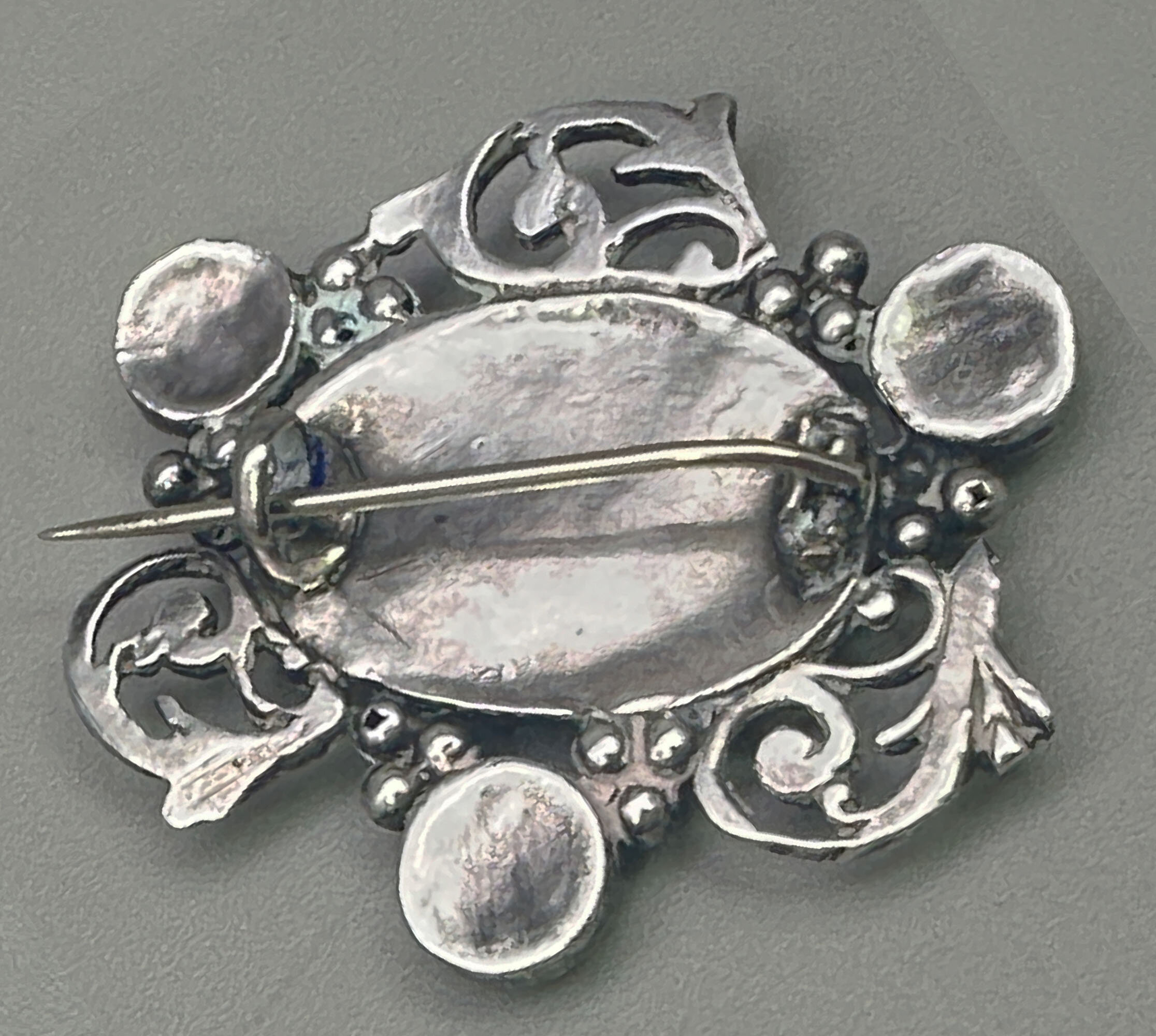 This is a very lovely good sized silver brooch with a fleur de lis and grape design that is very typical Arts and Crafts. It is set with a large central carnelian stone surounded with coque de perle stones. It is unmarket| Size: | 39 x 35.6 mm |