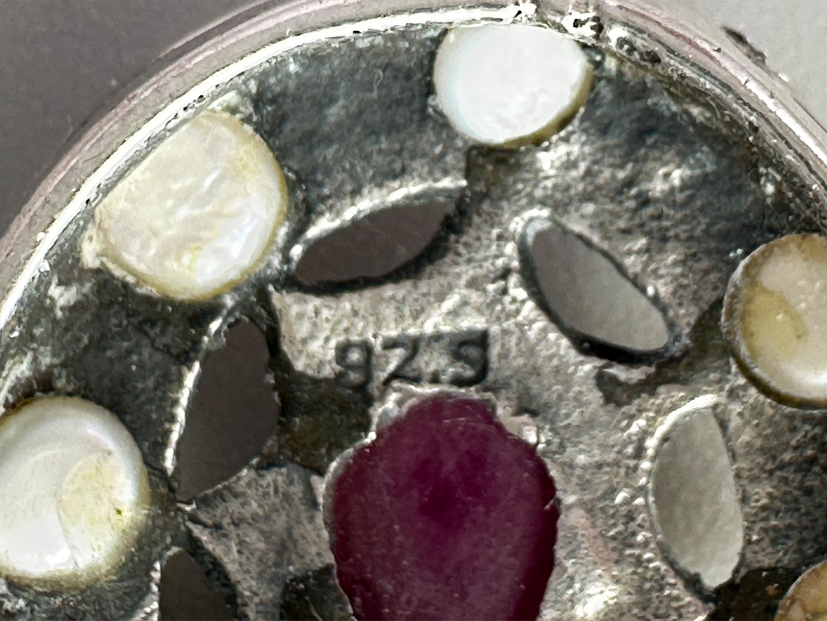 These are a wonderful pair of earrings that are in a shield design. These are set with ruby cabachons and freshwater cut pearls. They are marked 925.| Size: | 22.5 x 20.6 mm |